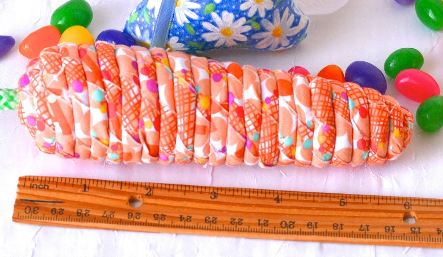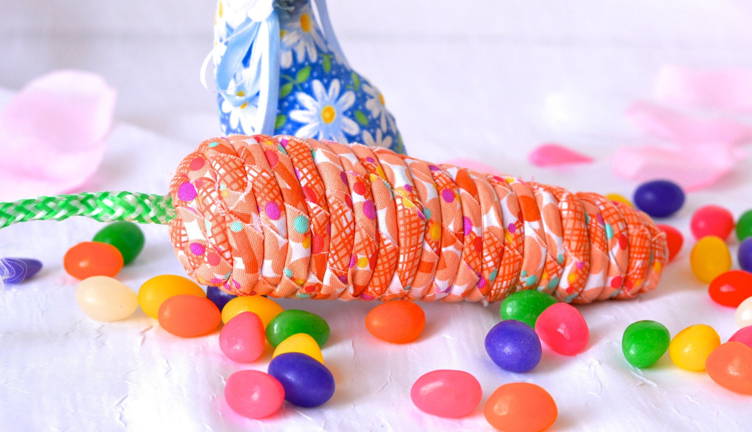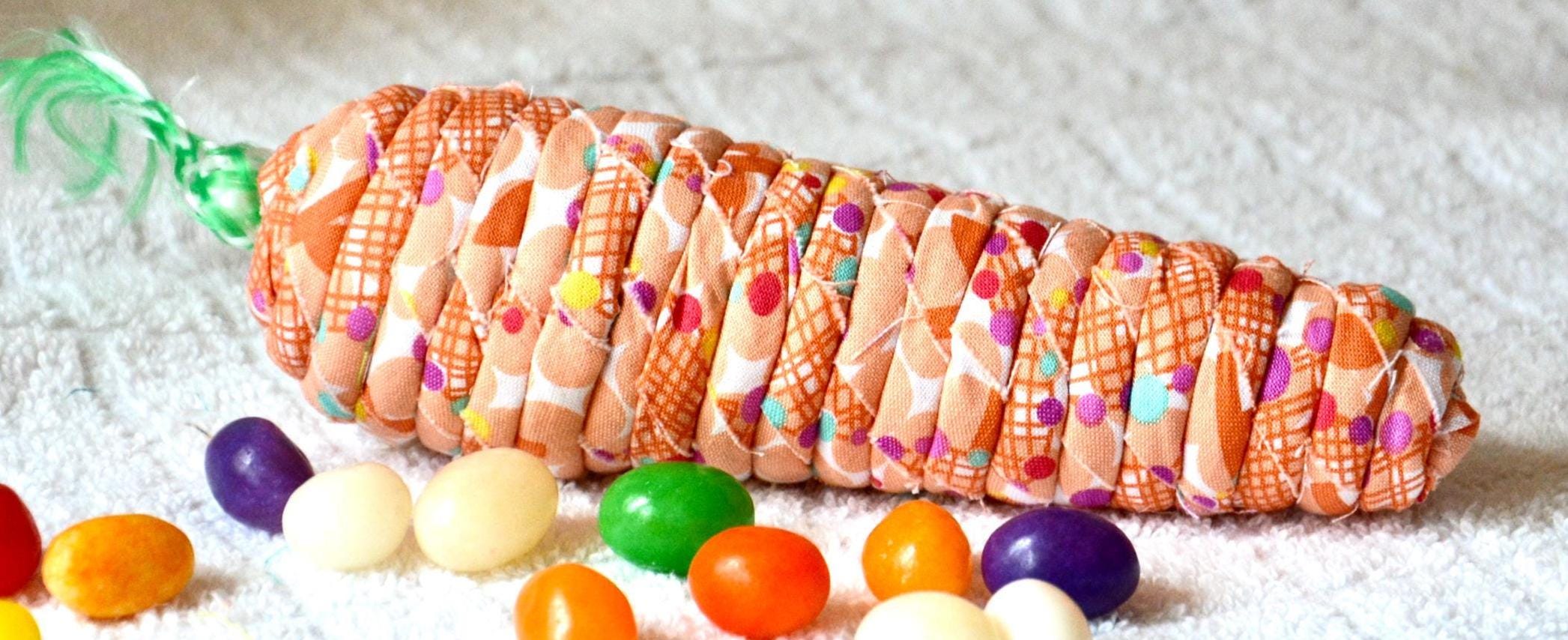 I hand wrapped this cute orange dot fabric around cotton line which I than hand coiled into a fun carrot shape. The fabric edge is unfinished for a lovely shabby chic fray texture. Color placement will vary. Carrot does not open. Great for Easter Egg Hunt Toy! Whimsical Easter decor!