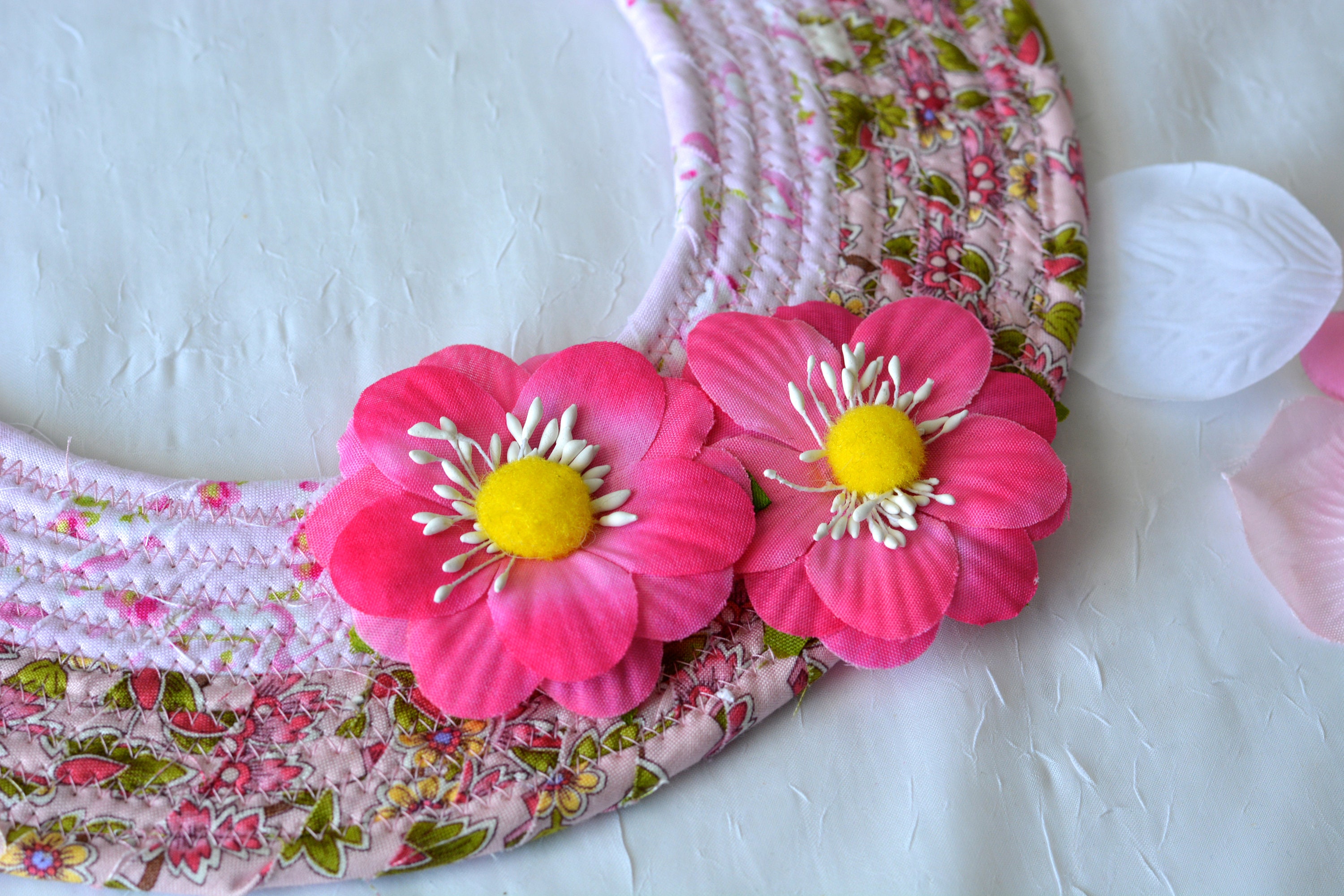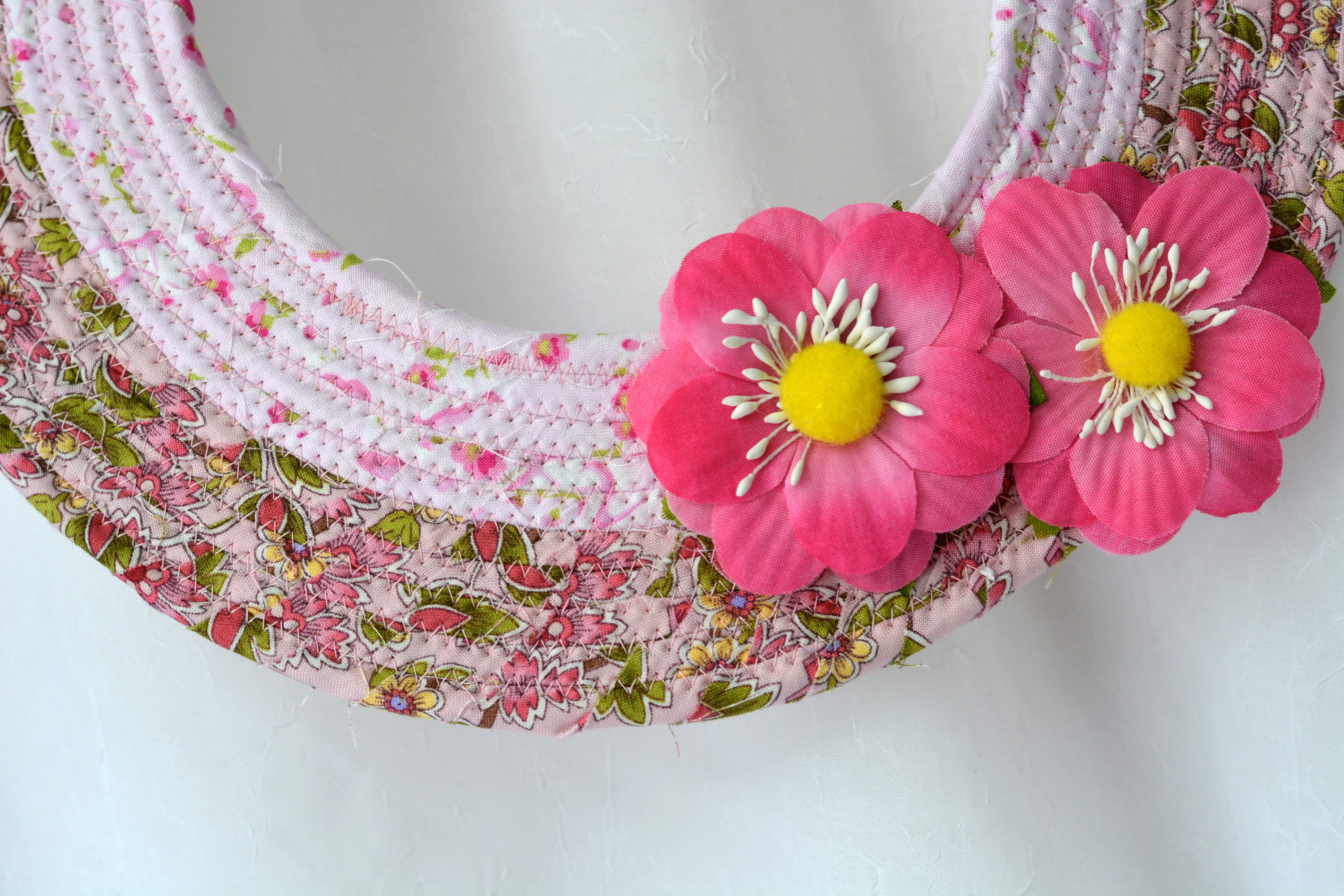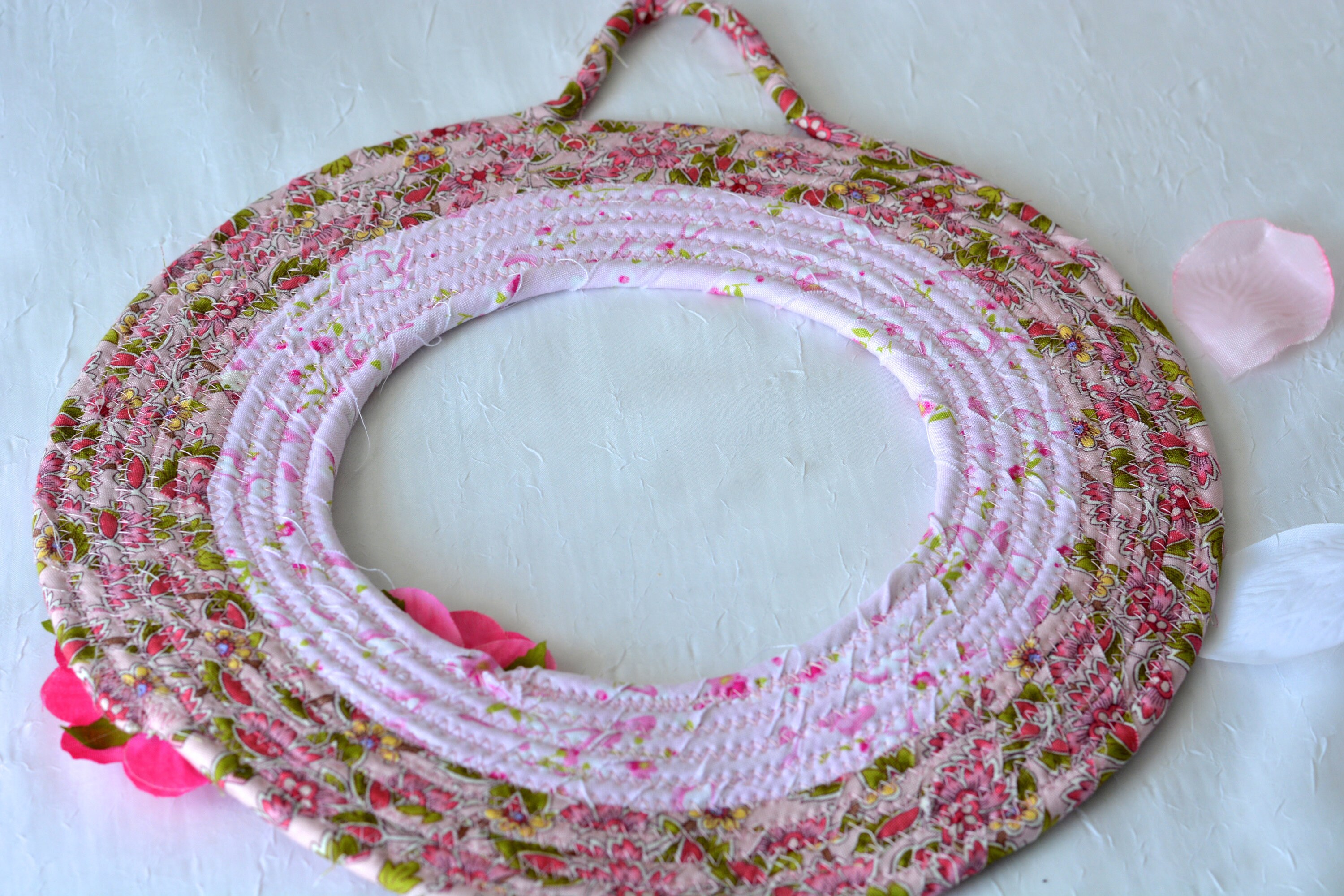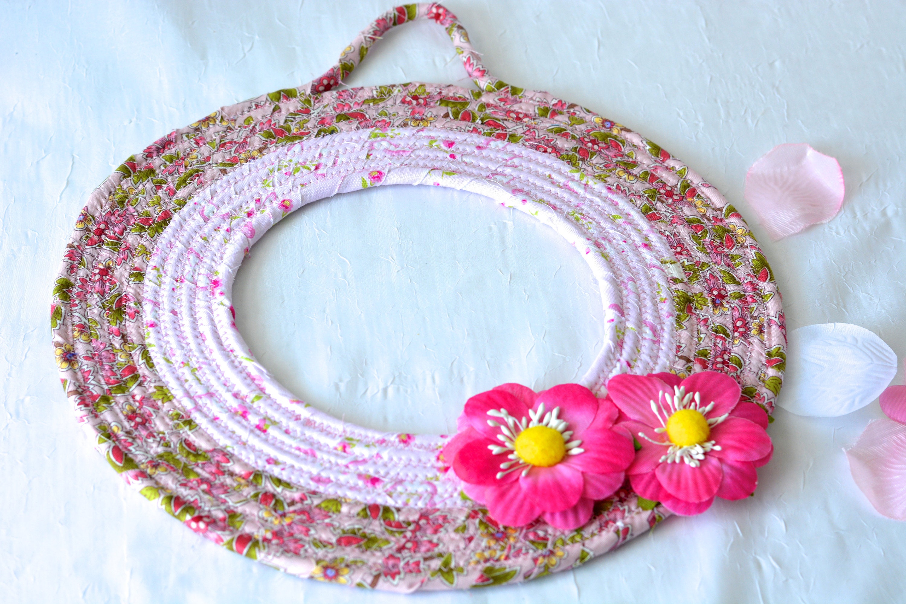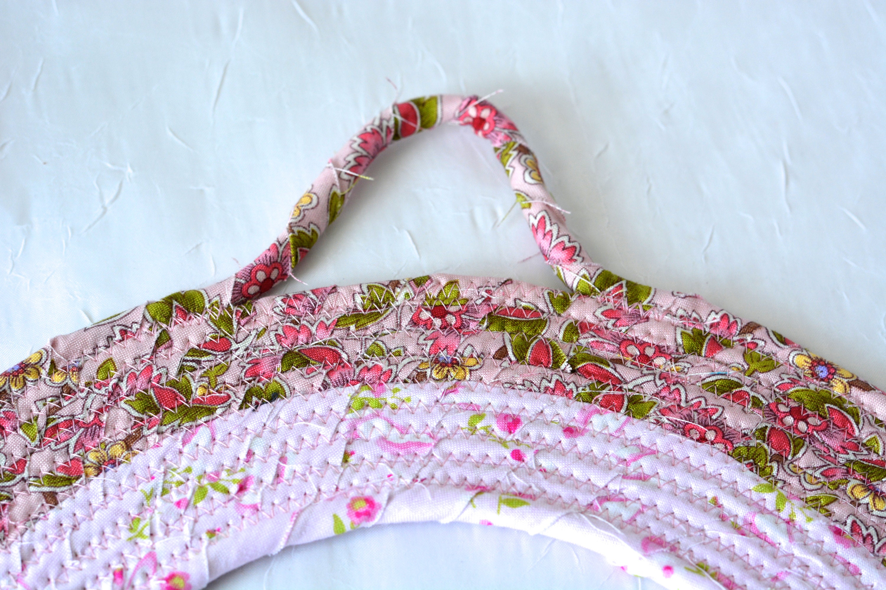 I hand wrapped these pretty floral fabrics around cotton line, which I then hand coiled and machine quilted to make it sturdy. I used the raw edge technique with a little fray adding a nice shabby chic texture. 100% cotton fabric! The pattern created is so unique! OOAK!
