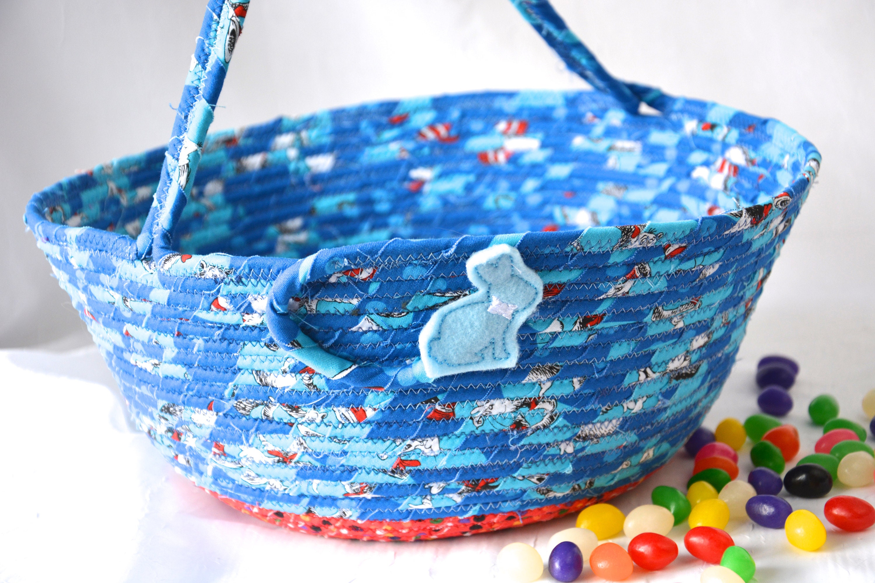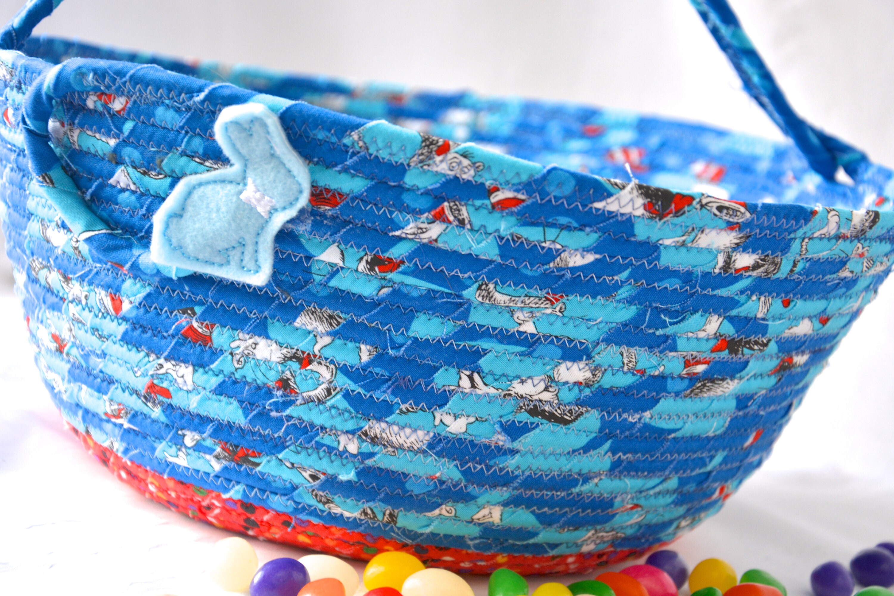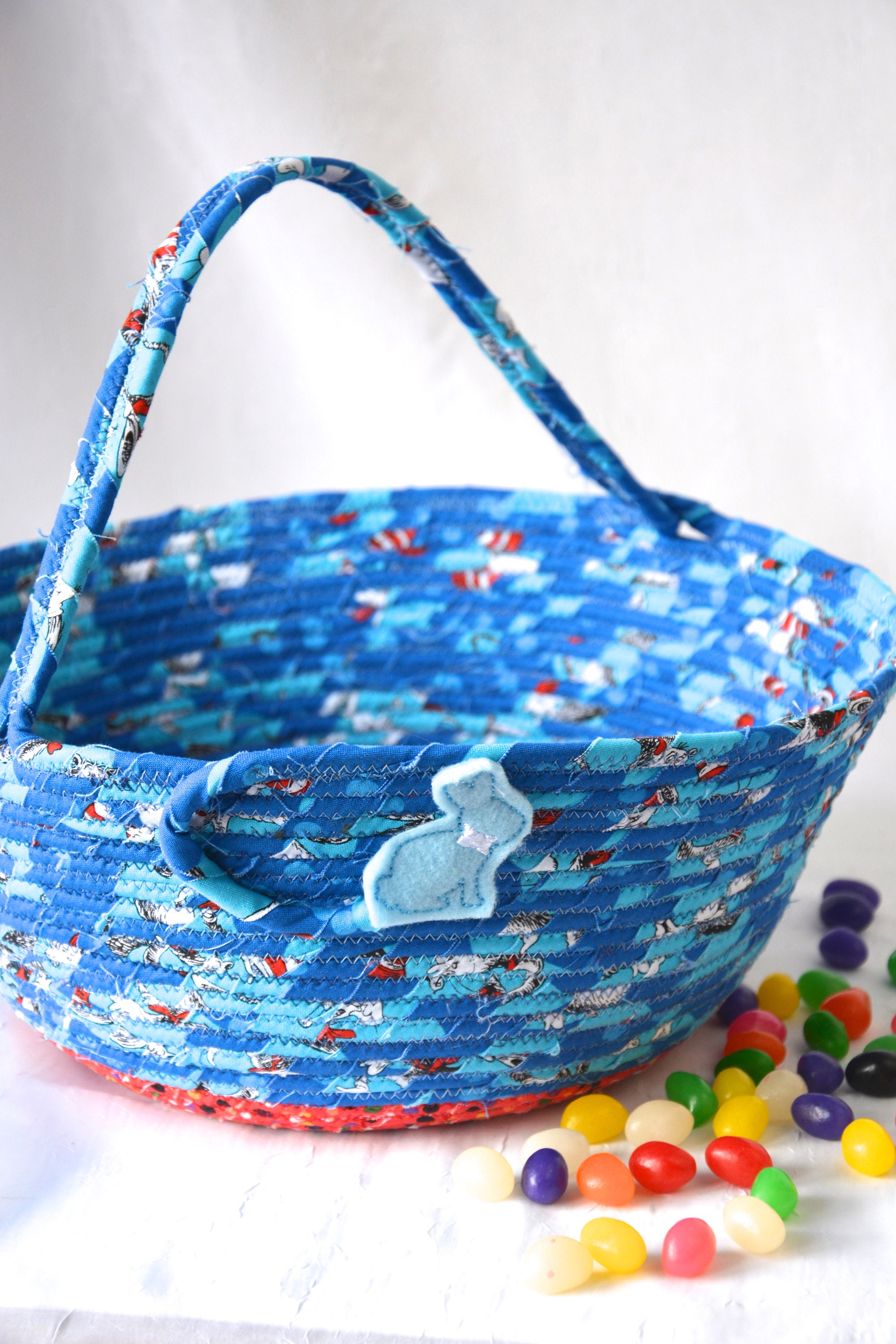 I hand wrapped these fun blue and red fabrics around cotton line, which I then hand coiled and machine quilted to make it sturdy. I used the raw edge technique with a little fray for a great shabby chic texture. I just love these colorful fabrics, all are 100% cotton and all show on the inside of the basket too! The cute felted bunny on the basket is included for a nice accent.