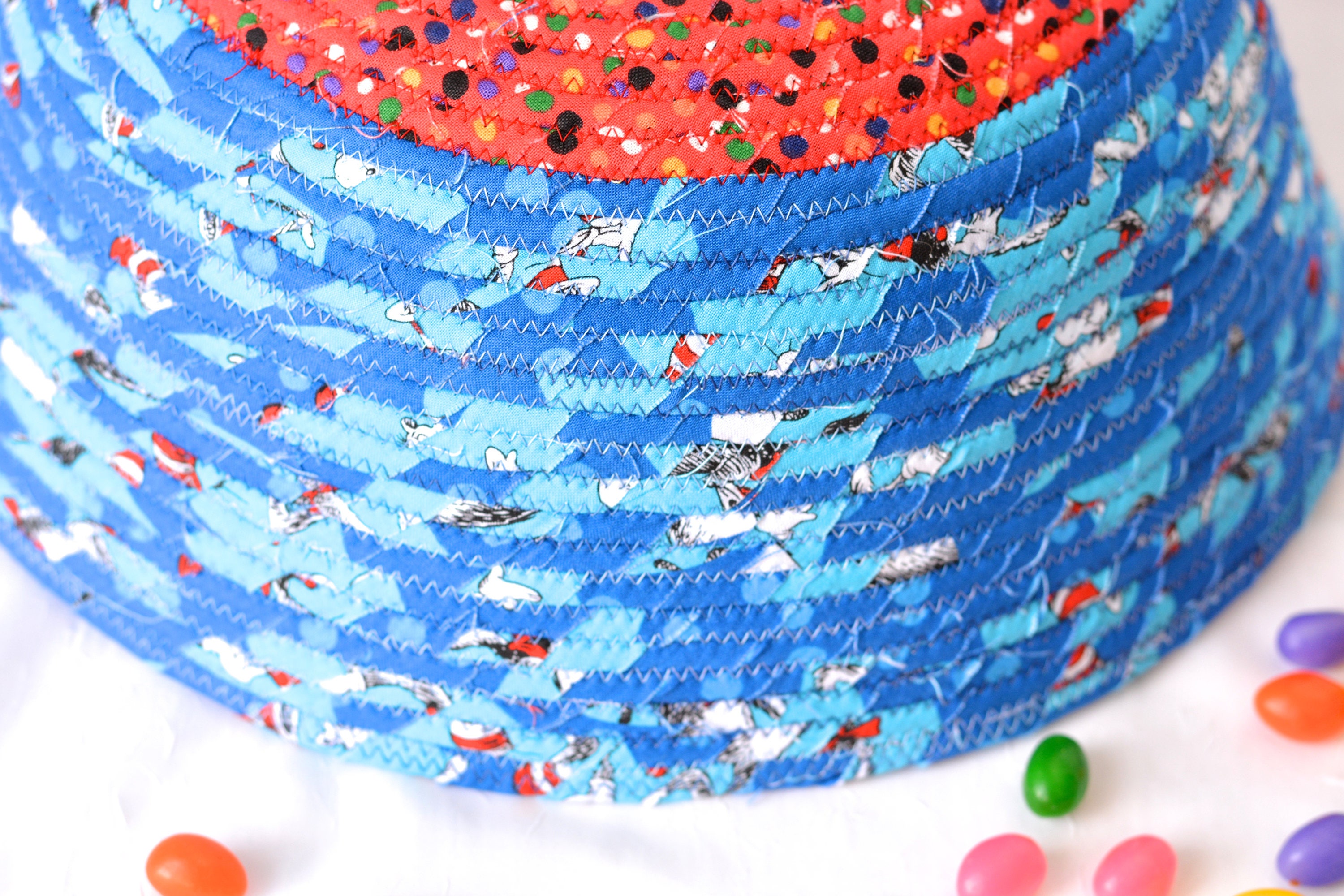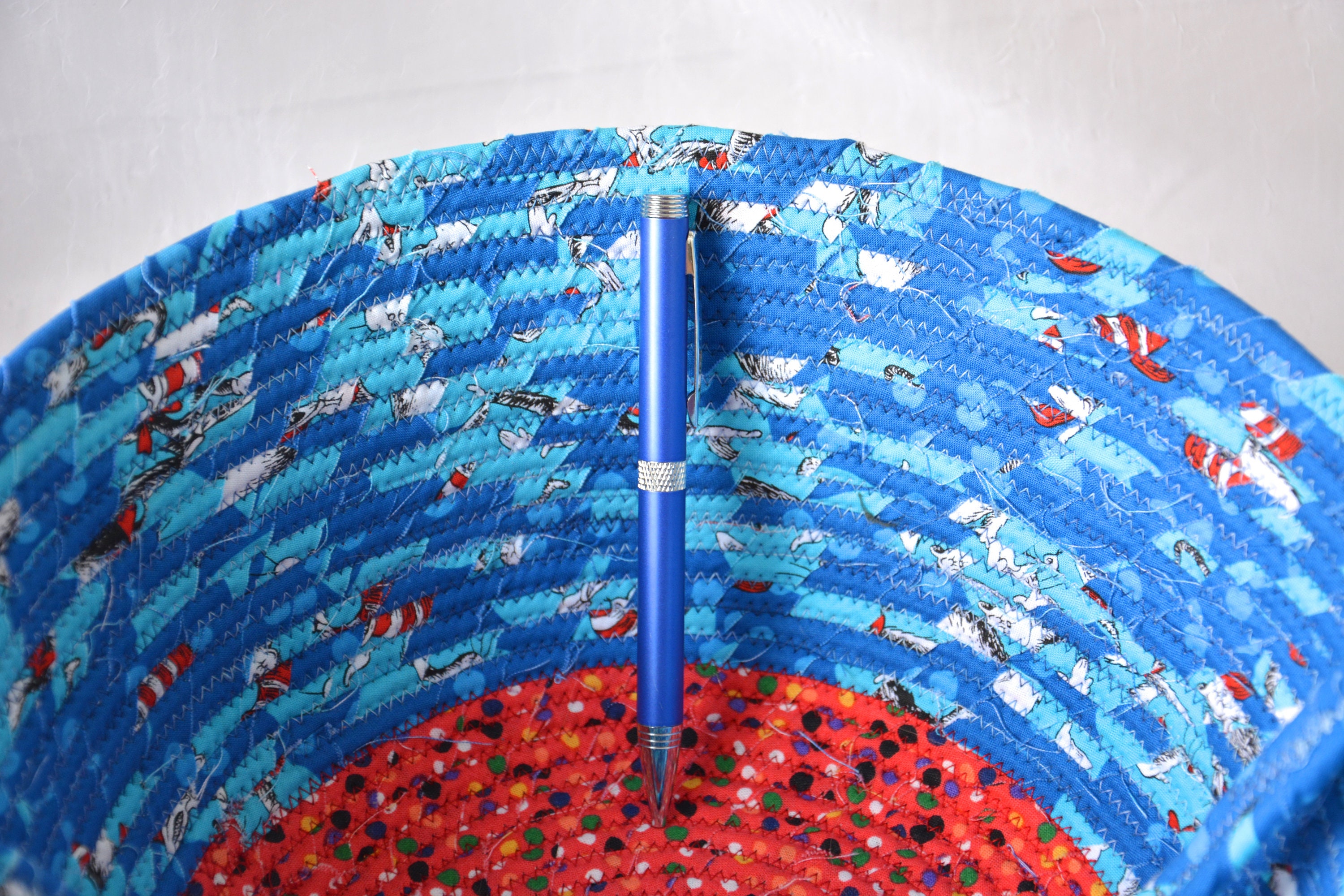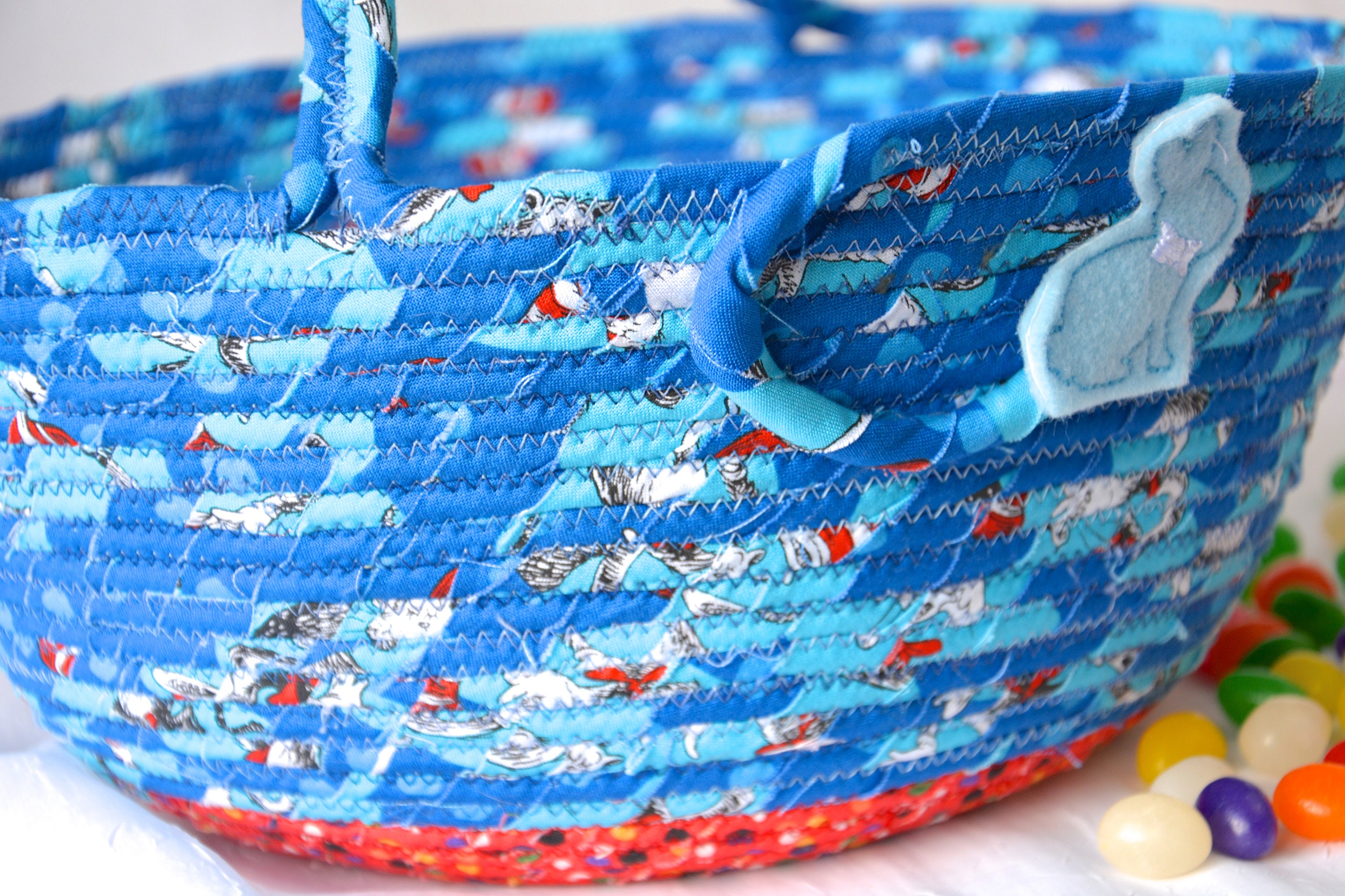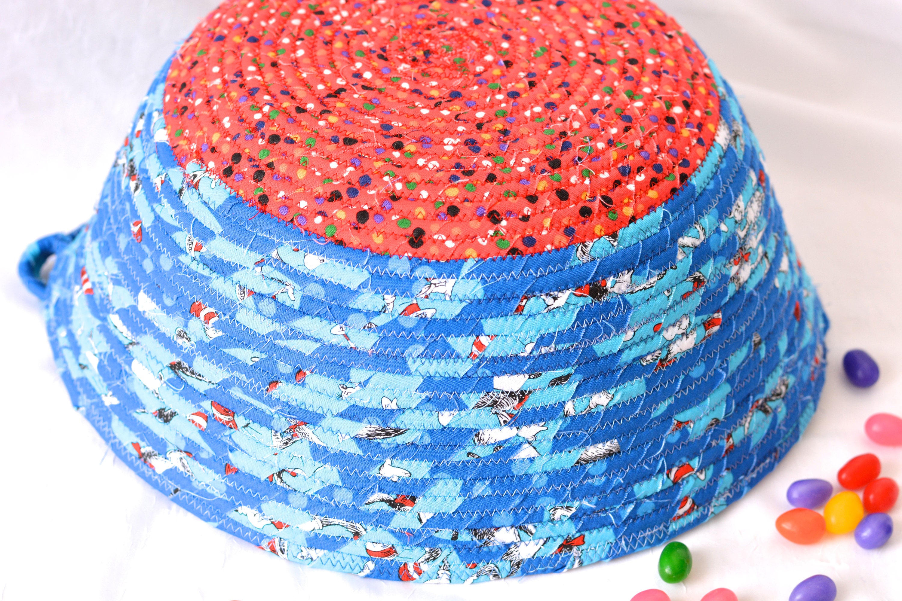 I hand wrapped these fun blue and red fabrics around cotton line, which I then hand coiled and machine quilted to make it sturdy. I used the raw edge technique with a little fray for a great shabby chic texture. I just love these colorful fabrics, all are 100% cotton and all show on the inside of the basket too! The cute felted bunny on the basket is included for a nice accent.