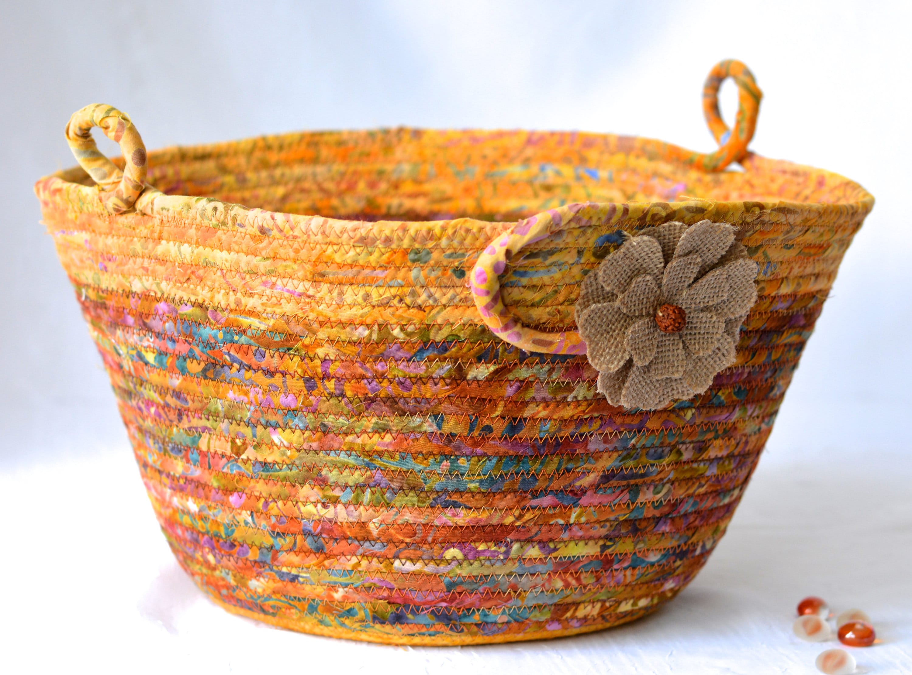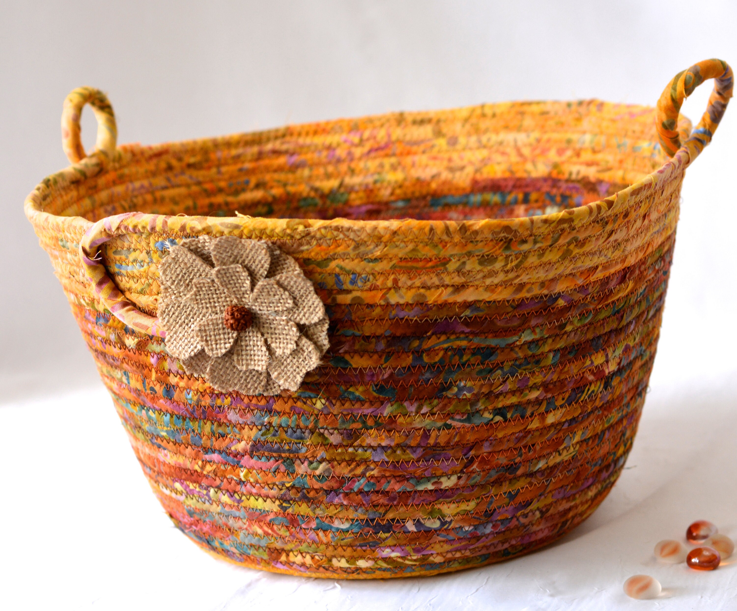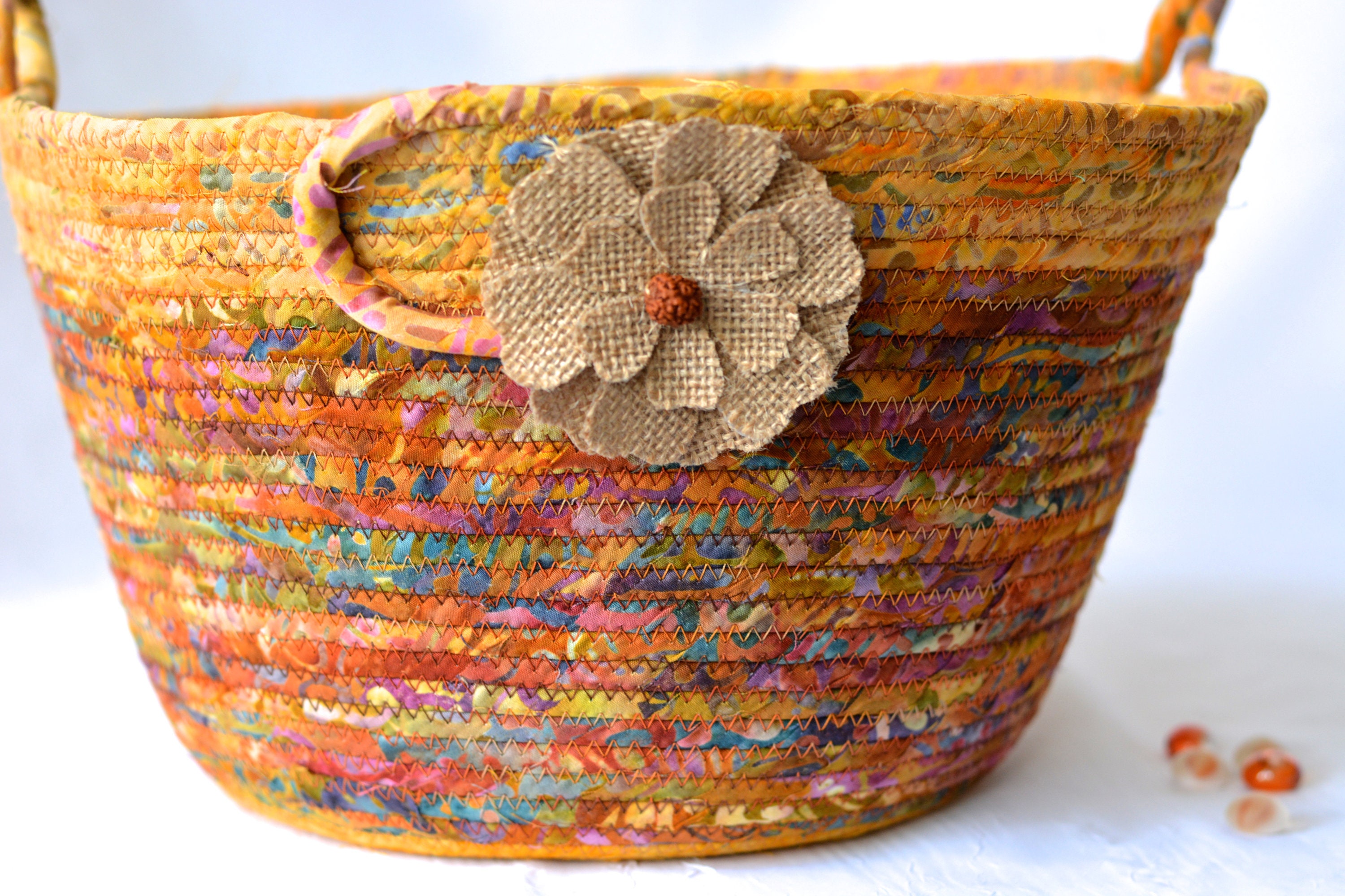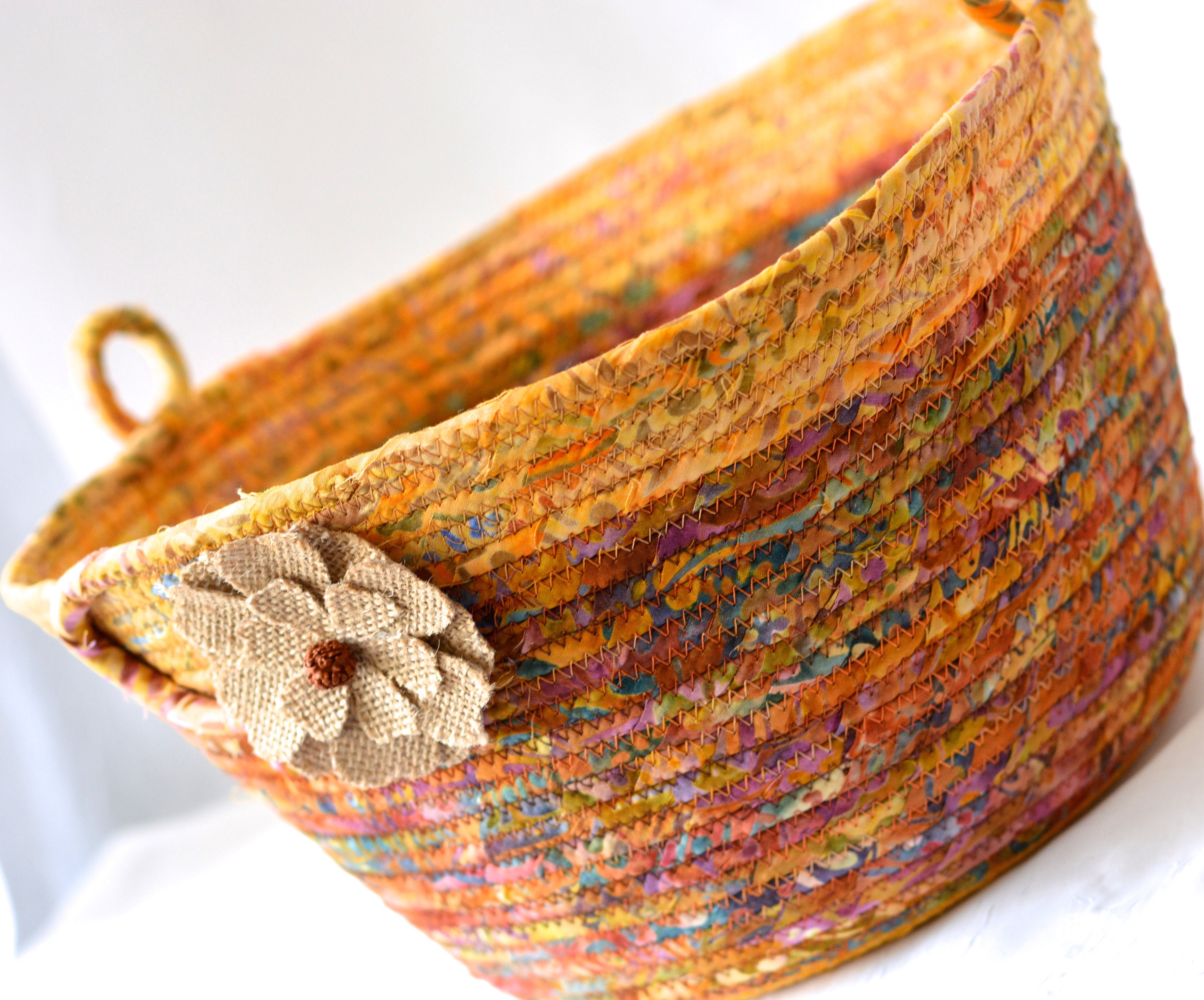 I hand wrapped these wonderful batik fabrics around cotton line, which I then hand coiled and machine quilted to make it sturdy. I used the raw edge technique with a little fray for a great shabby chic texture. These rich fabrics show on the inside too! Both fabrics are 100% cotton! I just love the top batik fabric, it has rich orange highlights that give it a nice pop for your table! The pretty flower on the basket is included for a nice accent.