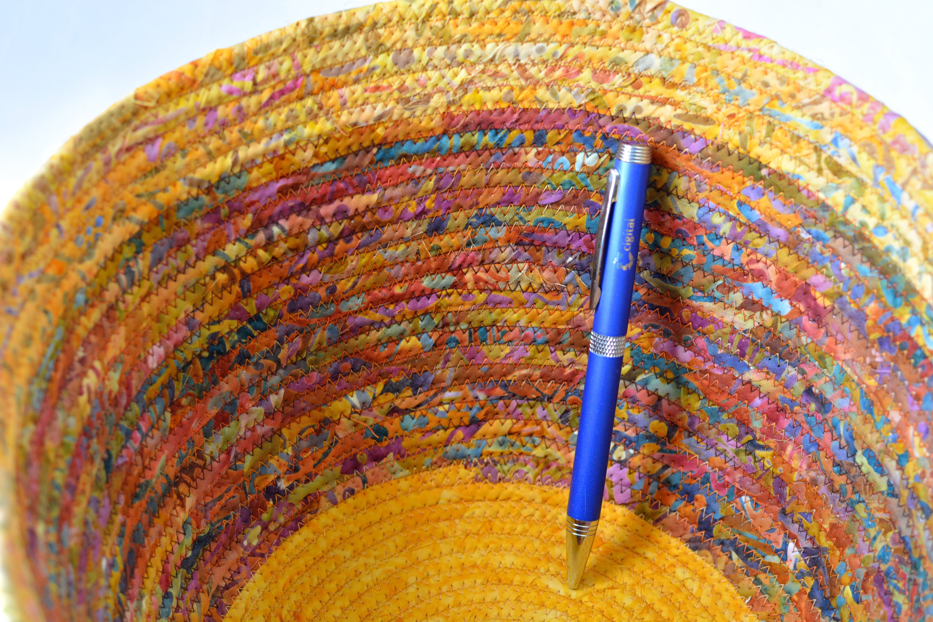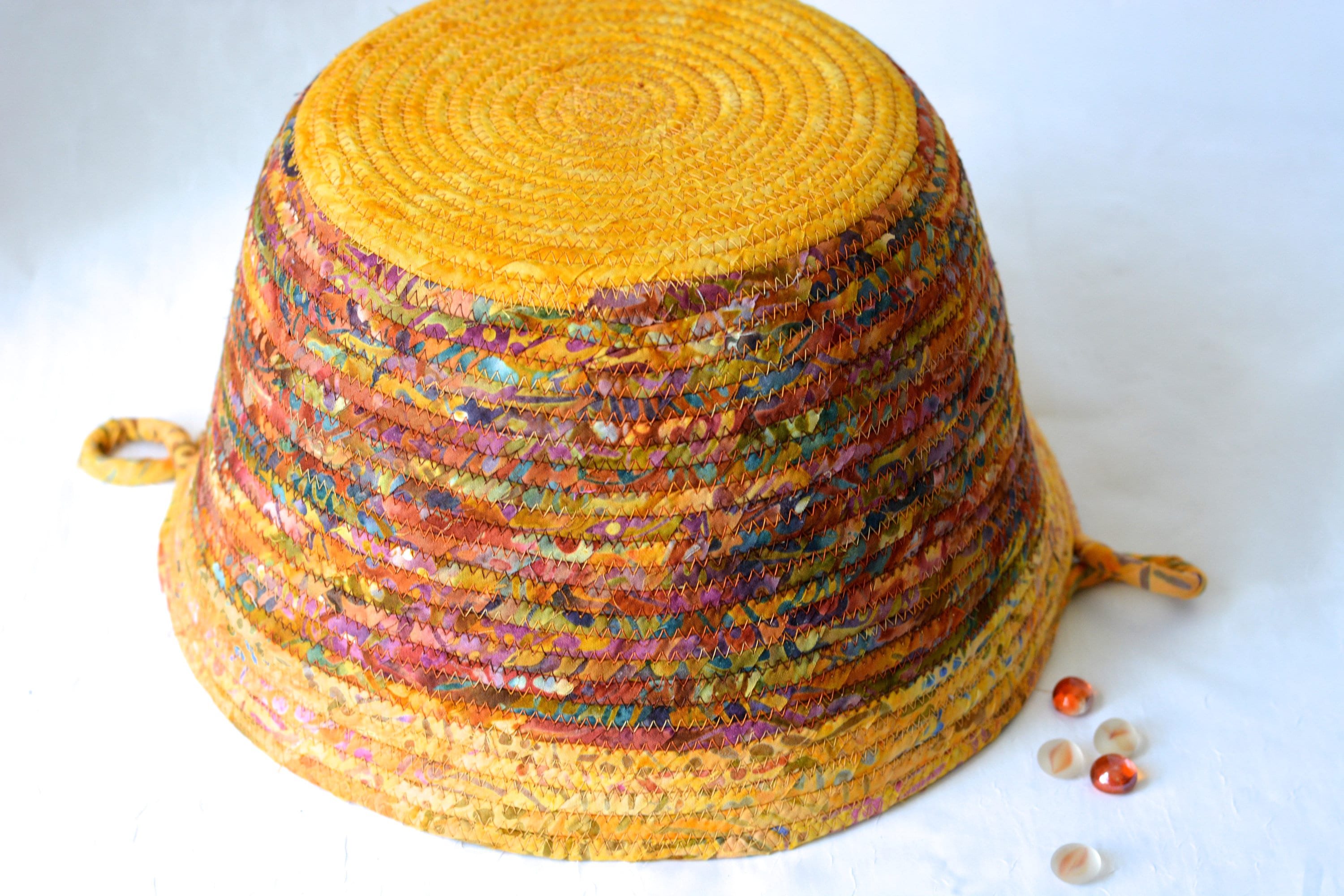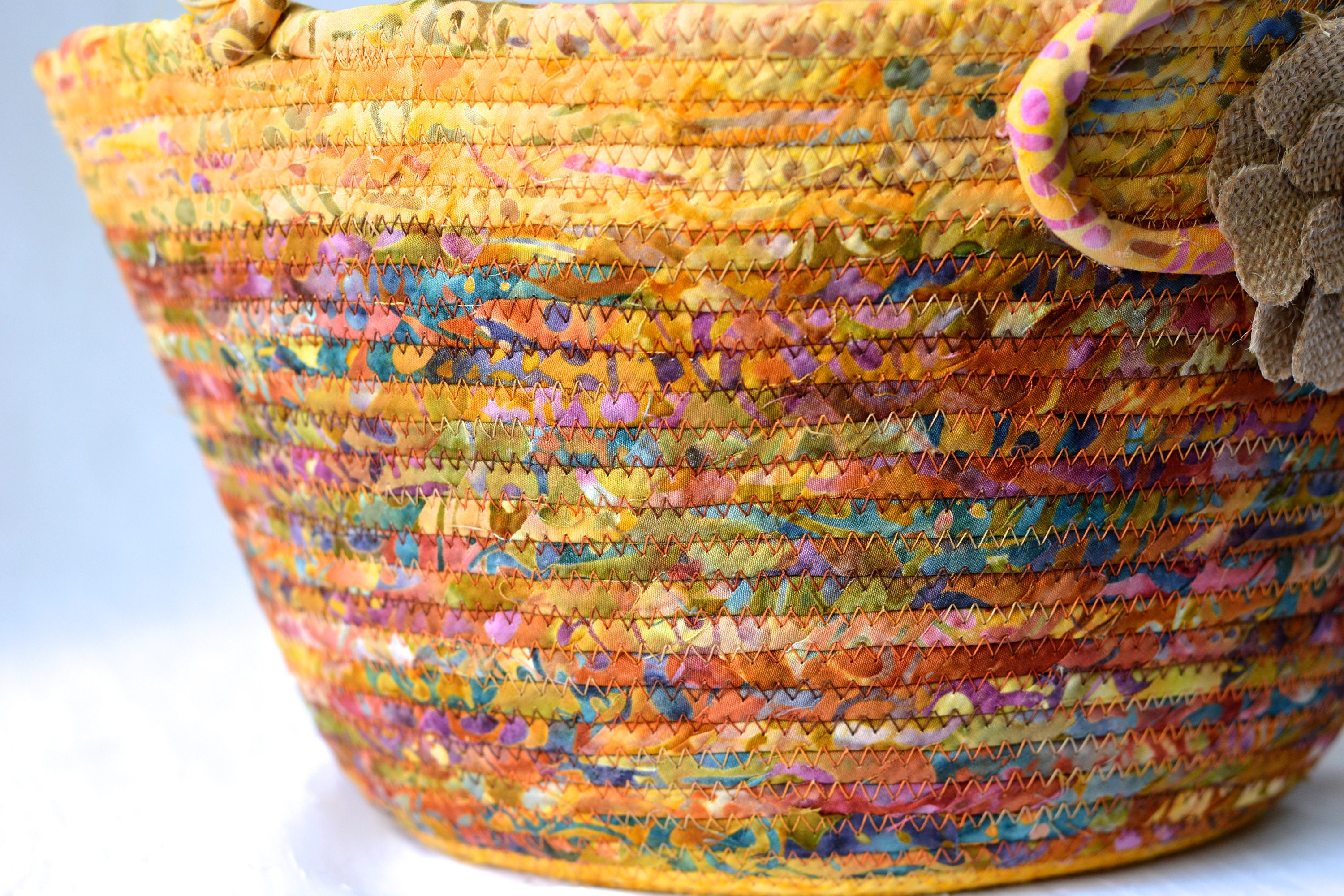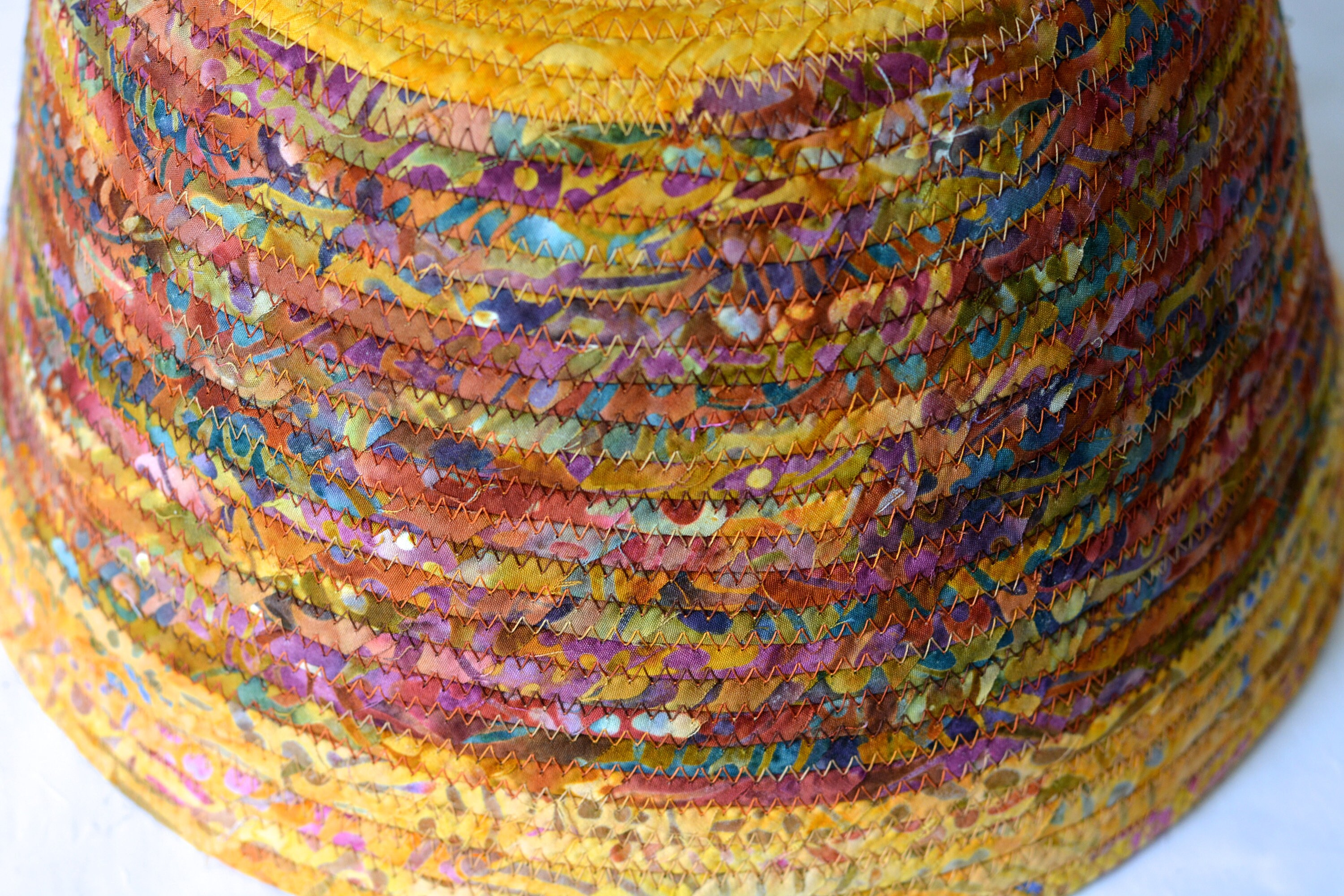 I hand wrapped these wonderful batik fabrics around cotton line, which I then hand coiled and machine quilted to make it sturdy. I used the raw edge technique with a little fray for a great shabby chic texture. These rich fabrics show on the inside too! Both fabrics are 100% cotton! I just love the top batik fabric, it has rich orange highlights that give it a nice pop for your table! The pretty flower on the basket is included for a nice accent.
