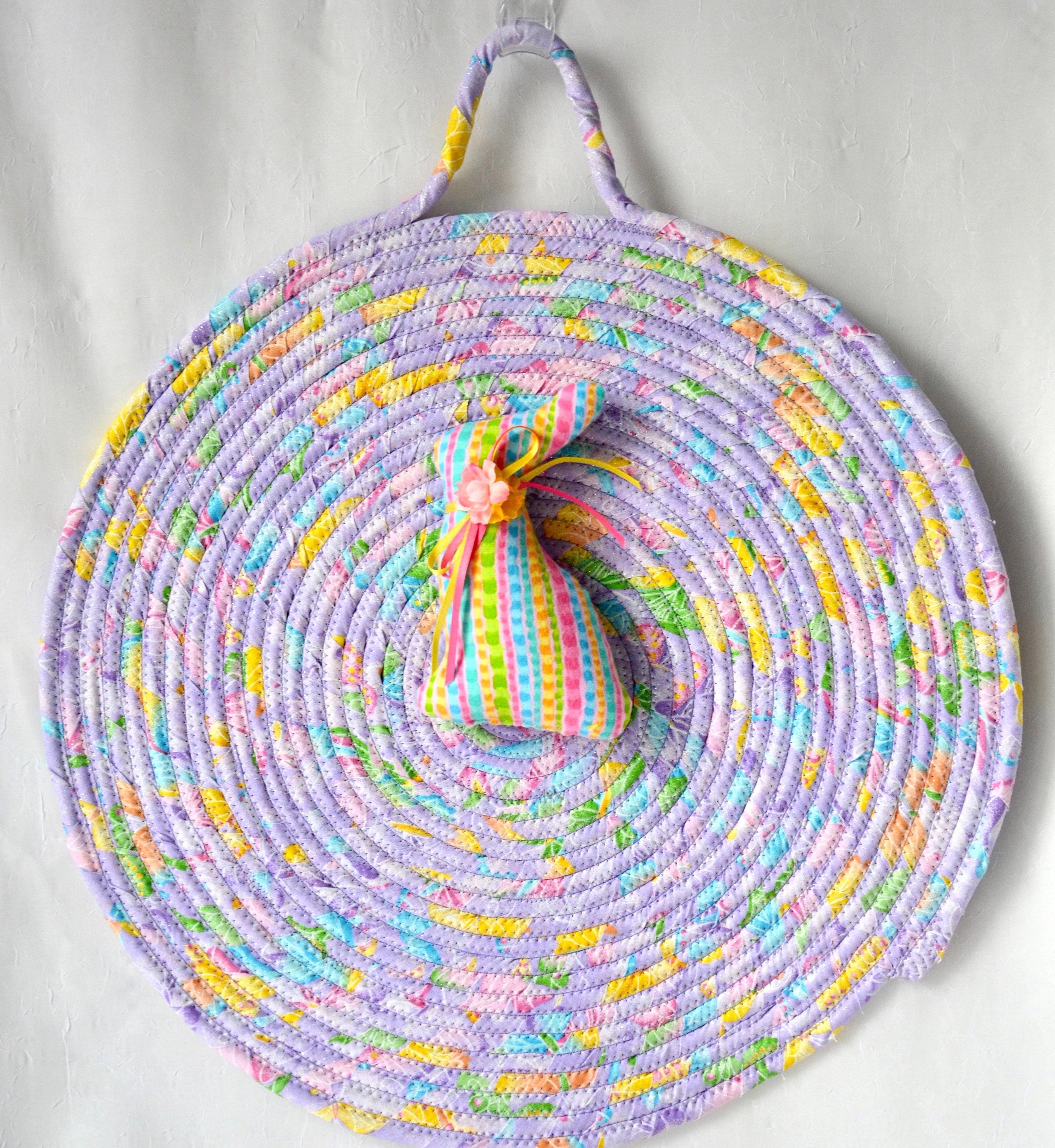 I hand wrapped this pretty lavender glitter fabric around cotton line, which I then hand coiled and machine quilted to make it sturdy. I used the raw edge technique with a little fray adding a nice shabby chic texture. 100% cotton fabric! The pattern created is so unique! OOAK! The attached Easter bunny is included for a cute accent,