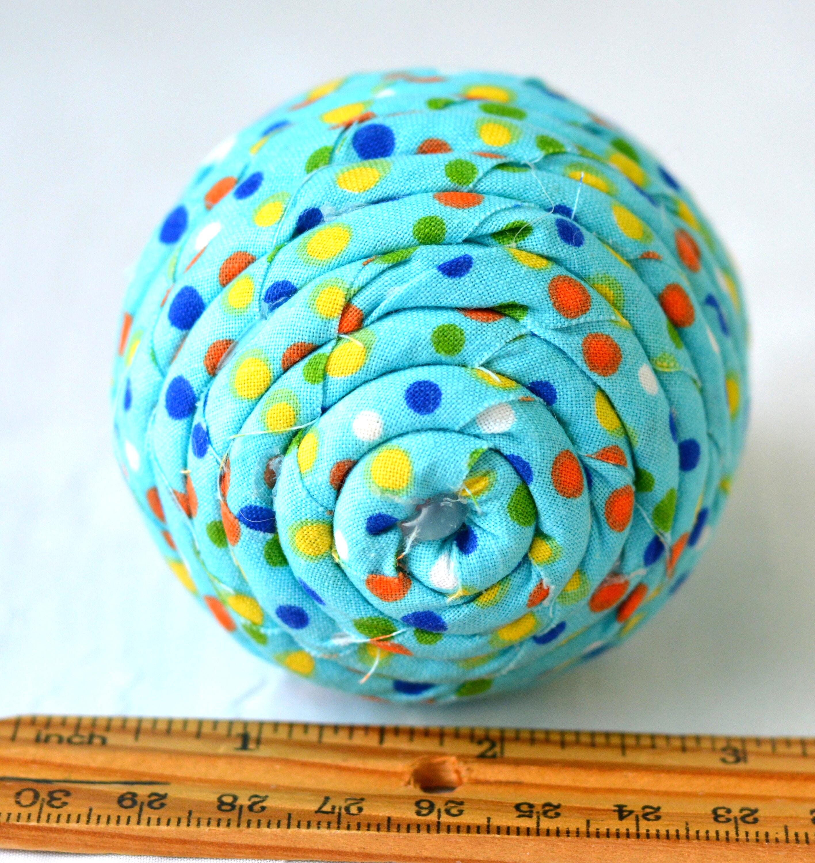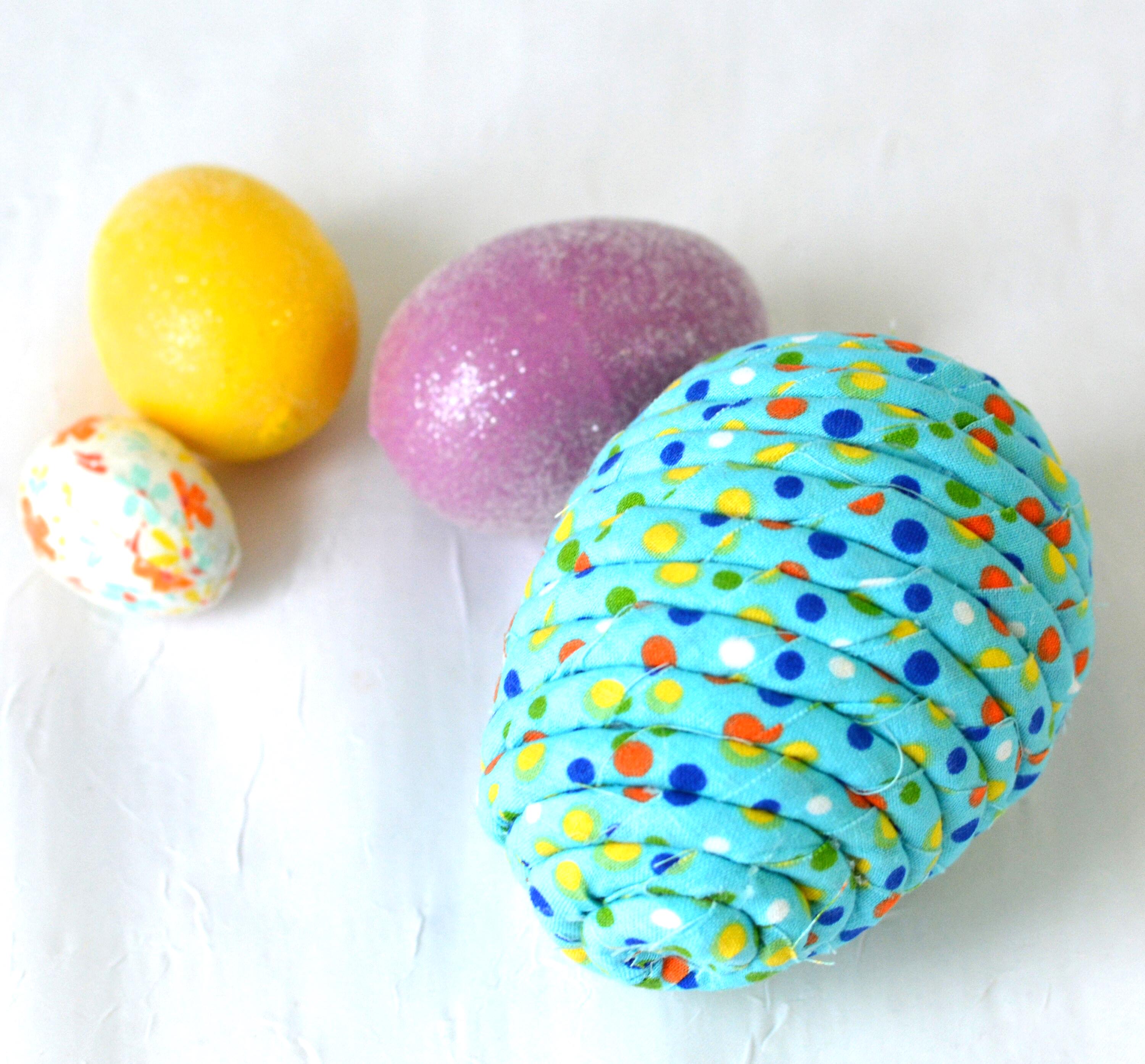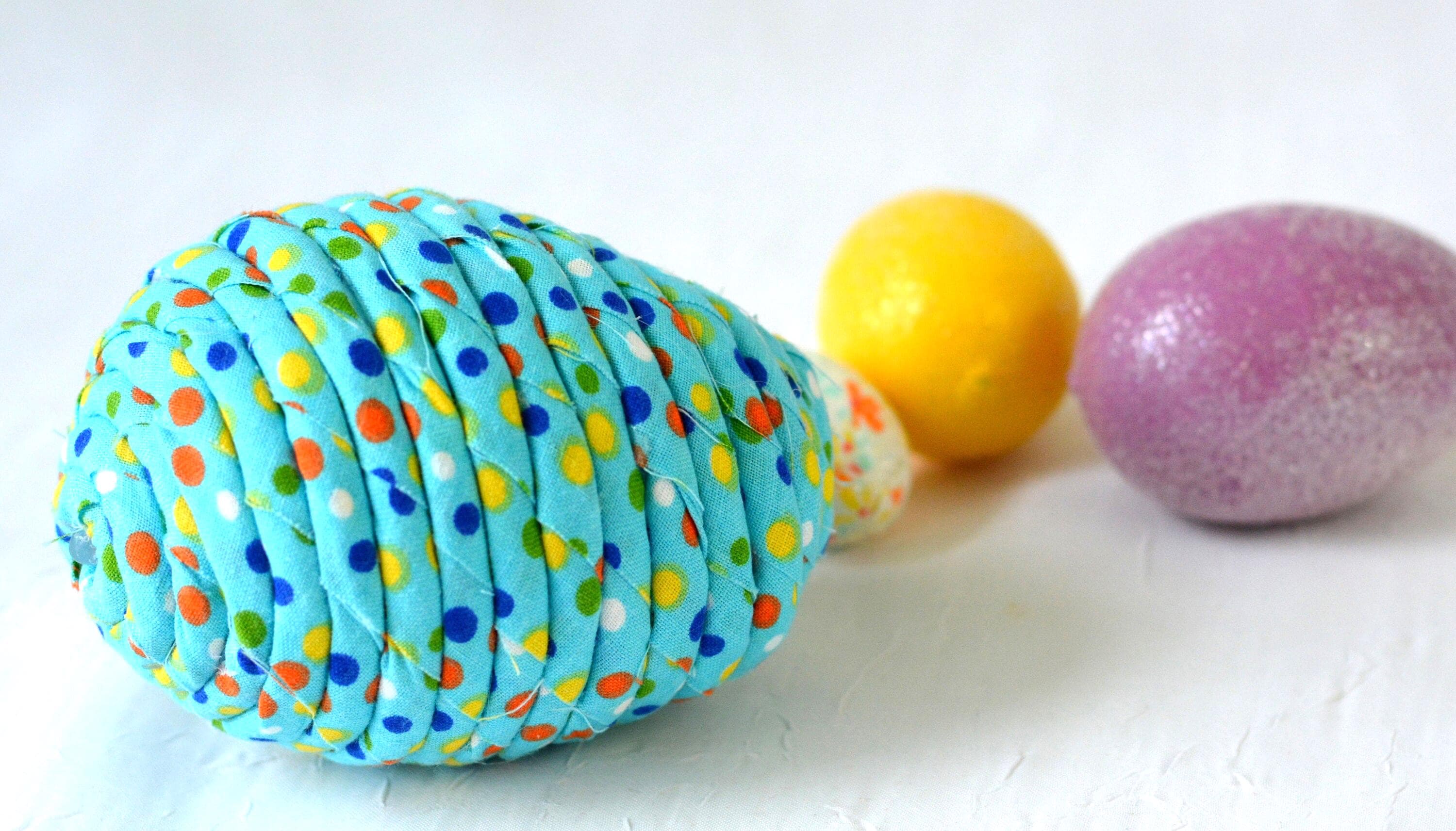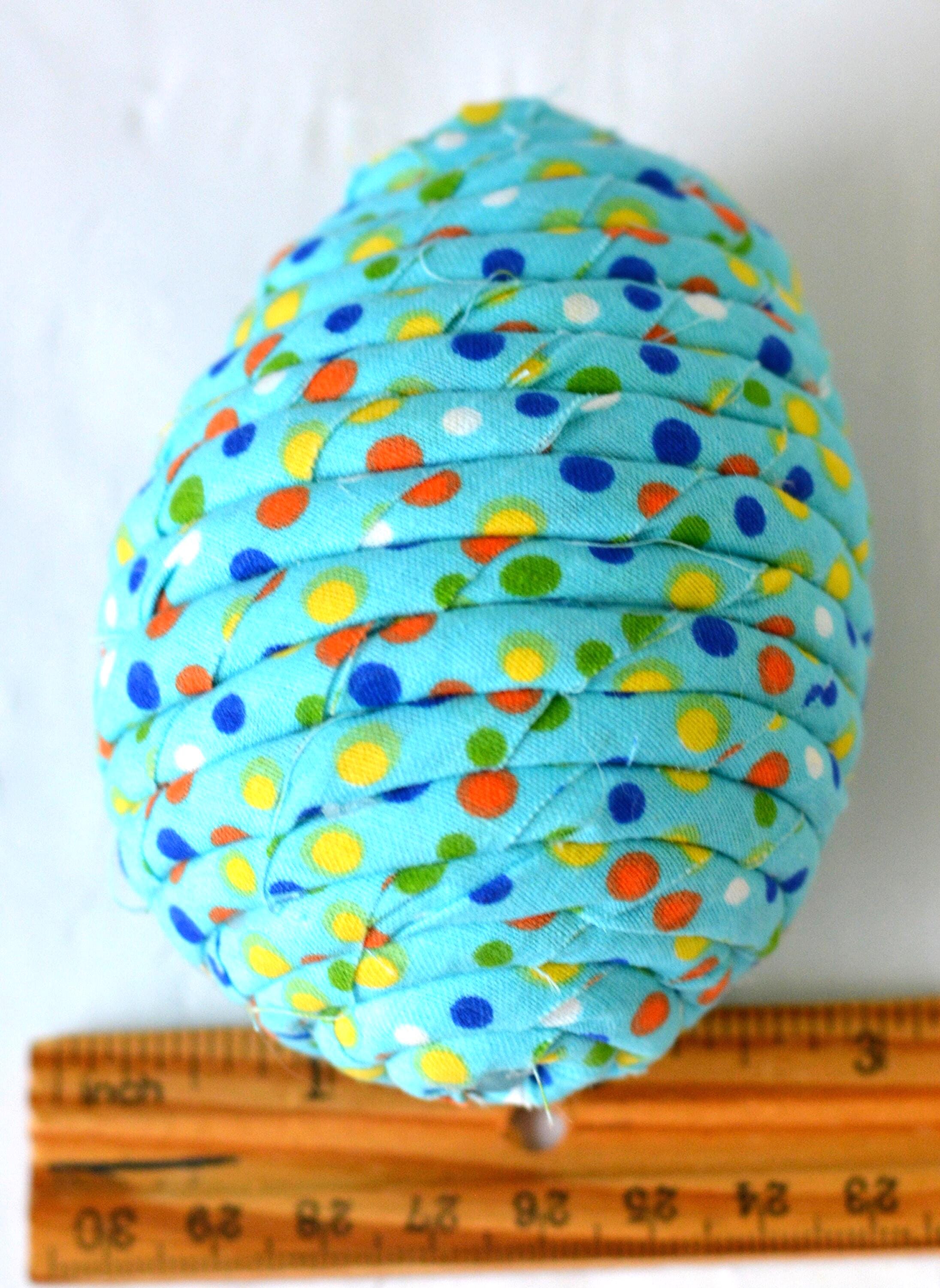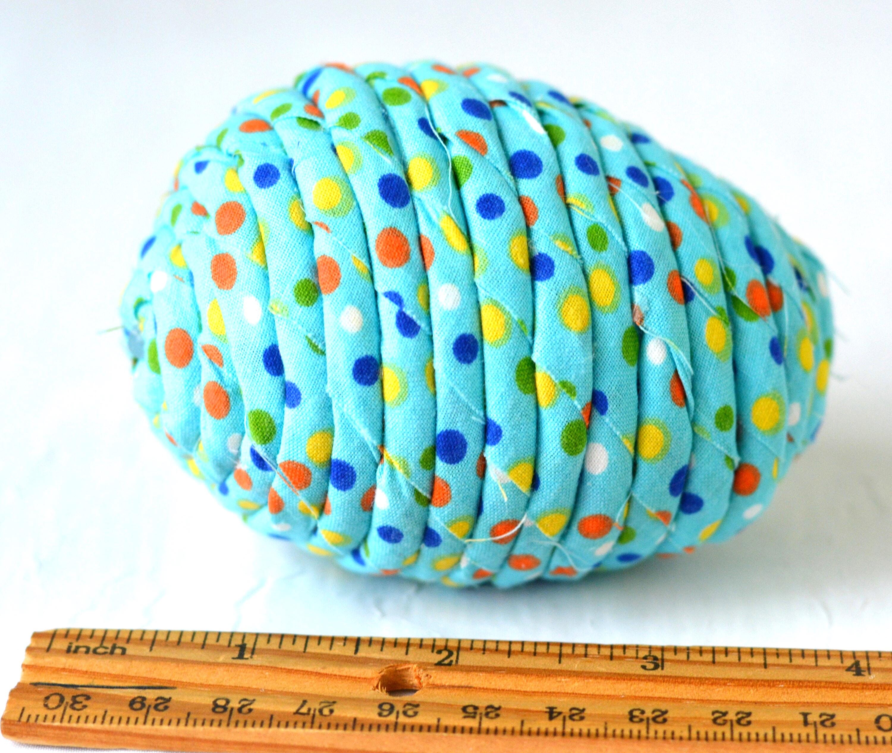 I hand wrapped this cute blue dot fabric around cotton line which I than hand coiled into an Easter Egg shape. The fabric edge is unfinished for a lovely shabby chic texture.