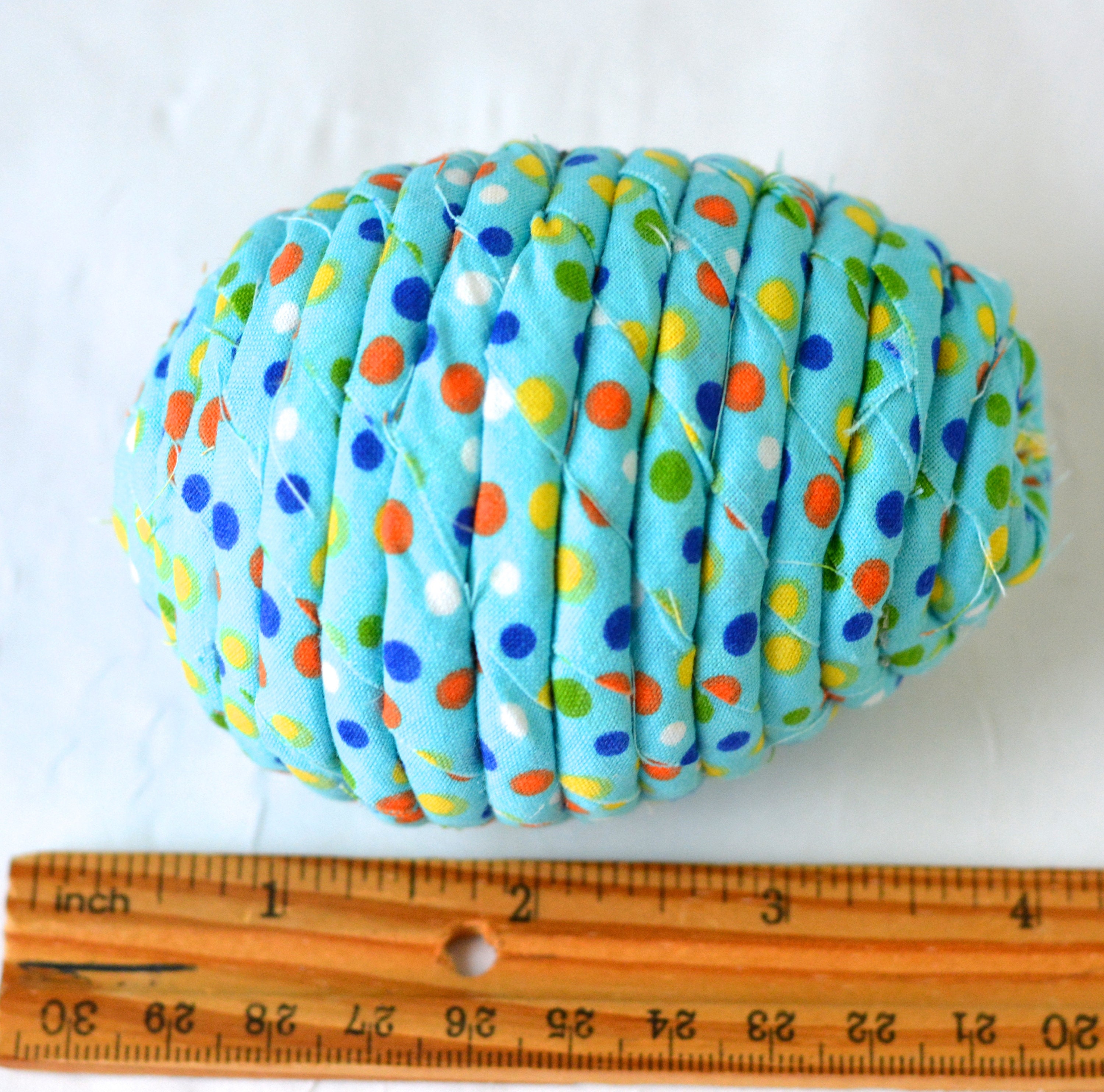 I hand wrapped this cute blue dot fabric around cotton line which I than hand coiled into an Easter Egg shape. The fabric edge is unfinished for a lovely shabby chic texture.