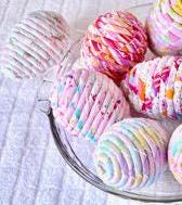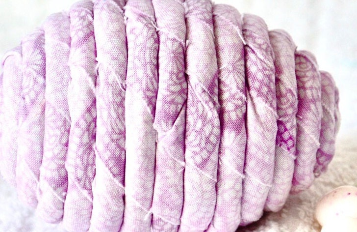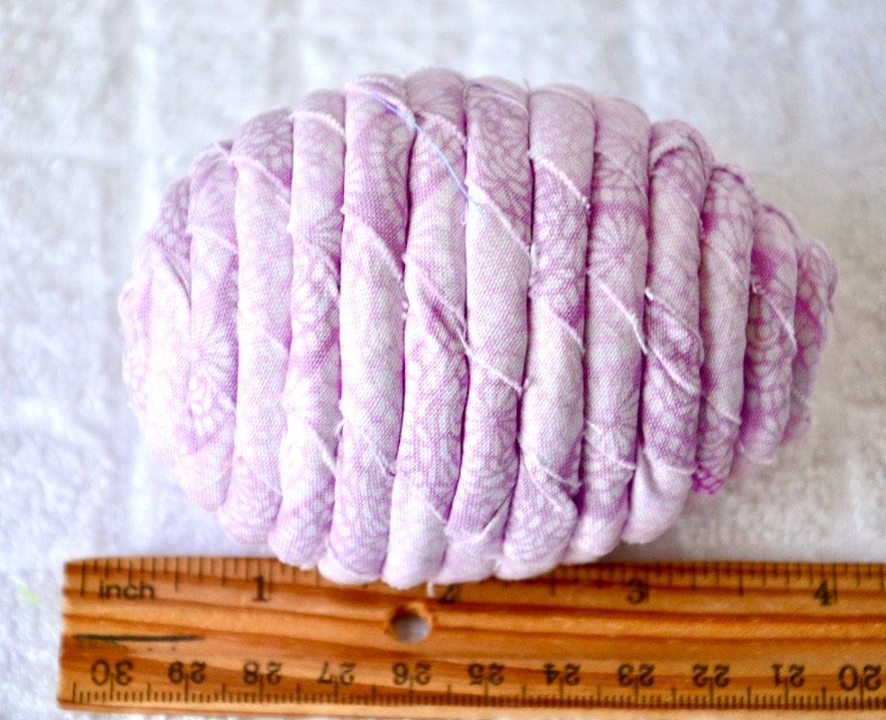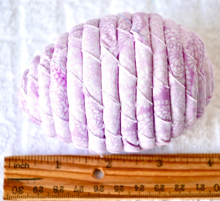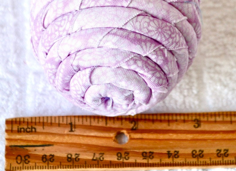I hand wrapped this lovely violet batik fabric around cotton line which I than hand coiled into an Easter Egg shape. The fabric edge is unfinished for a lovely shabby chic texture. I just love this pretty fabric, it created a unique swirl pattern. I designed and created this lovely Easter egg in my smoke free home studio. Bunny, jelly bean, ruler, candy props not included. Egg does not open. Spot clean.