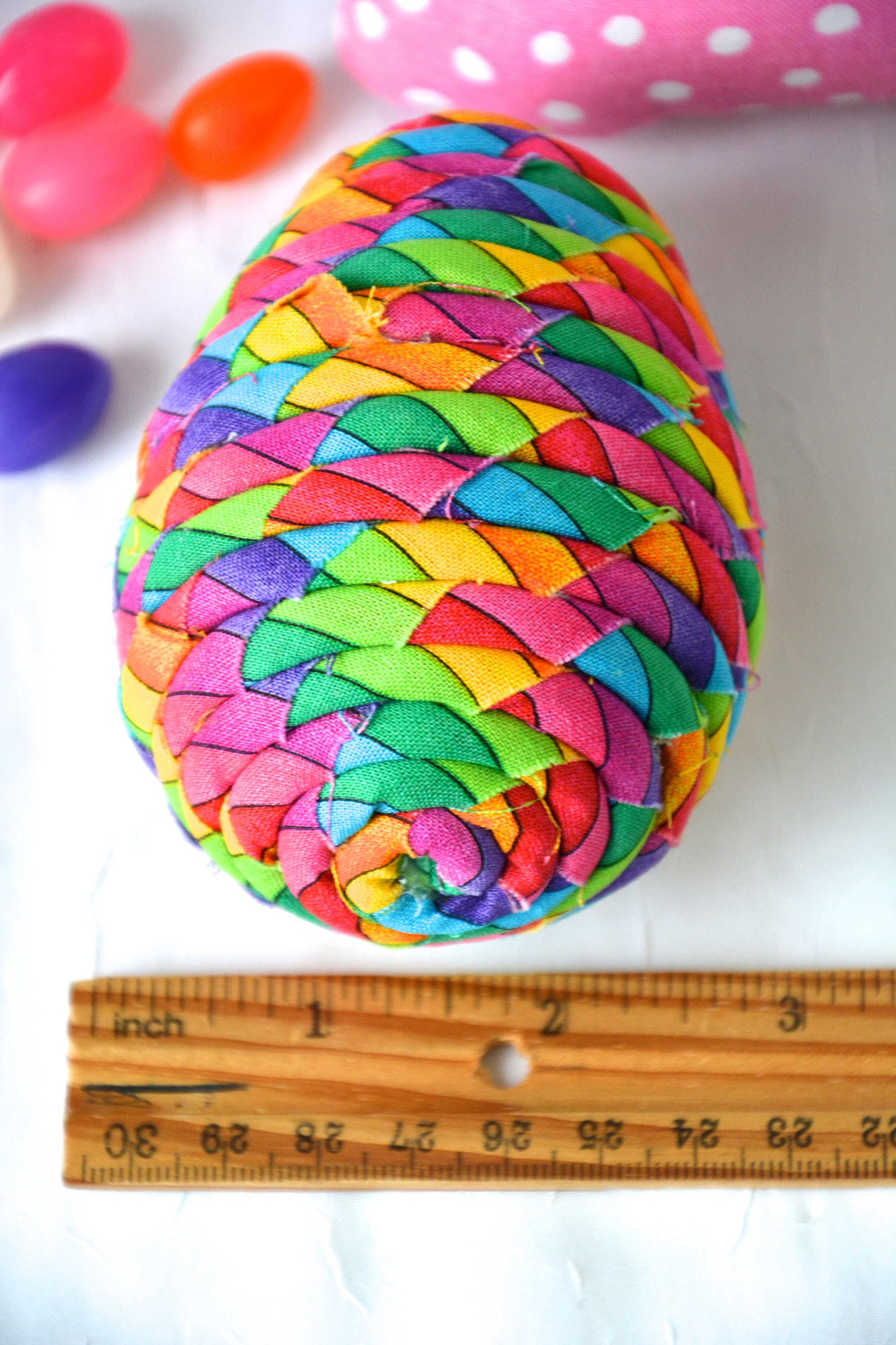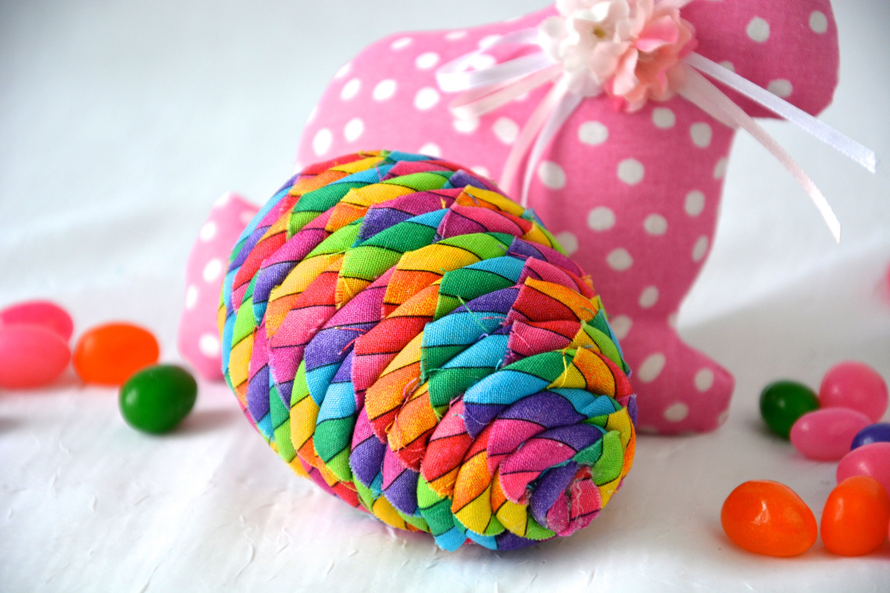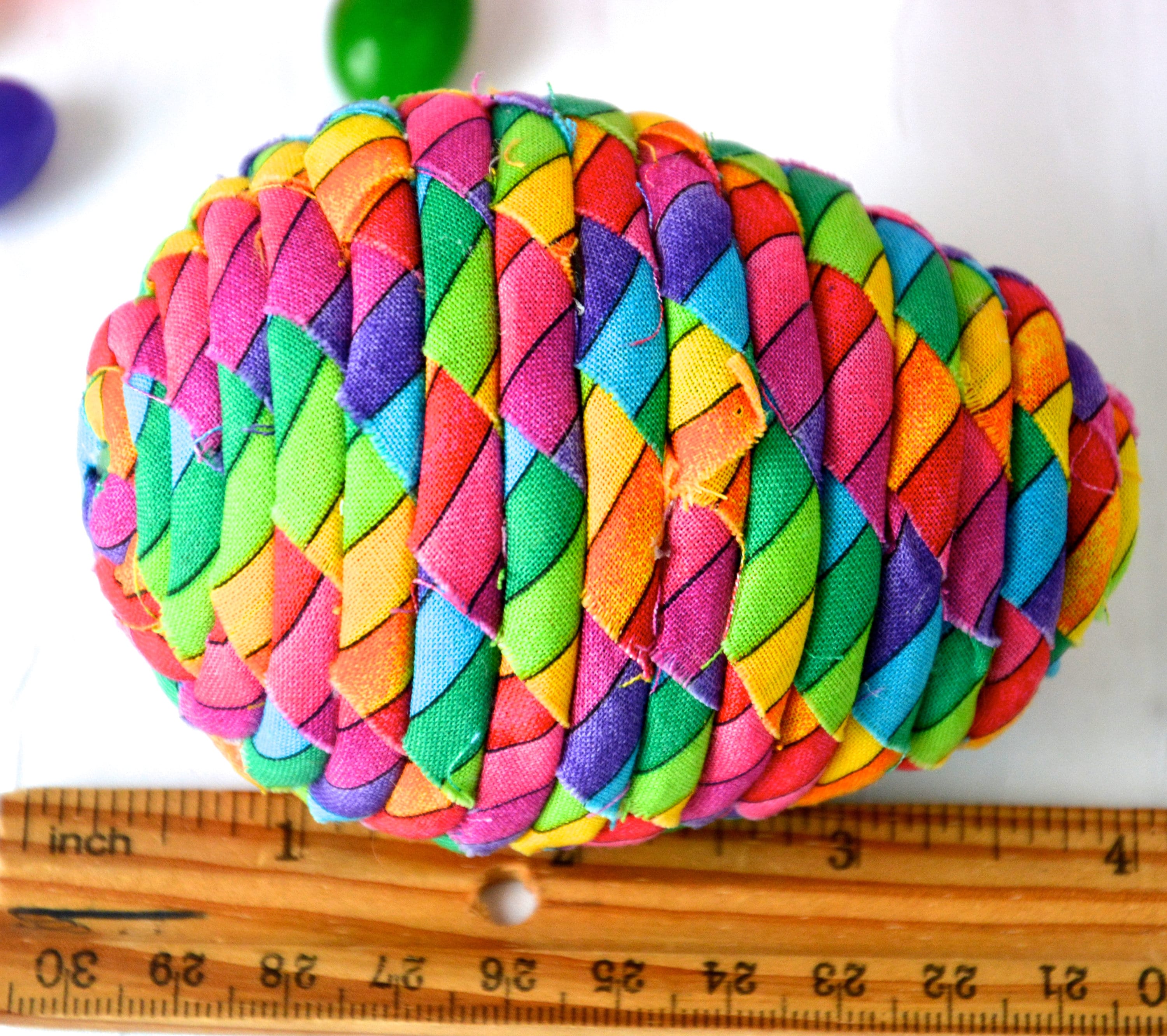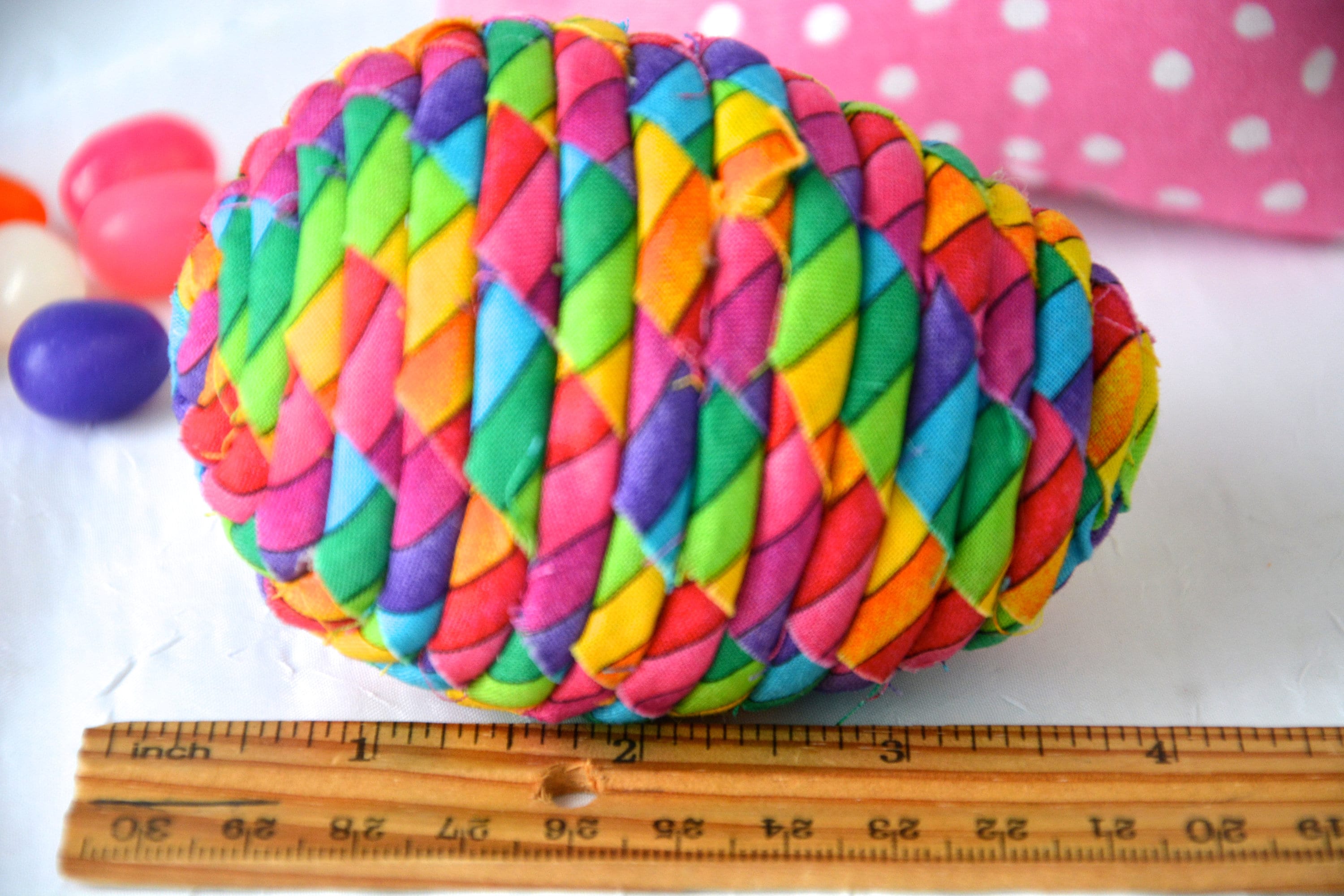 I hand wrapped this fun rainbow fabric around cotton line which I than hand coiled into an Easter Egg shape. The fabric edge is unfinished for a lovely shabby chic texture. Egg does not open.