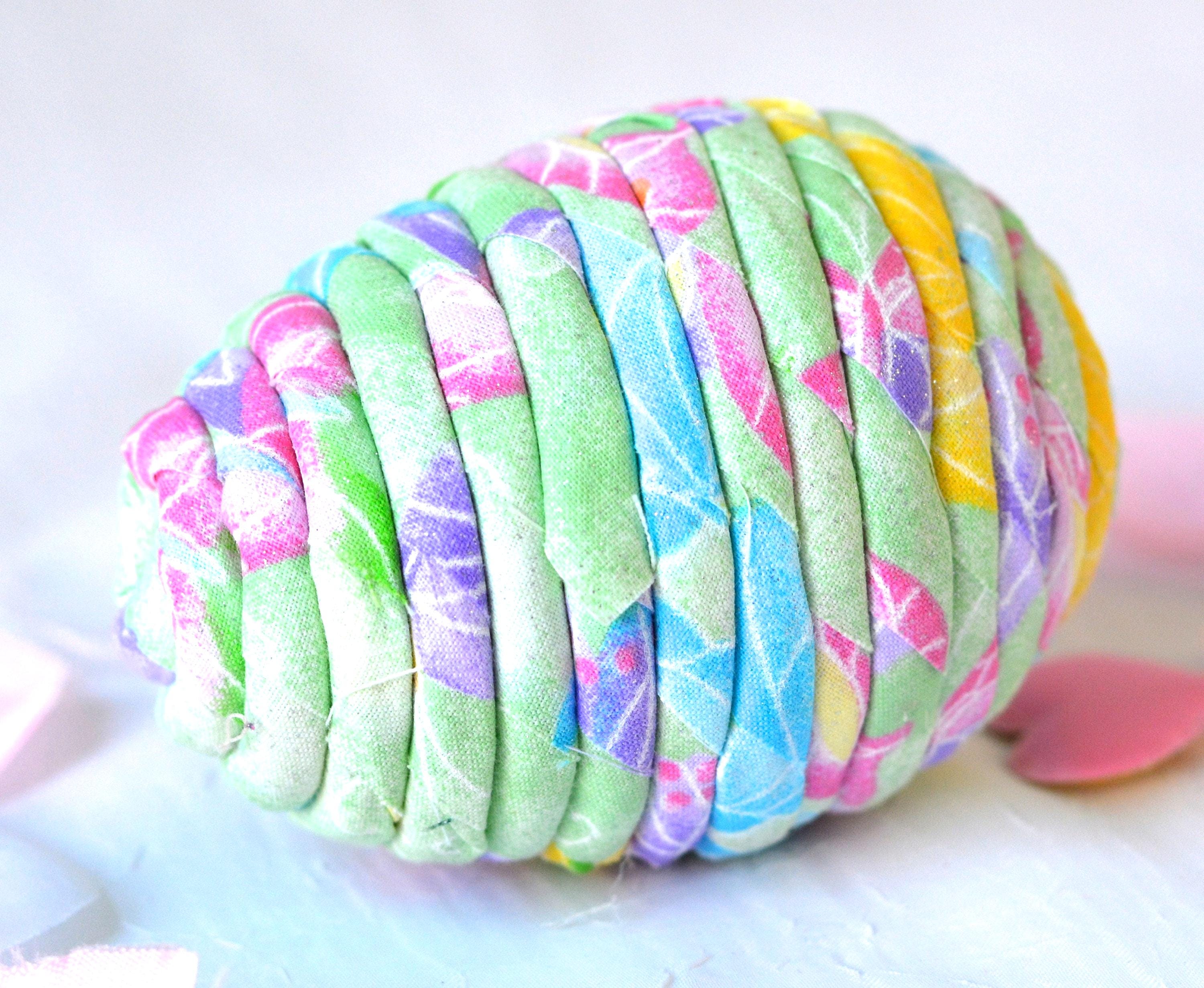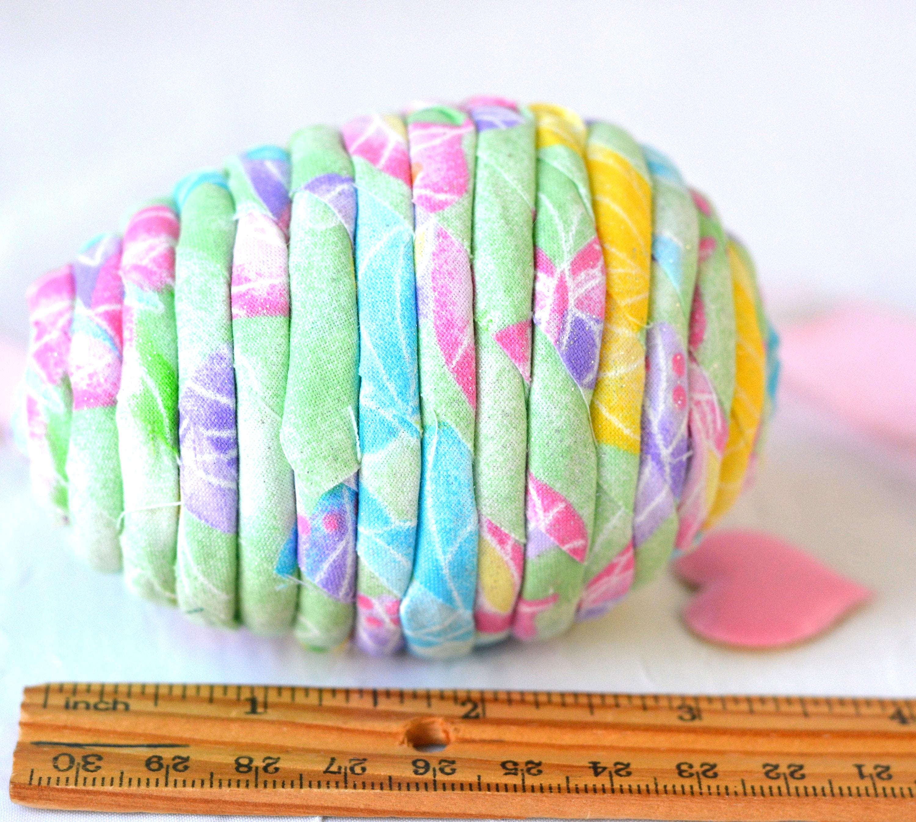 I hand wrapped this pretty green glitter fabric around cotton line which I than hand coiled into an Easter Egg shape. The fabric edge is unfinished for a lovely shabby chic texture.