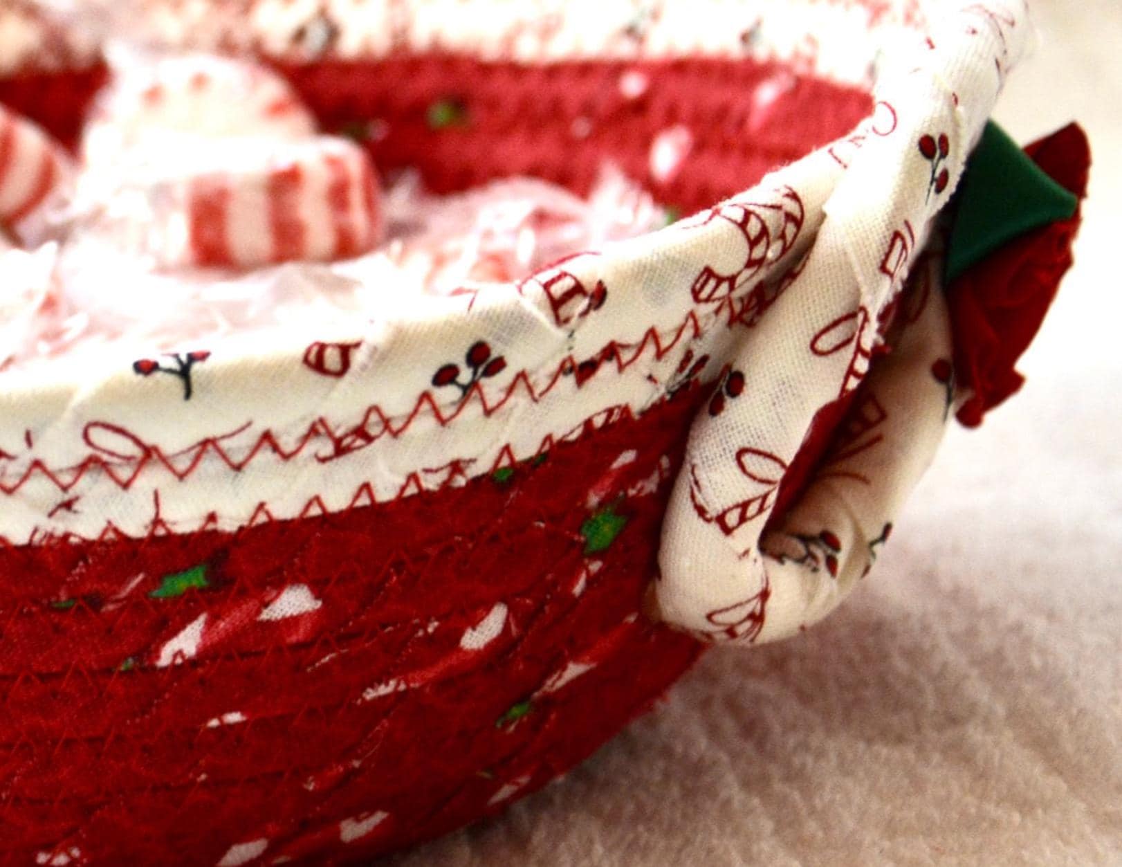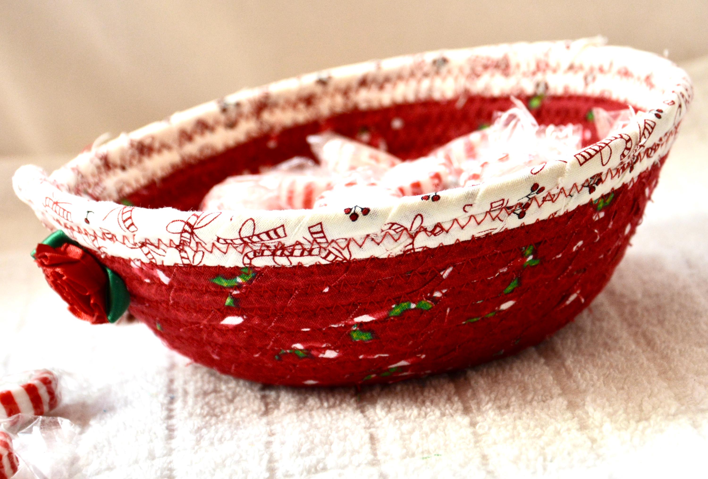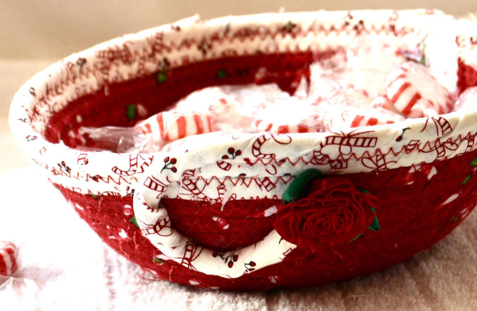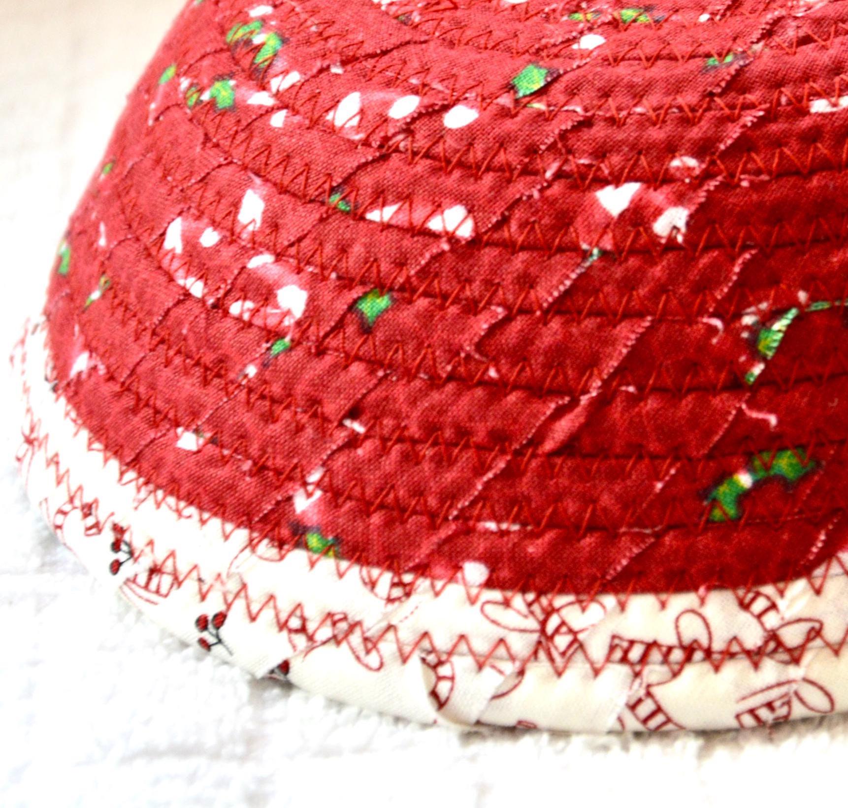 I hand wrapped these rich red Christmas fabrics around cotton line, which I then hand coiled and machine quilted to make it sturdy. I used the raw edge technique with a little fray for a great shabby chic texture. All holiday fabrics show on the inside of the basket too! 100% cotton! The pretty flower on the basket is included for a nice accent.