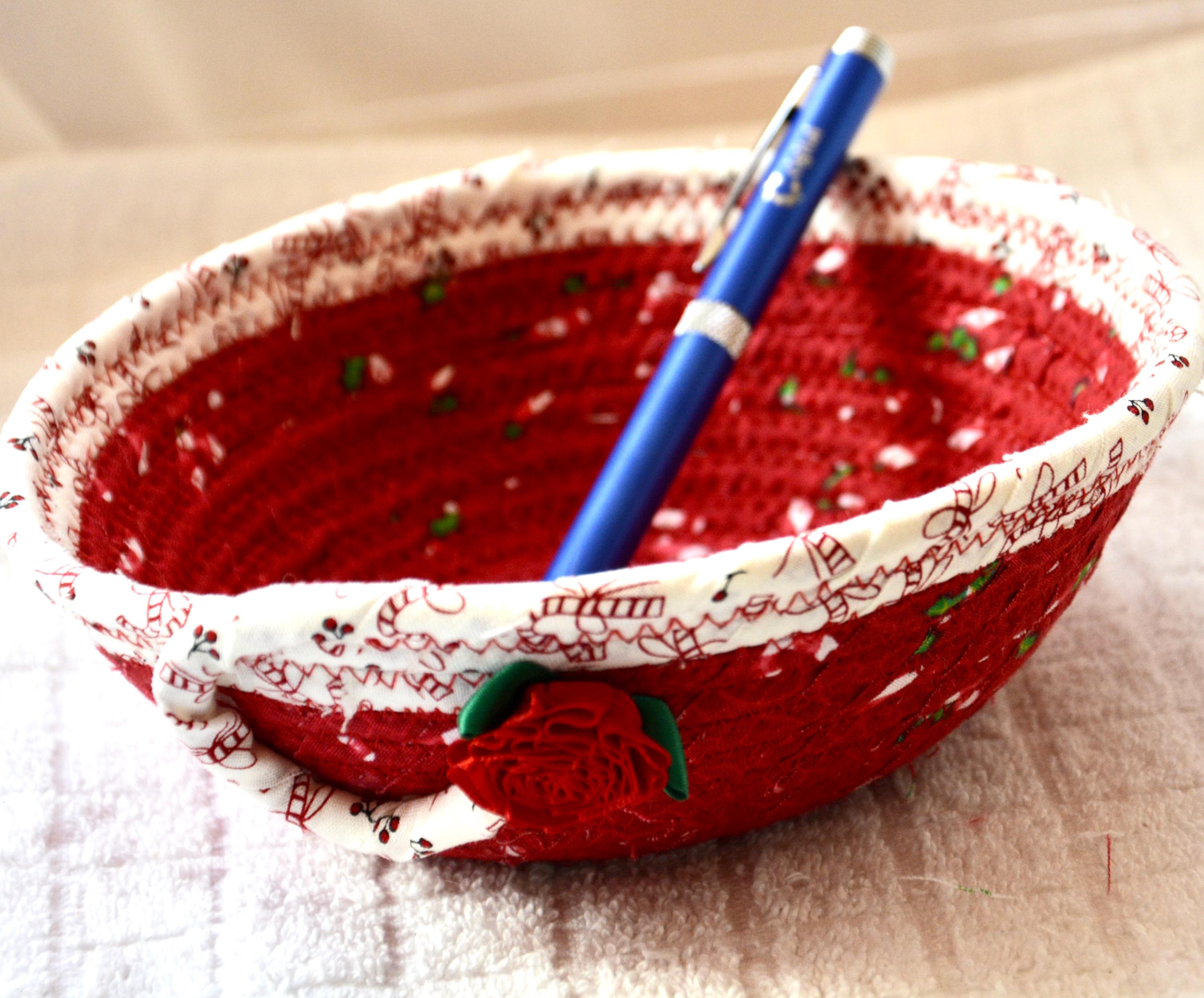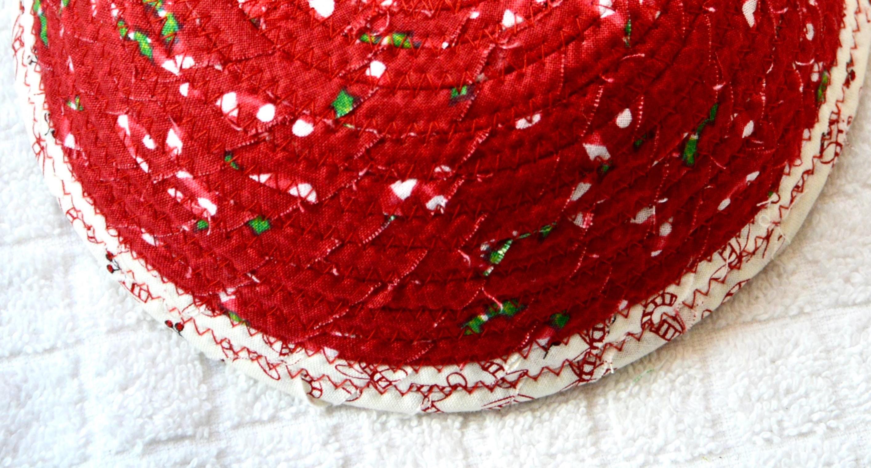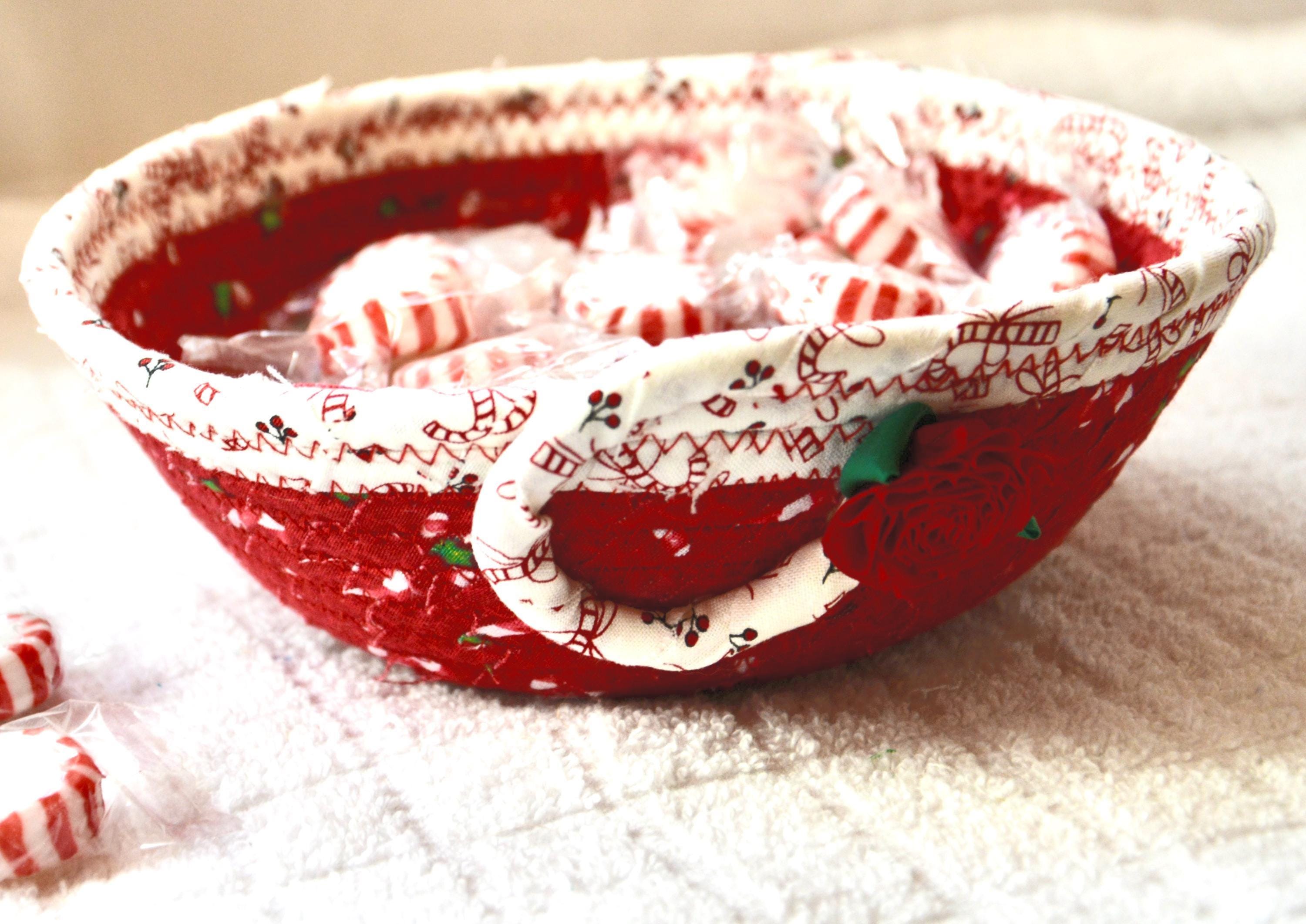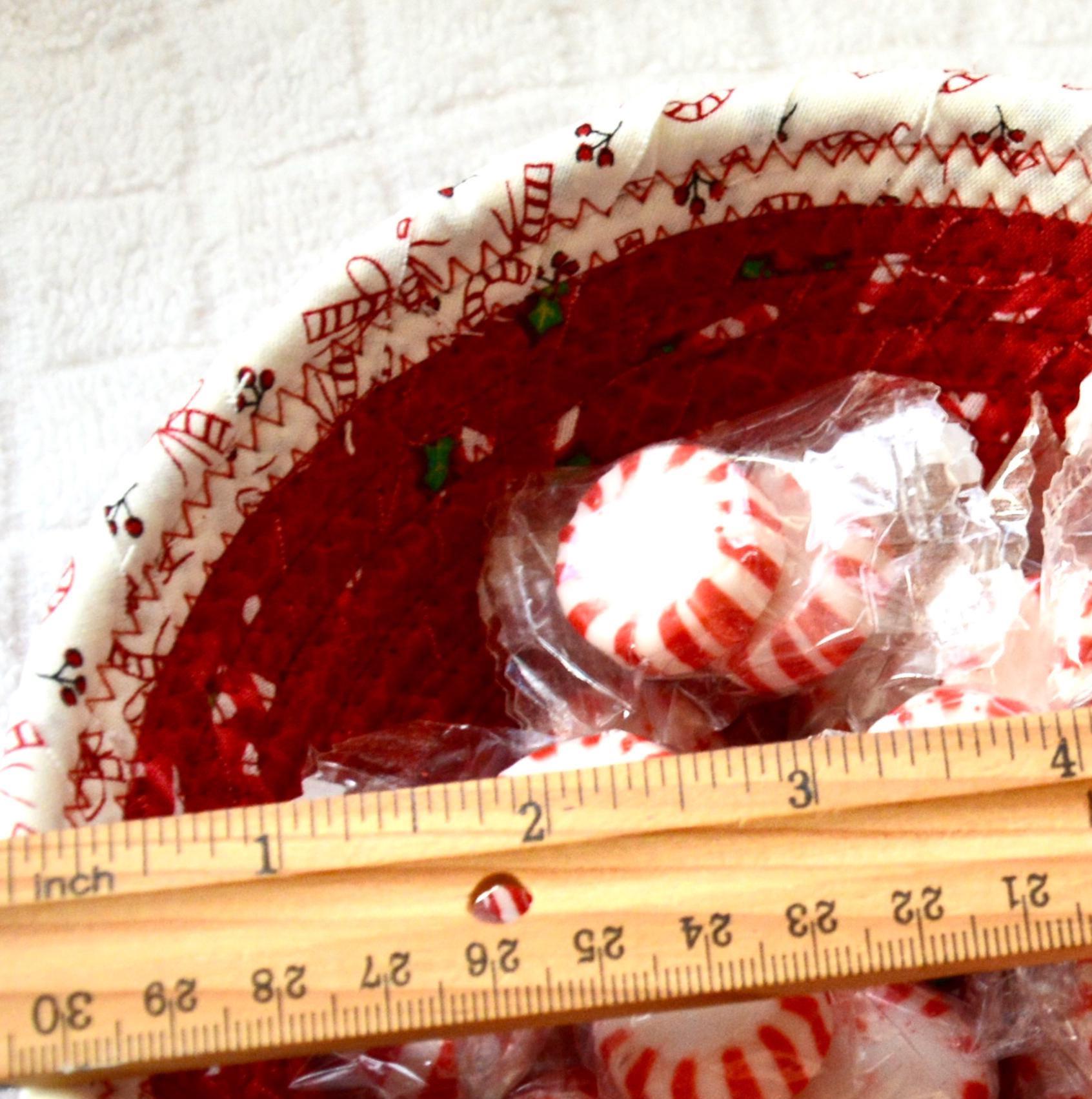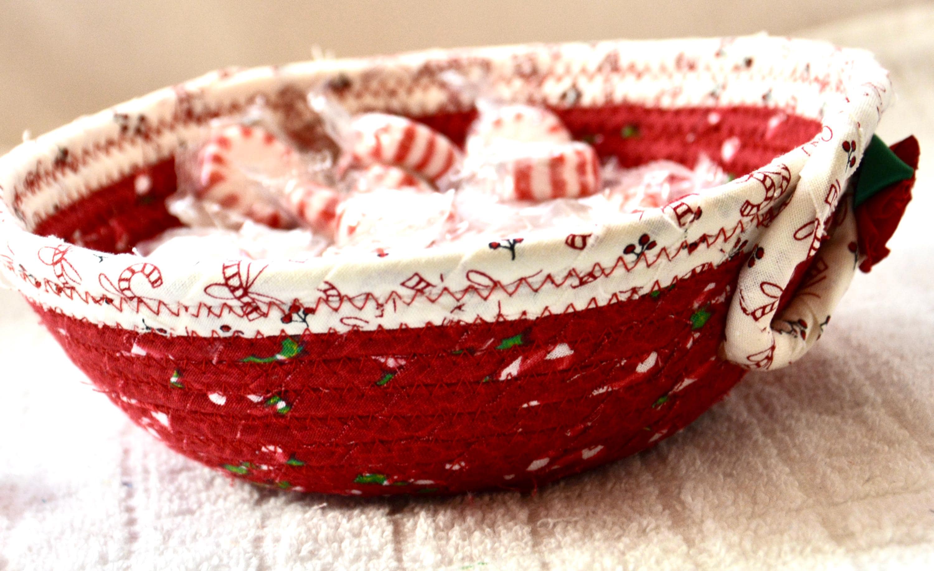 I hand wrapped these rich red Christmas fabrics around cotton line, which I then hand coiled and machine quilted to make it sturdy. I used the raw edge technique with a little fray for a great shabby chic texture. All holiday fabrics show on the inside of the basket too! 100% cotton! The pretty flower on the basket is included for a nice accent.