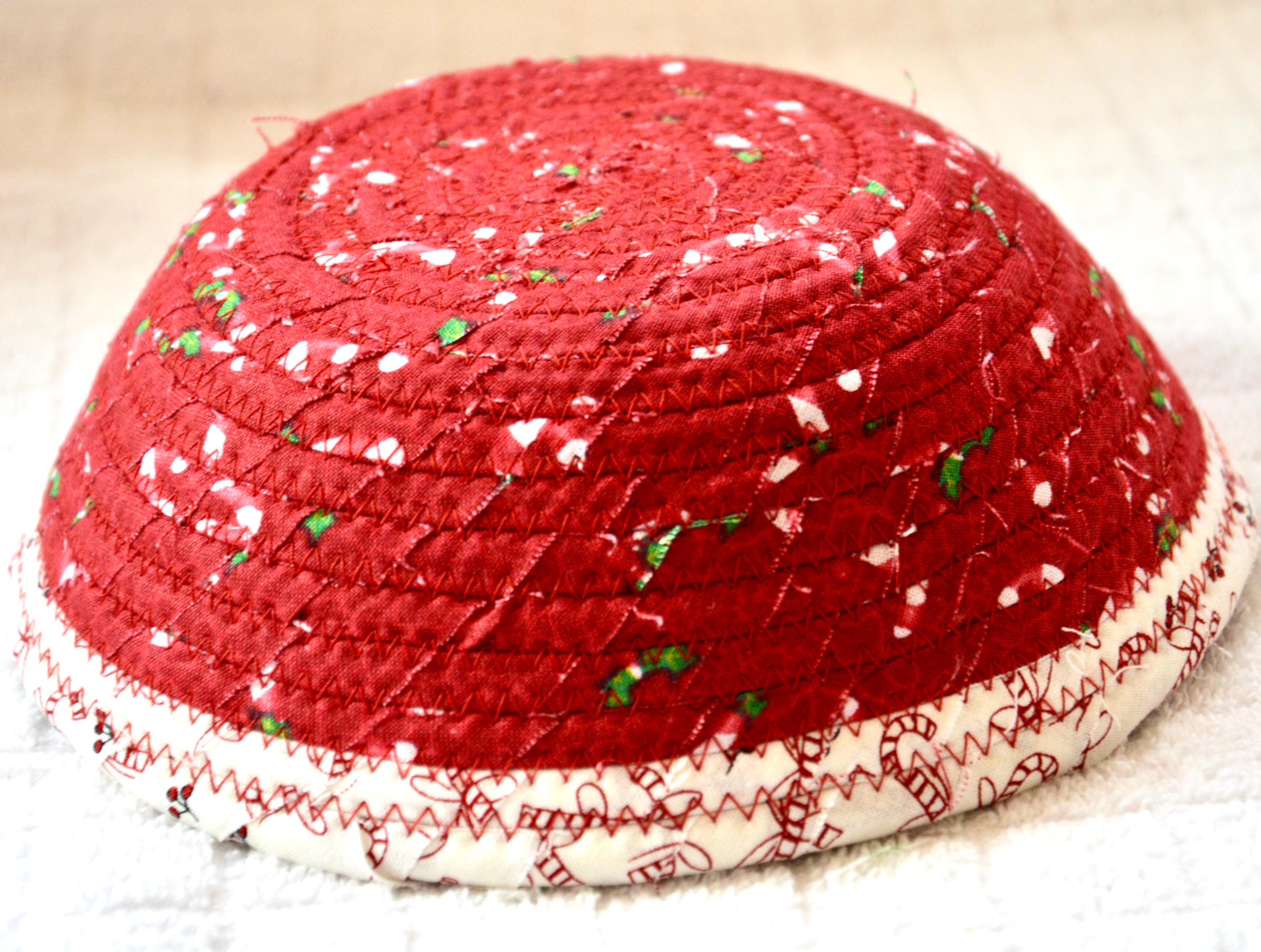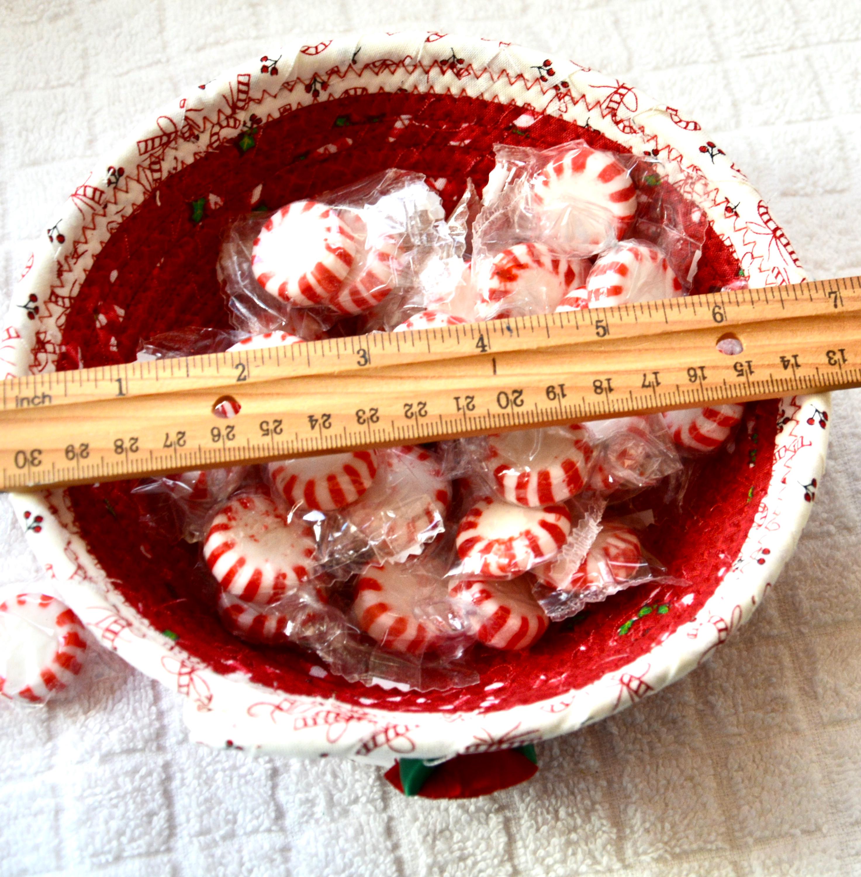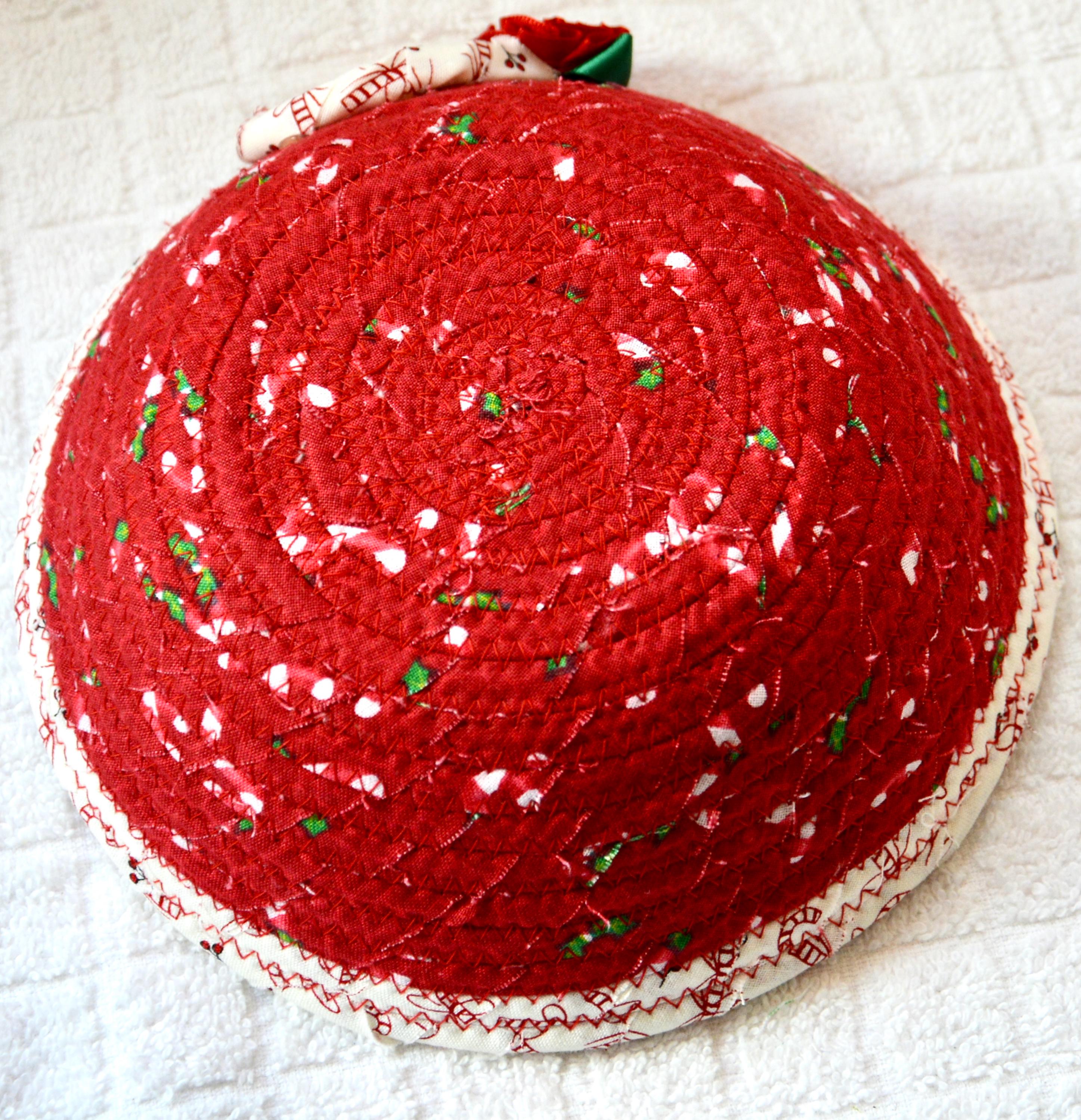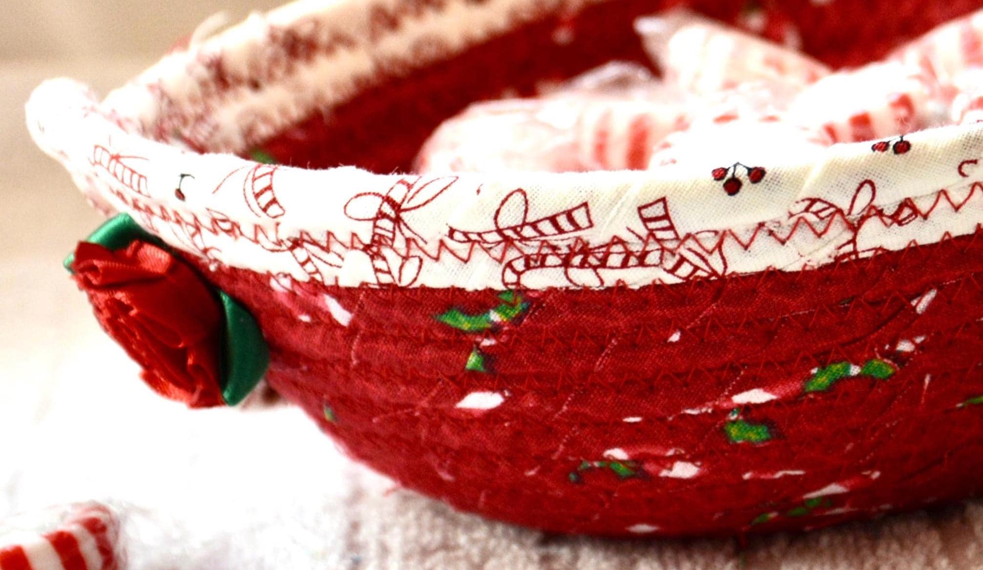 I hand wrapped these rich red Christmas fabrics around cotton line, which I then hand coiled and machine quilted to make it sturdy. I used the raw edge technique with a little fray for a great shabby chic texture. All holiday fabrics show on the inside of the basket too! 100% cotton! The pretty flower on the basket is included for a nice accent.