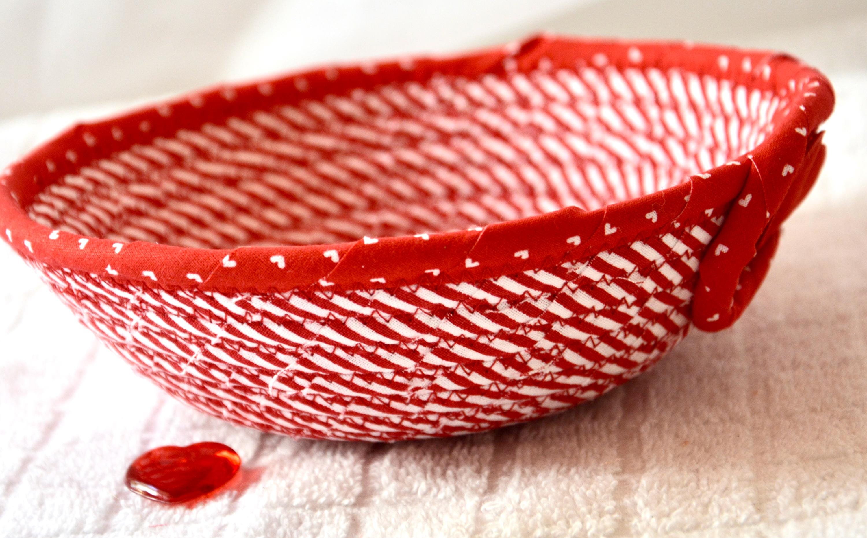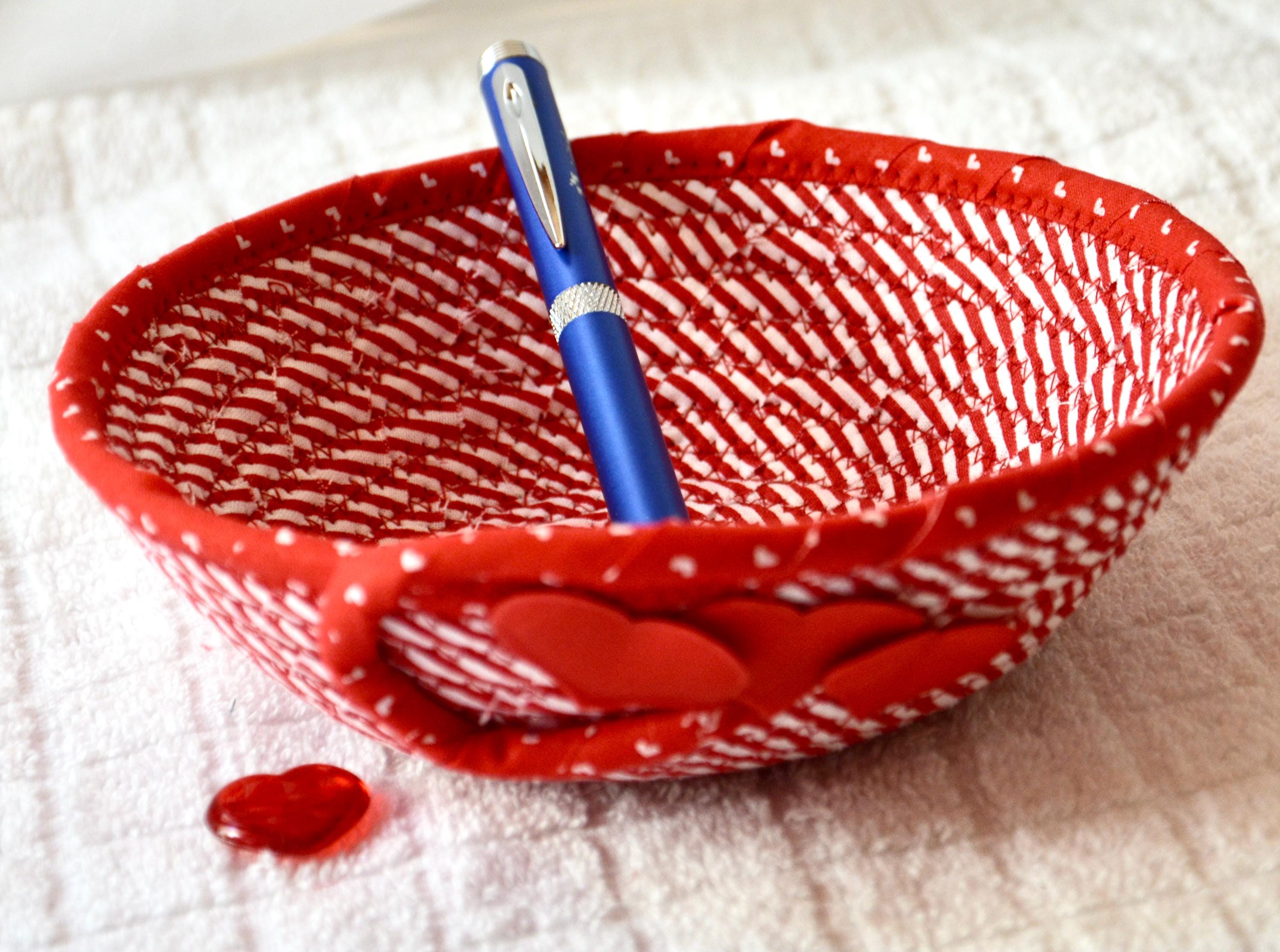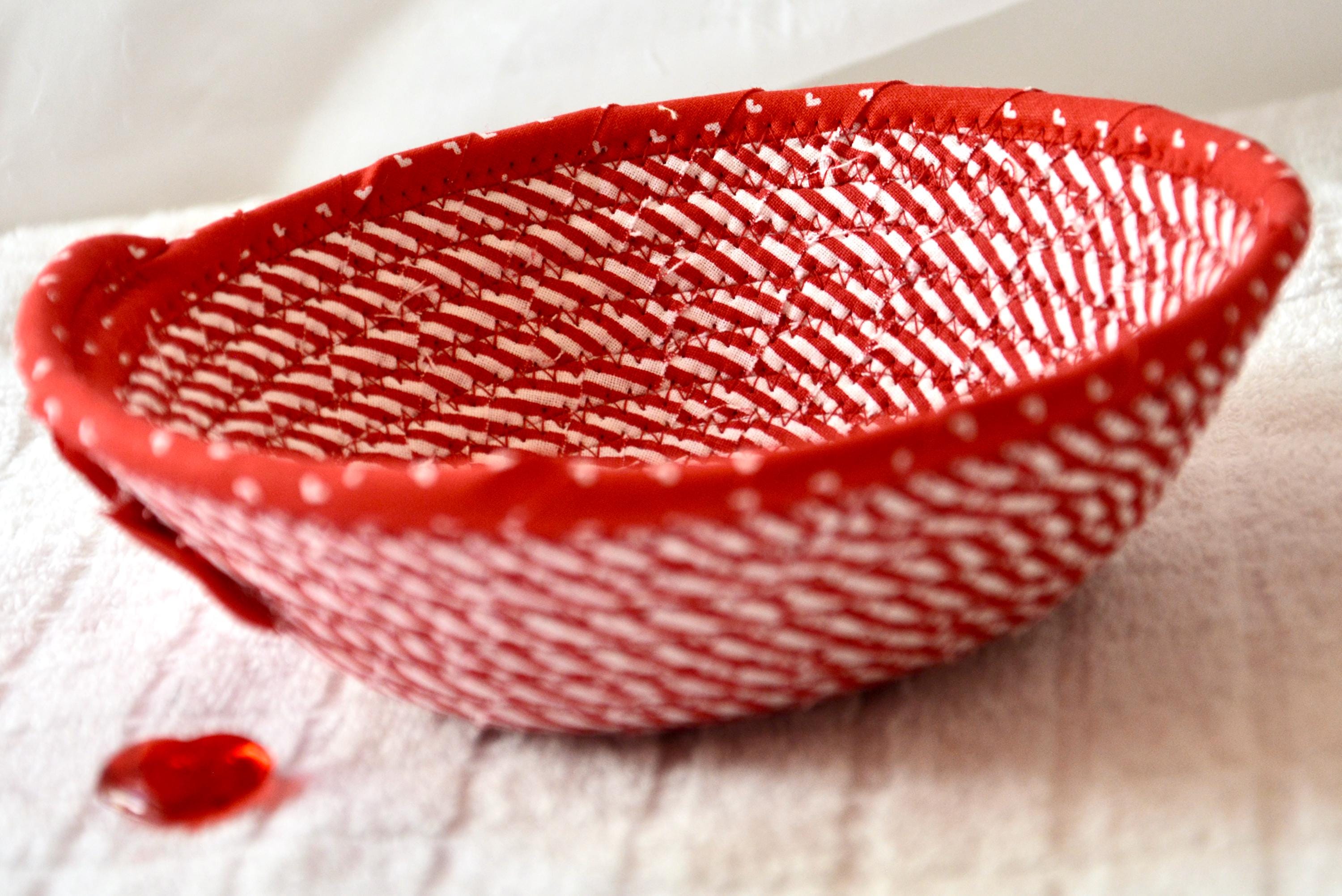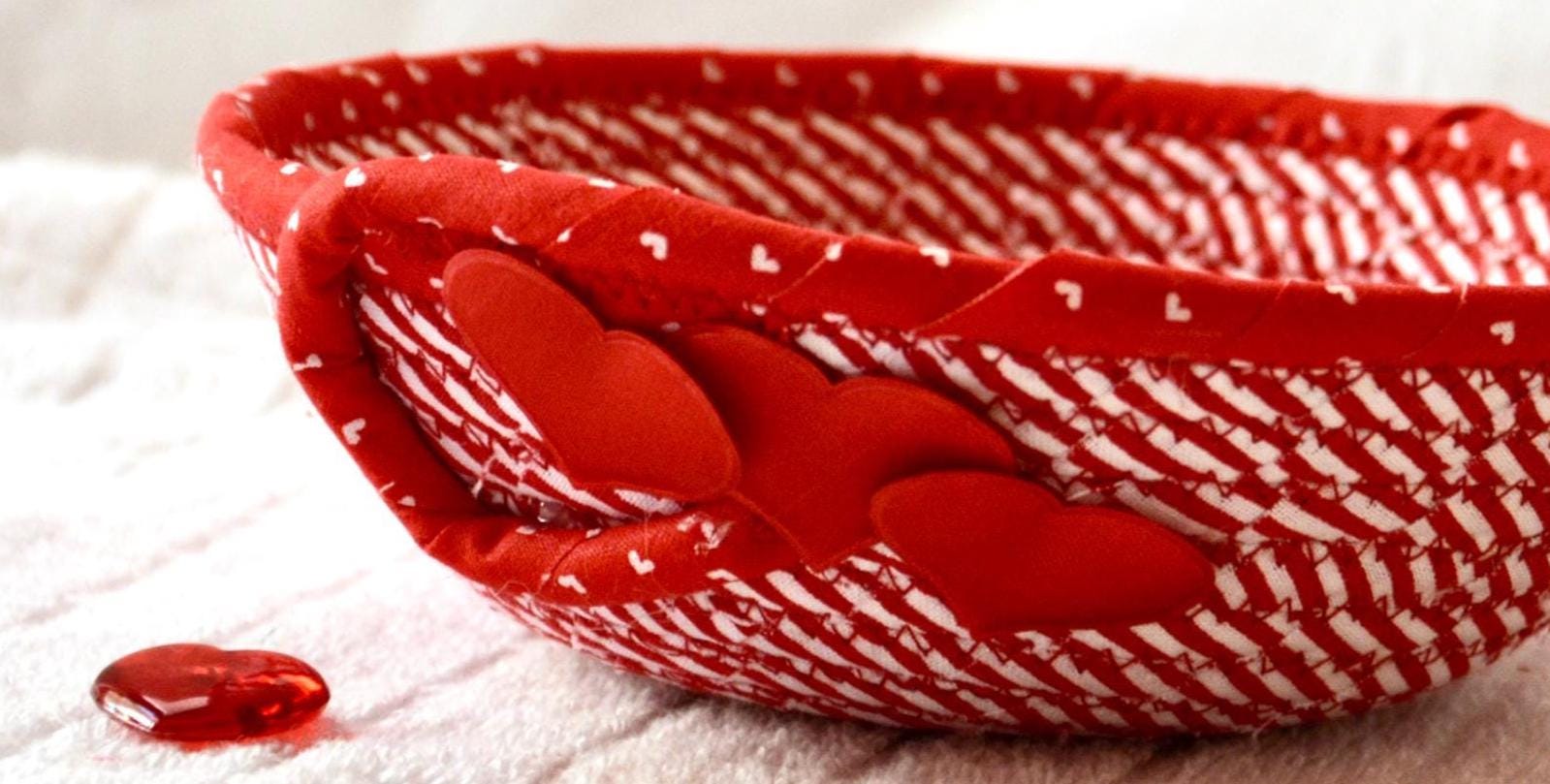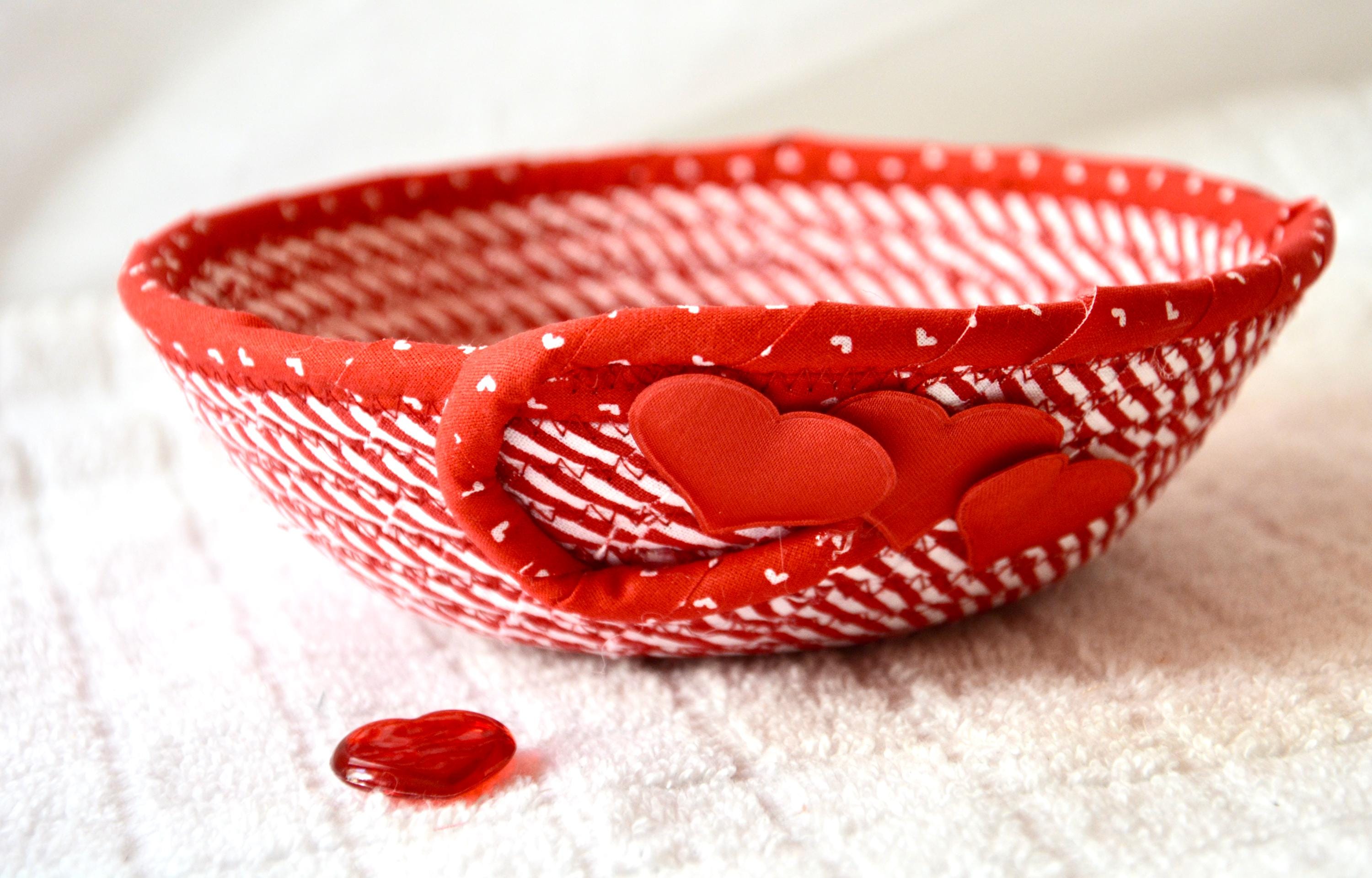 I hand wrapped these wonderful red fabrics around cotton line, which I then hand coiled and machine quilted to make the basket sturdy. I used the raw edge technique with a little fray to give it a lovely shabby chic texture. The cute hearts on the basket are included for a nice accent.