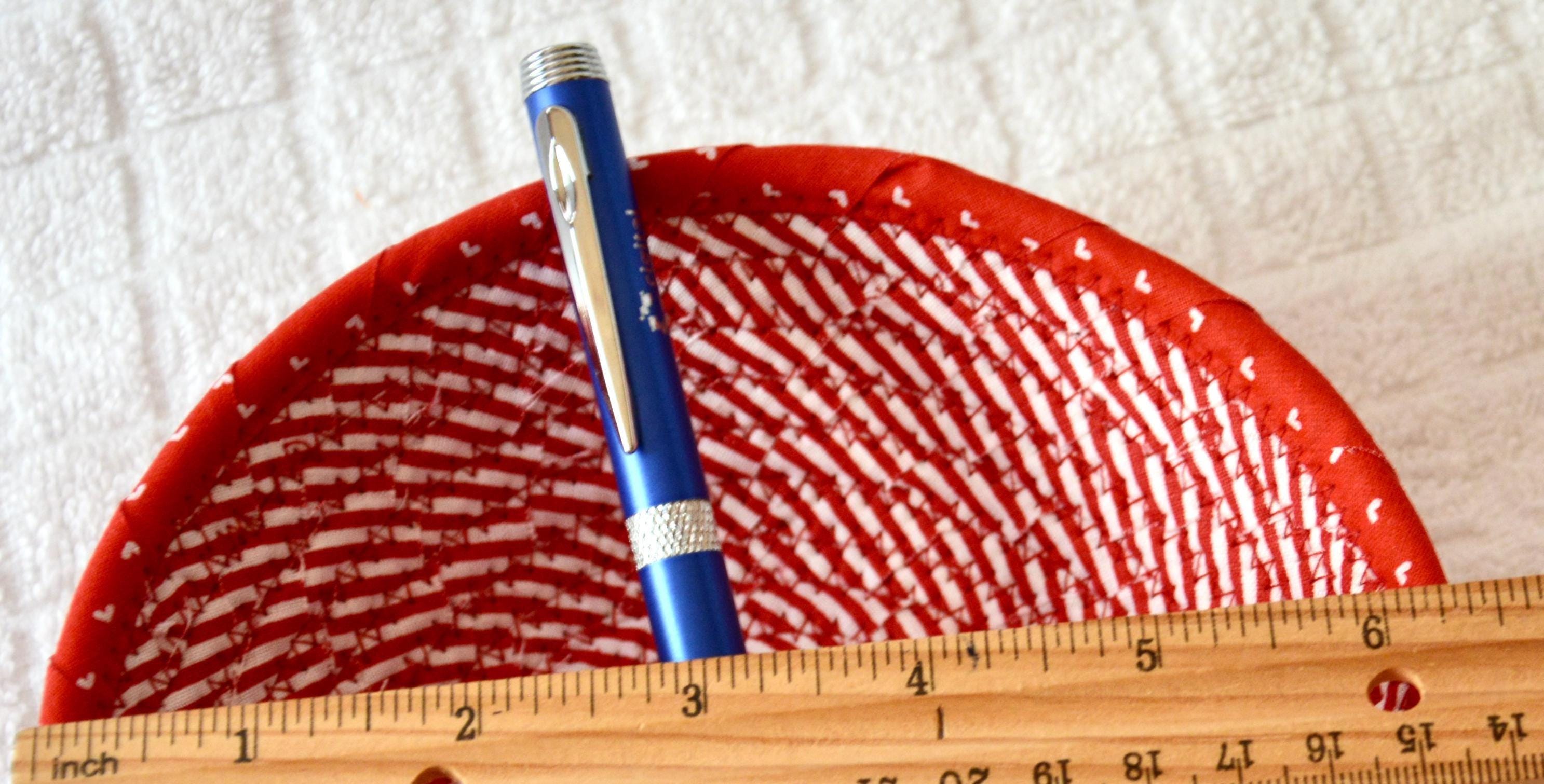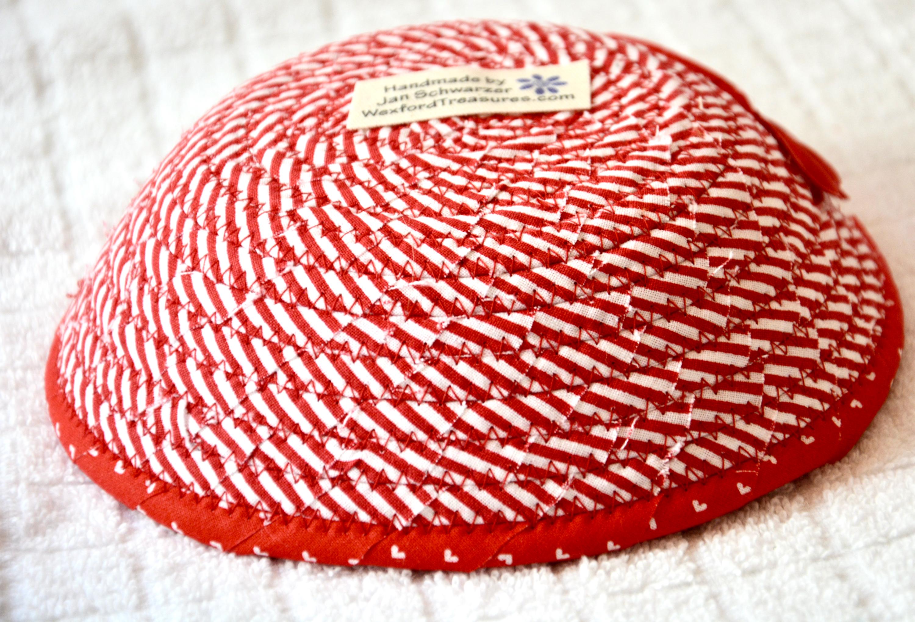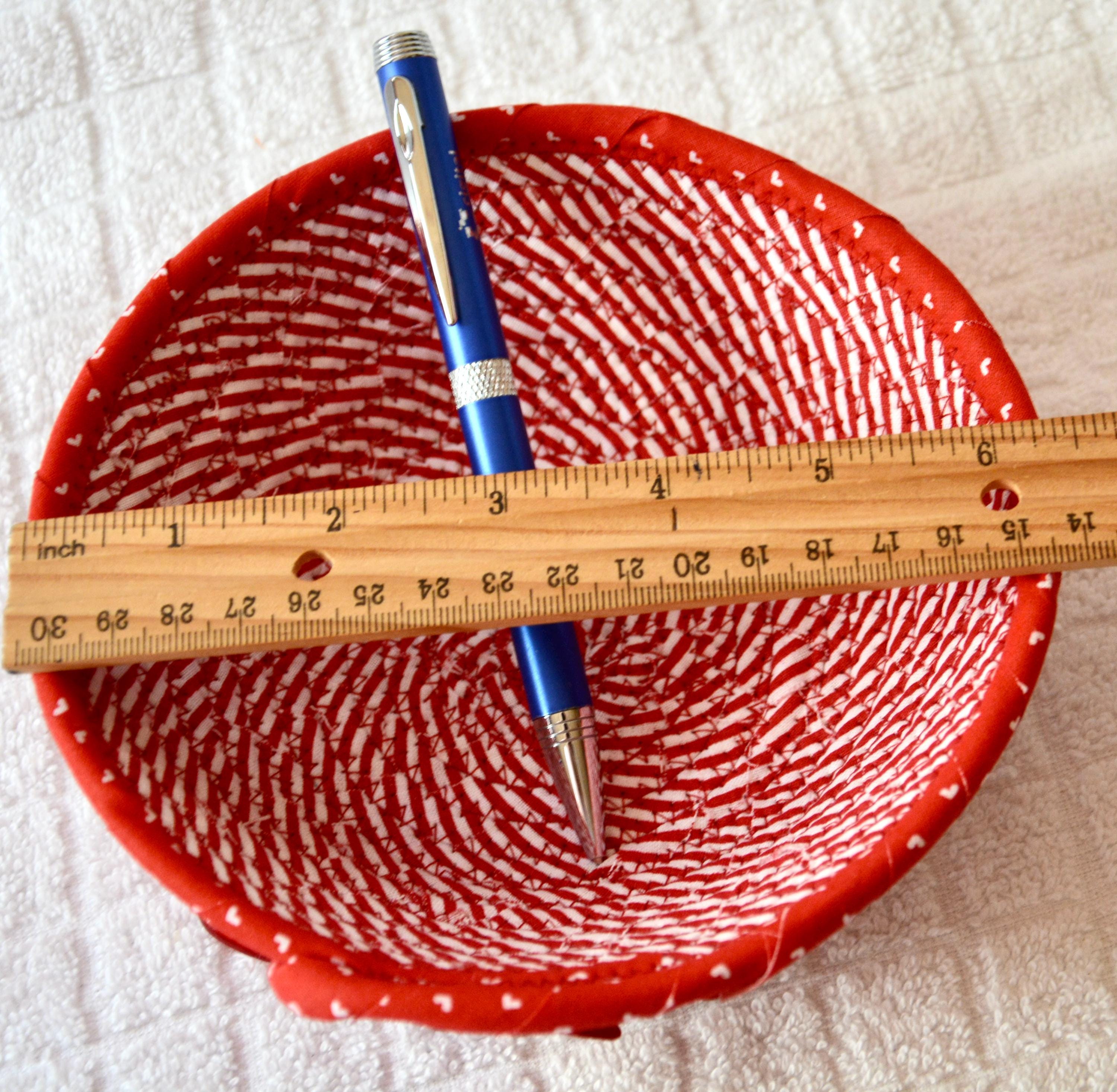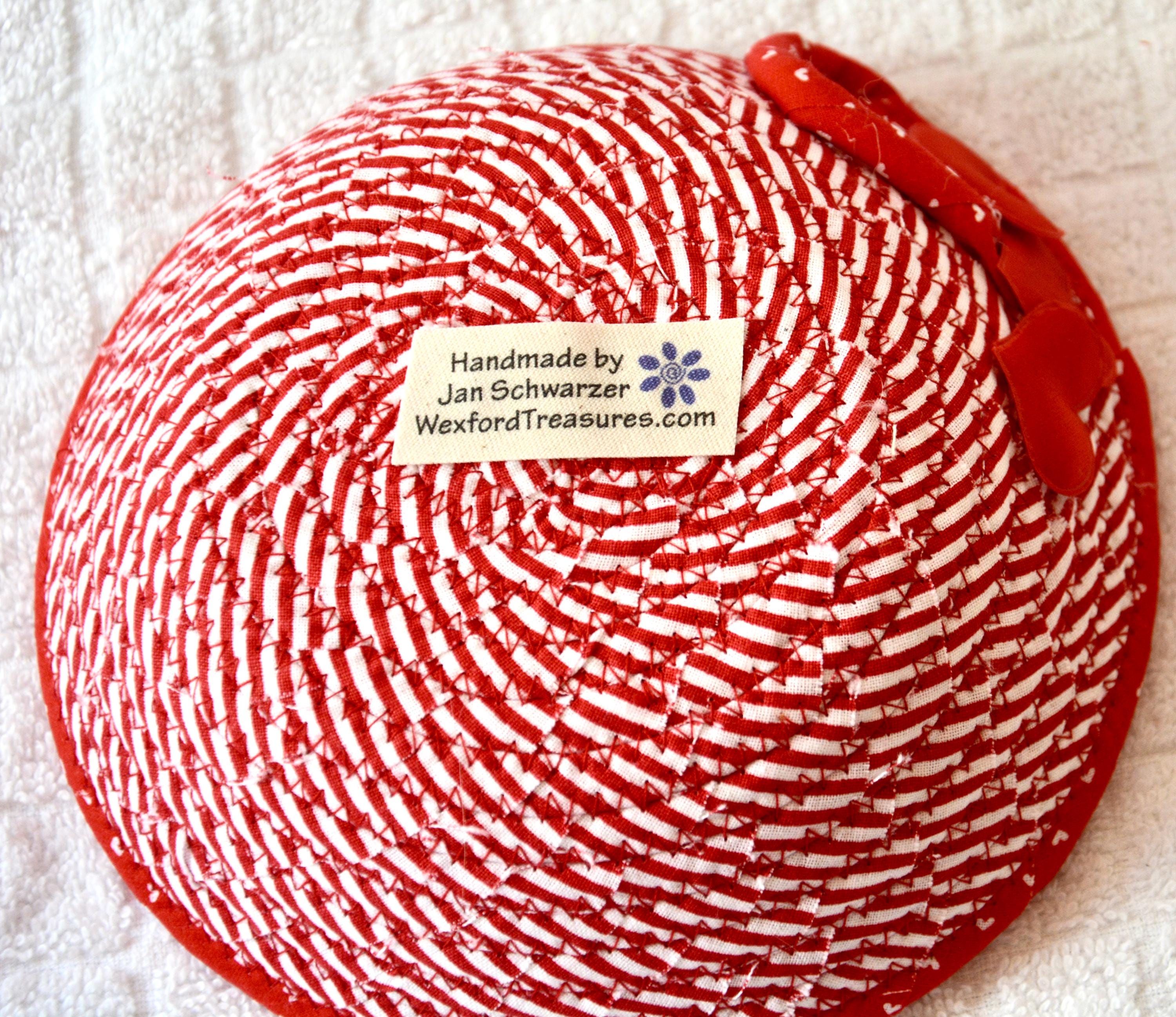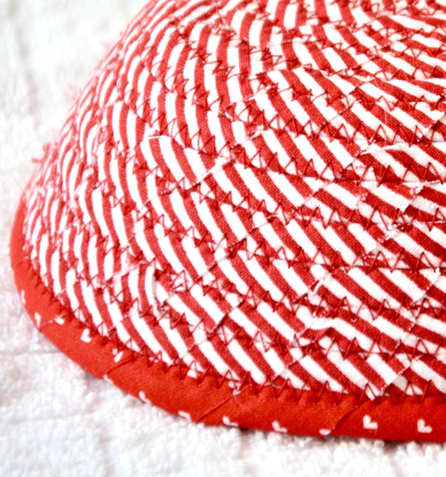 I hand wrapped these wonderful red fabrics around cotton line, which I then hand coiled and machine quilted to make the basket sturdy. I used the raw edge technique with a little fray to give it a lovely shabby chic texture. The cute hearts on the basket are included for a nice accent.