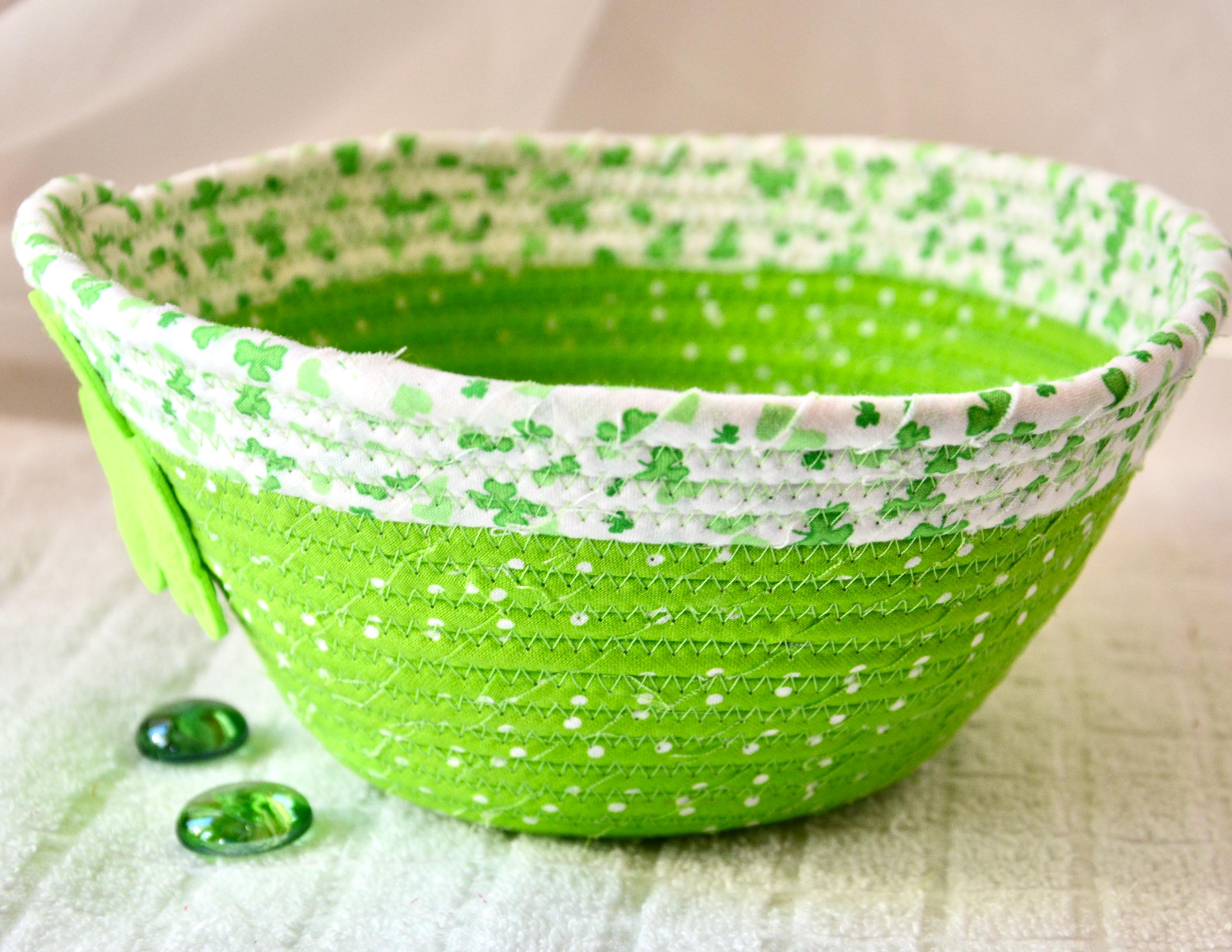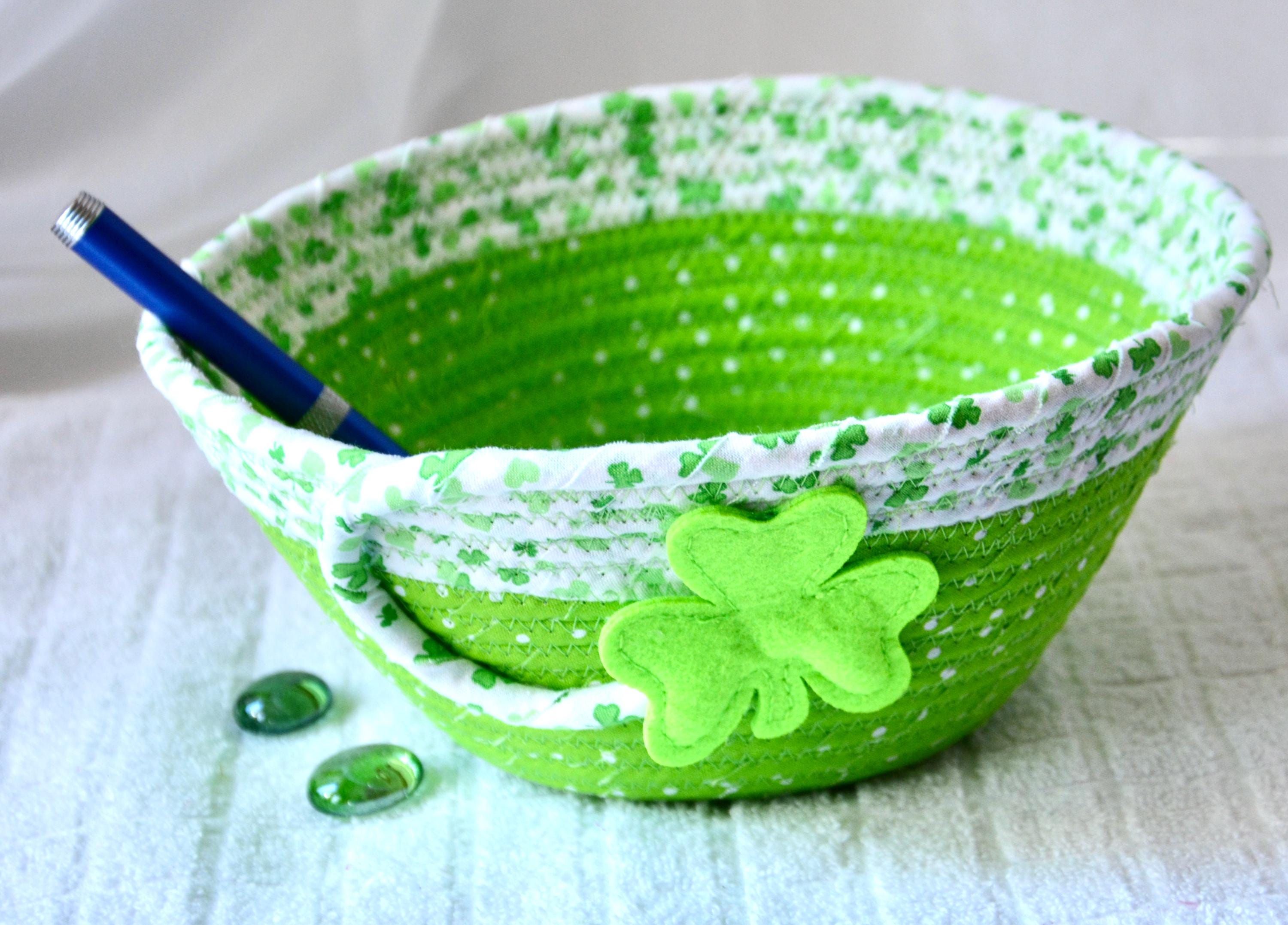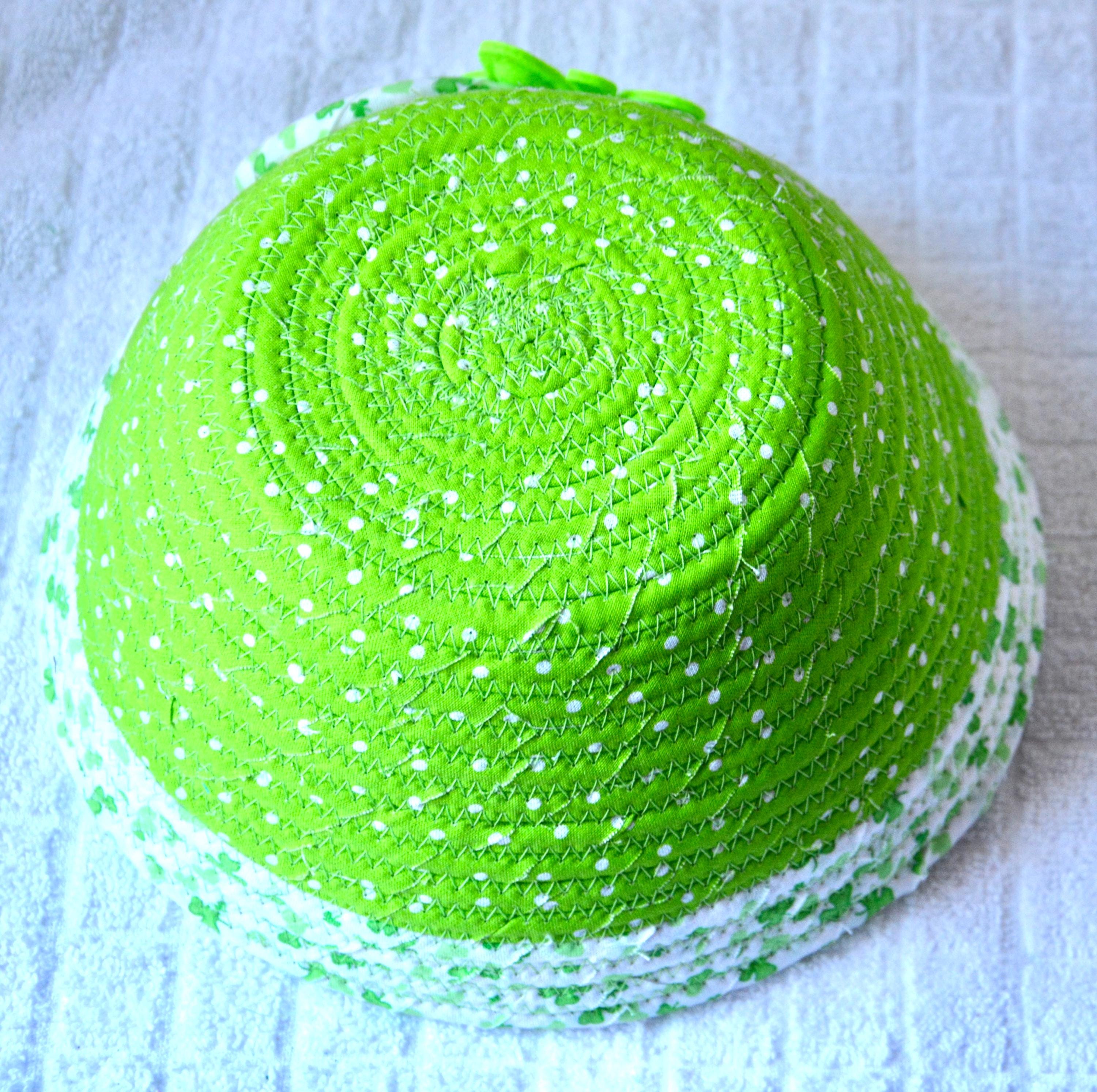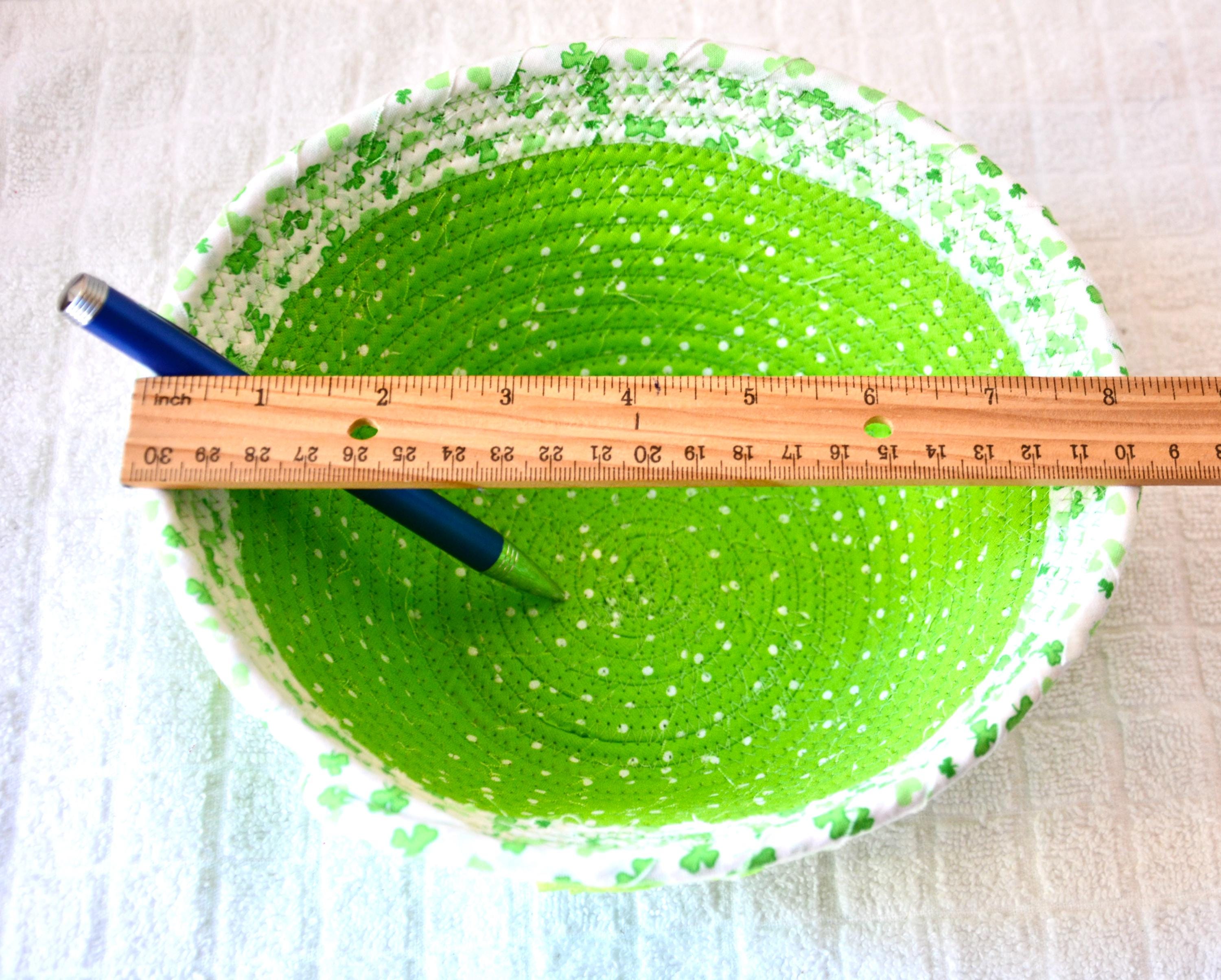 I hand wrapped these wonderful green fabrics around cotton line, which I then hand coiled and machine quilted to make the basket sturdy. I used the raw edge technique with a little fray to give it a lovely shabby chic texture. All of these cute fabrics are 100% cotton and show on the inside of the basket too! Please see the picture with the pen and ruler to help gauge the size of this lovely basket.