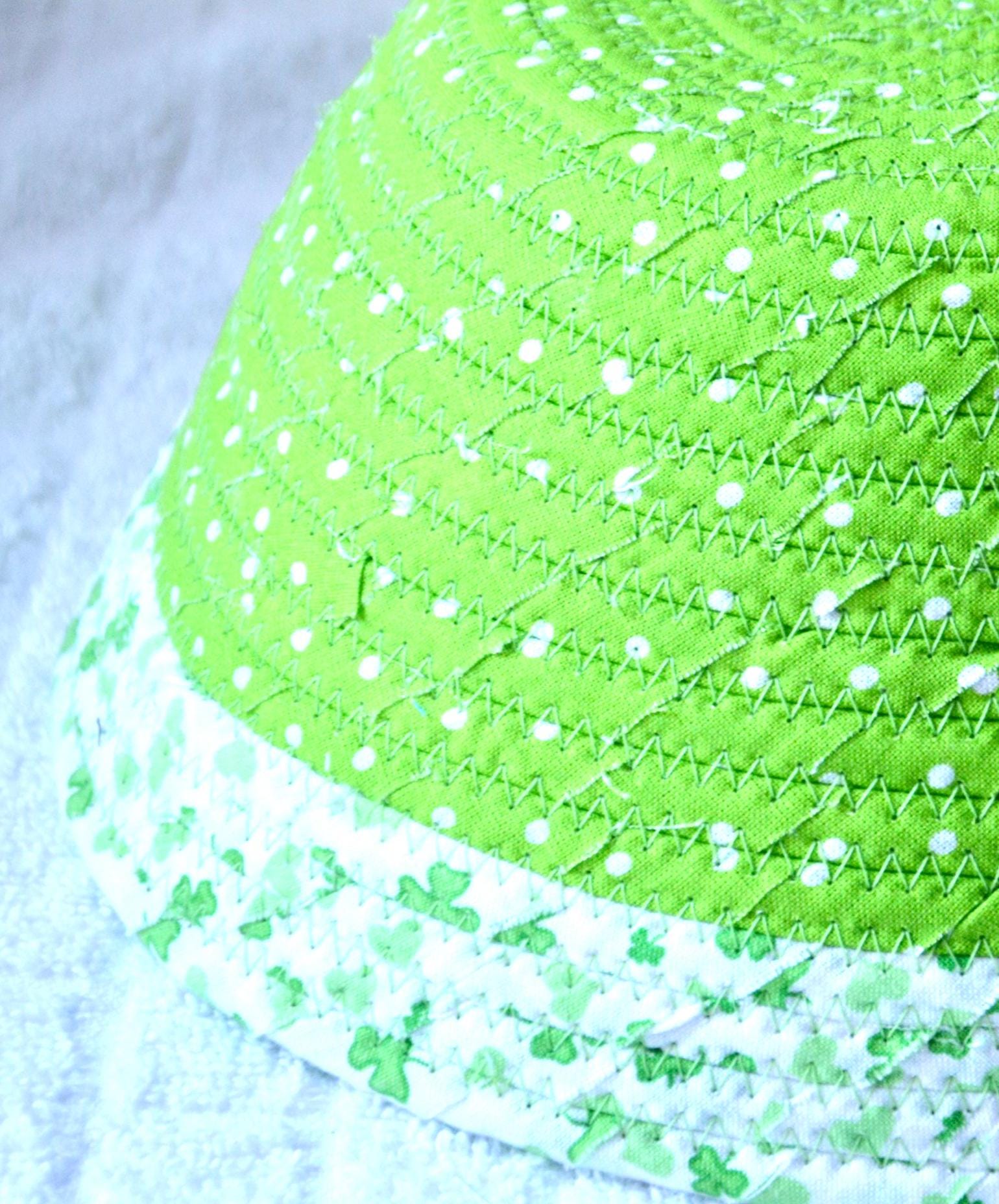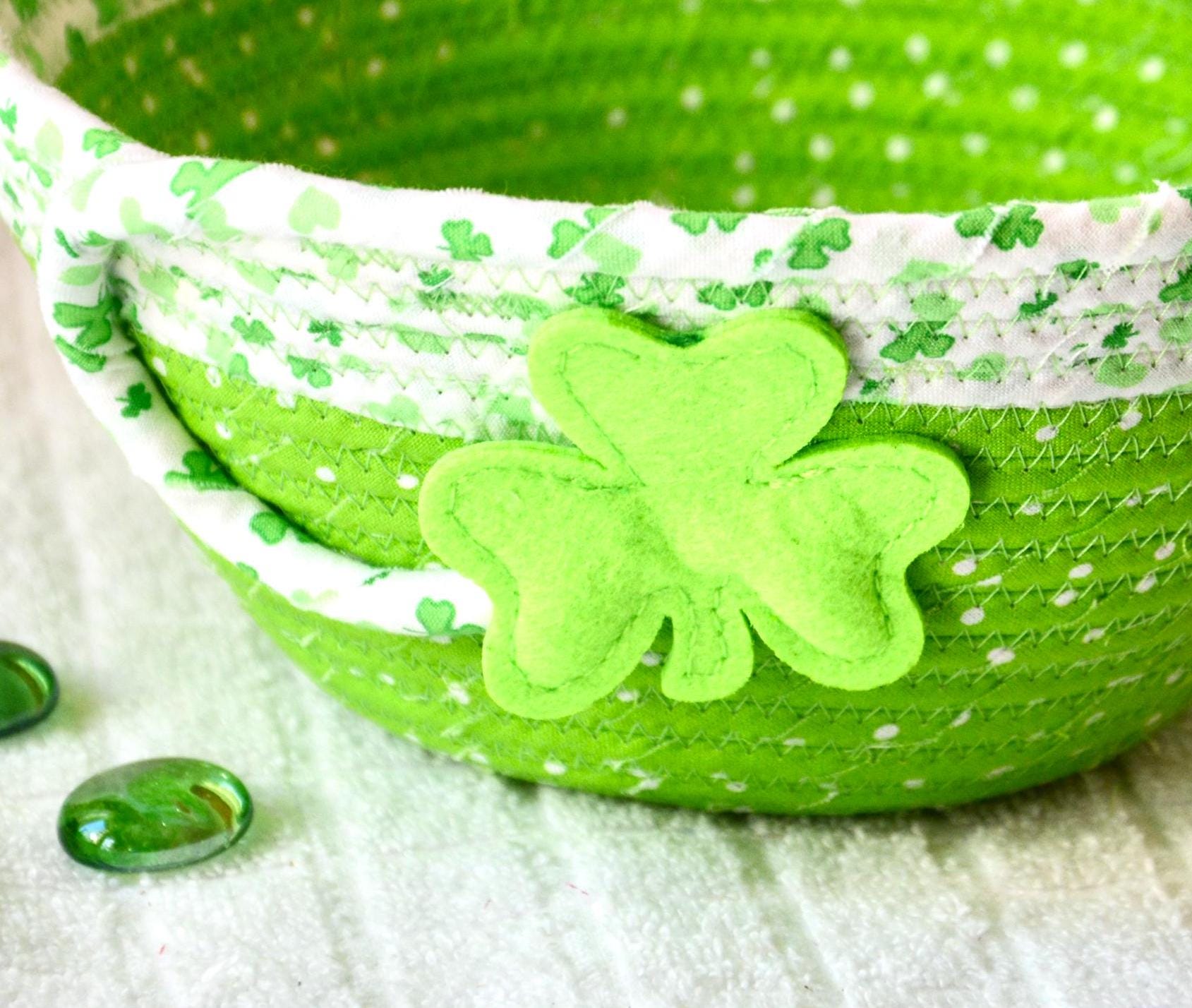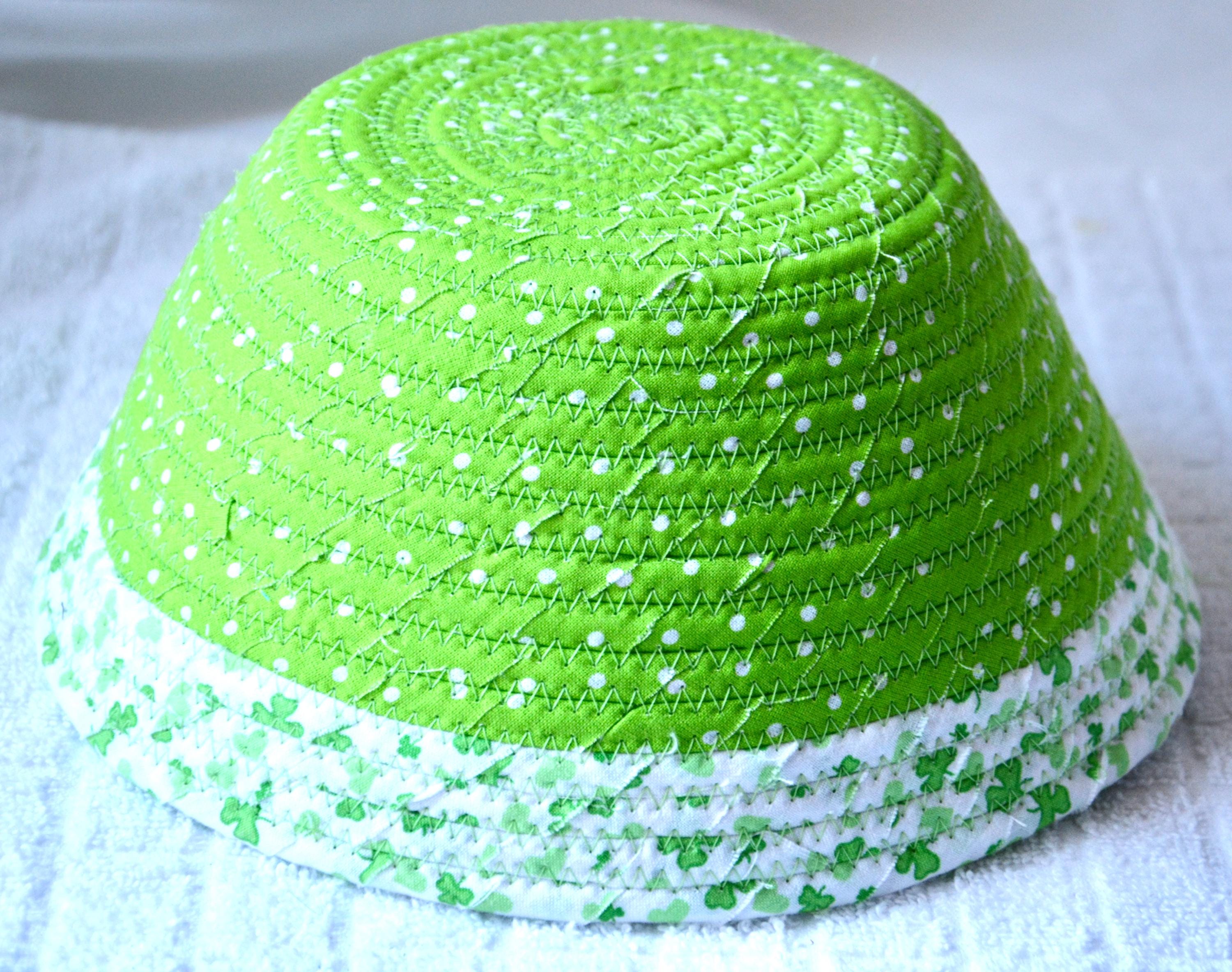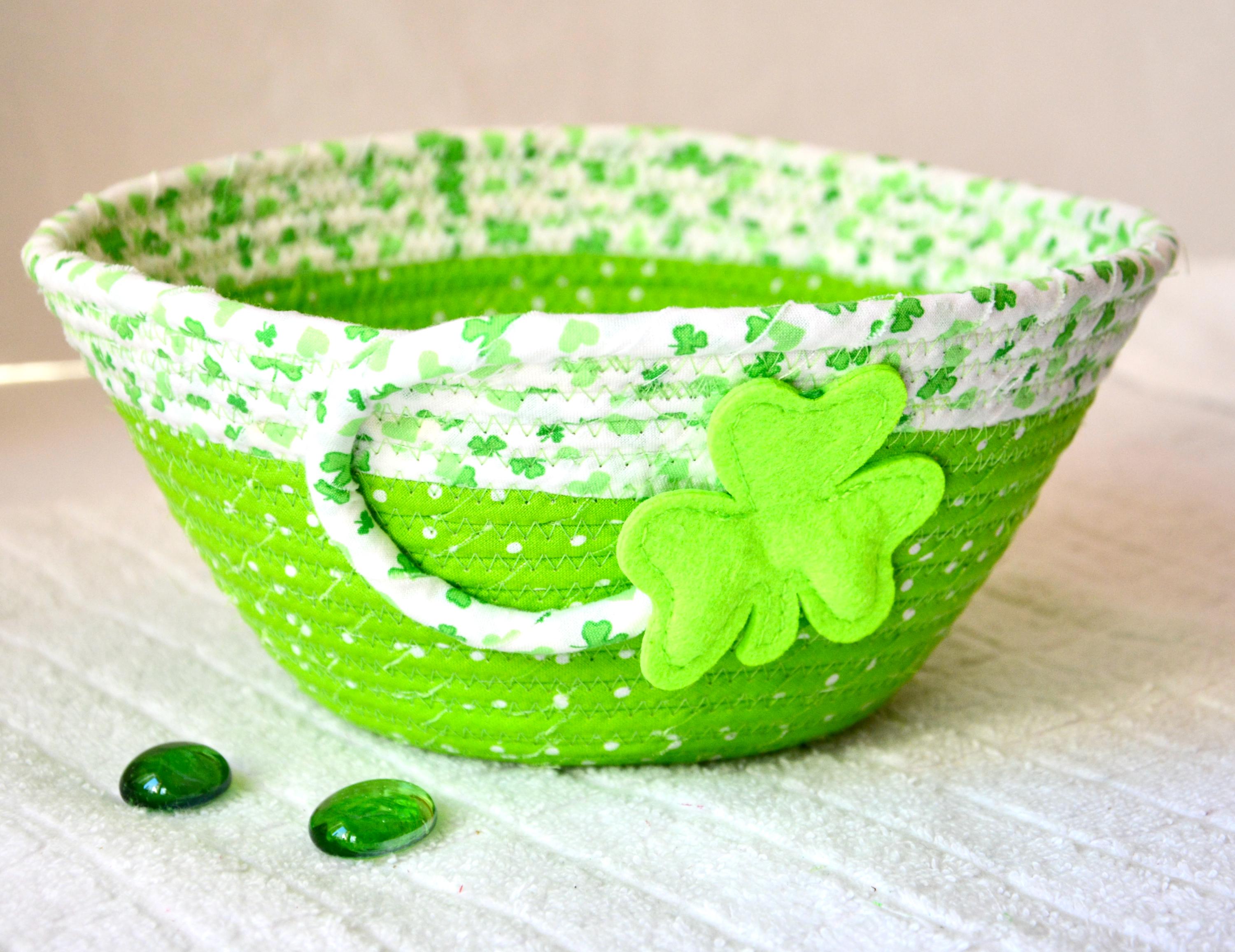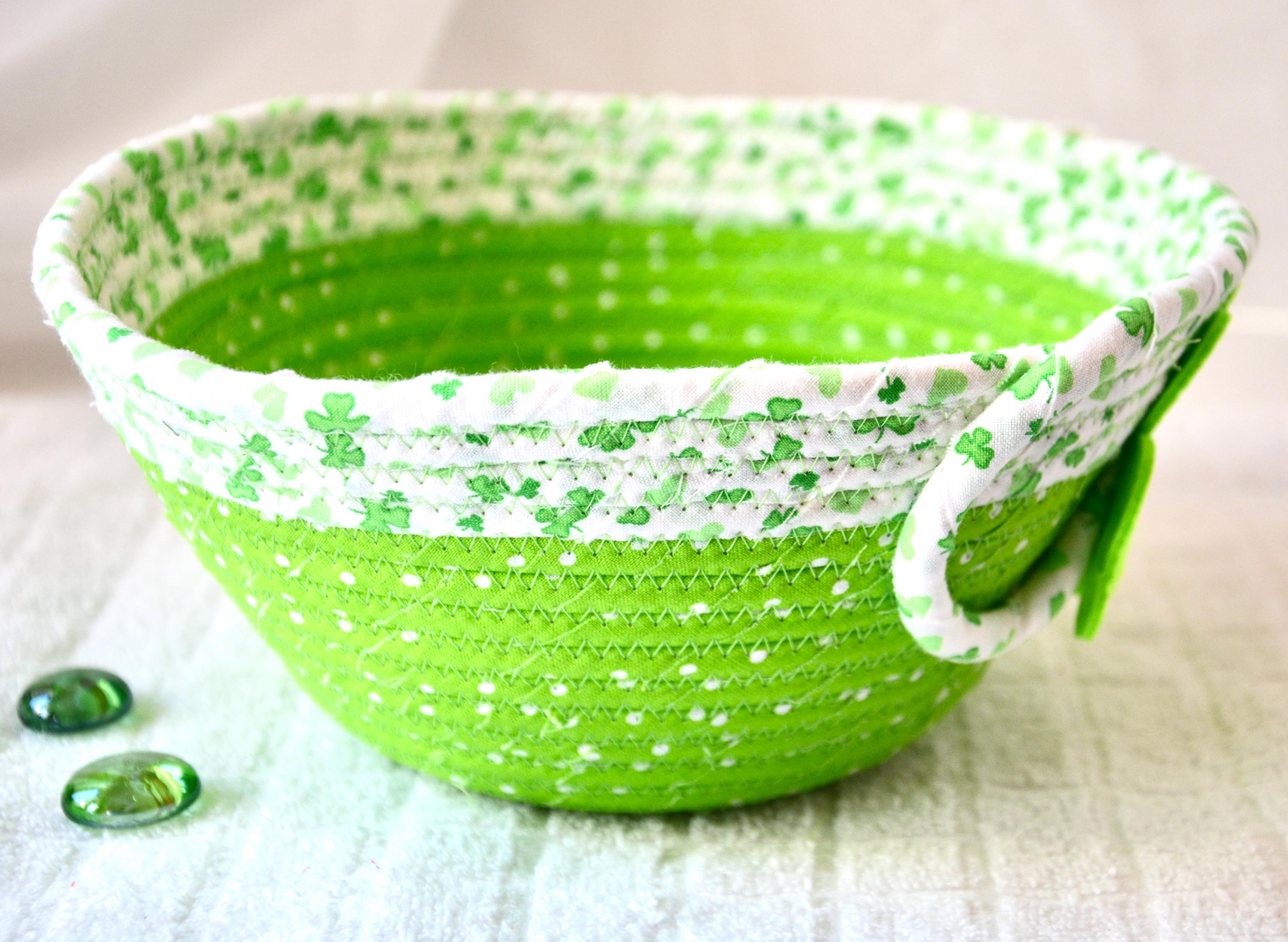 I hand wrapped these wonderful green fabrics around cotton line, which I then hand coiled and machine quilted to make the basket sturdy. I used the raw edge technique with a little fray to give it a lovely shabby chic texture. All of these cute fabrics are 100% cotton and show on the inside of the basket too! Please see the picture with the pen and ruler to help gauge the size of this lovely basket.