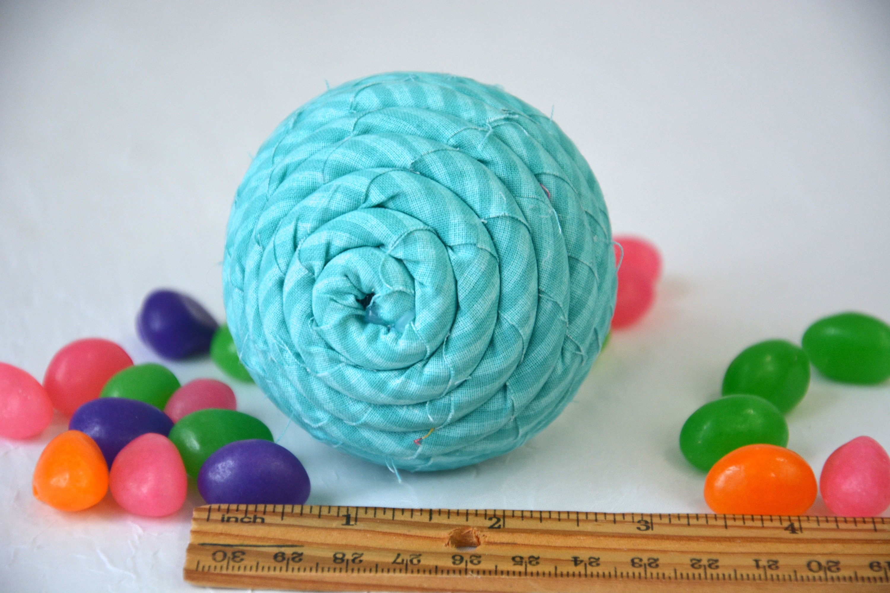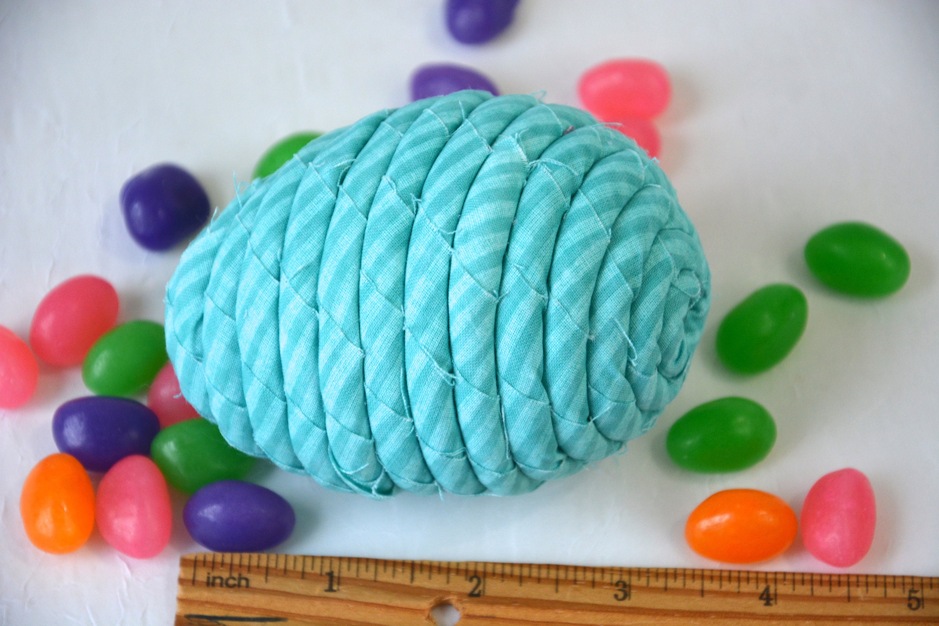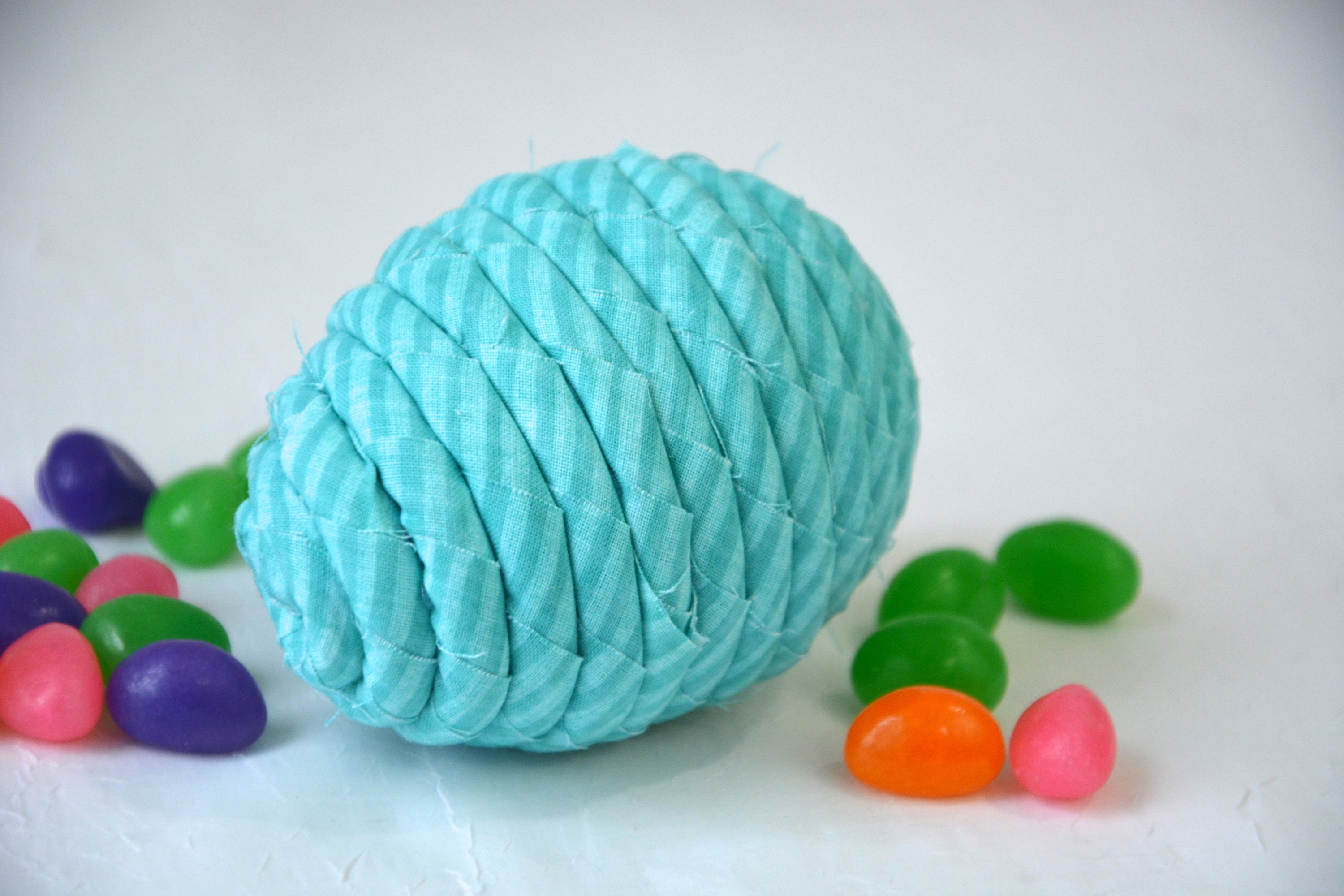 I hand wrapped this lovely aqua blue fabric around cotton line which I than hand coiled into an Easter Egg shape. The fabric edge is unfinished for a lovely shabby chic texture. I just love this pretty fabric, it created a unique pattern. I added a couple of buttons to make a musical sound. I designed and created this lovely Easter egg in my smoke free home studio. Color placement will vary. Jelly bean, ruler props not included. Egg does not open. Filled with buttons for fun rattle. Spot clean.