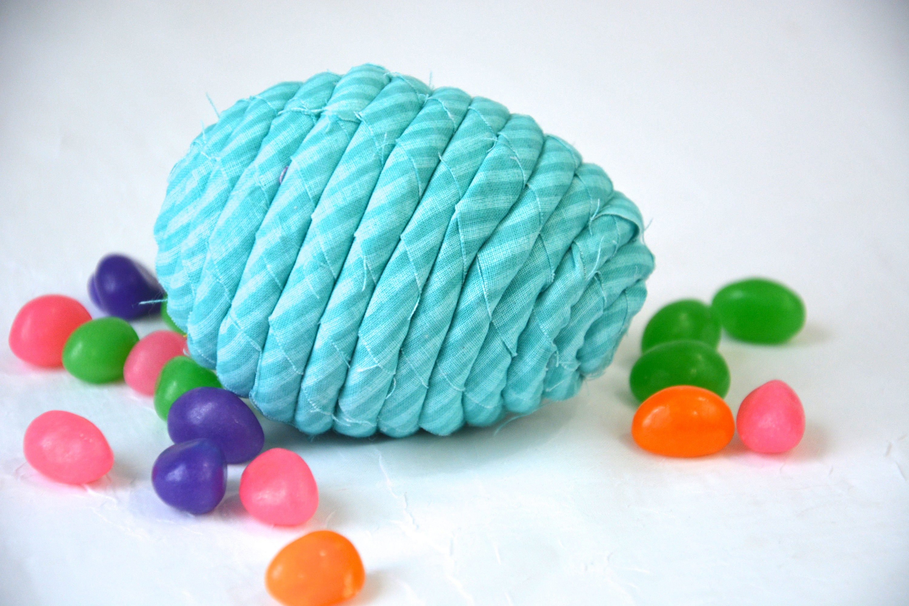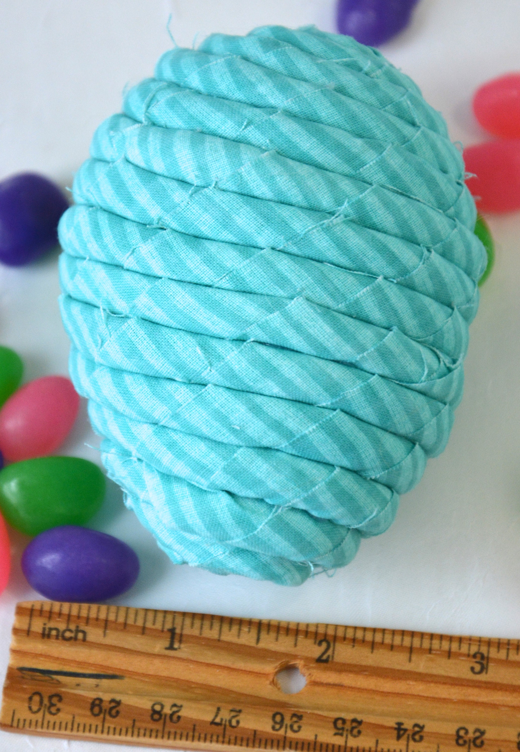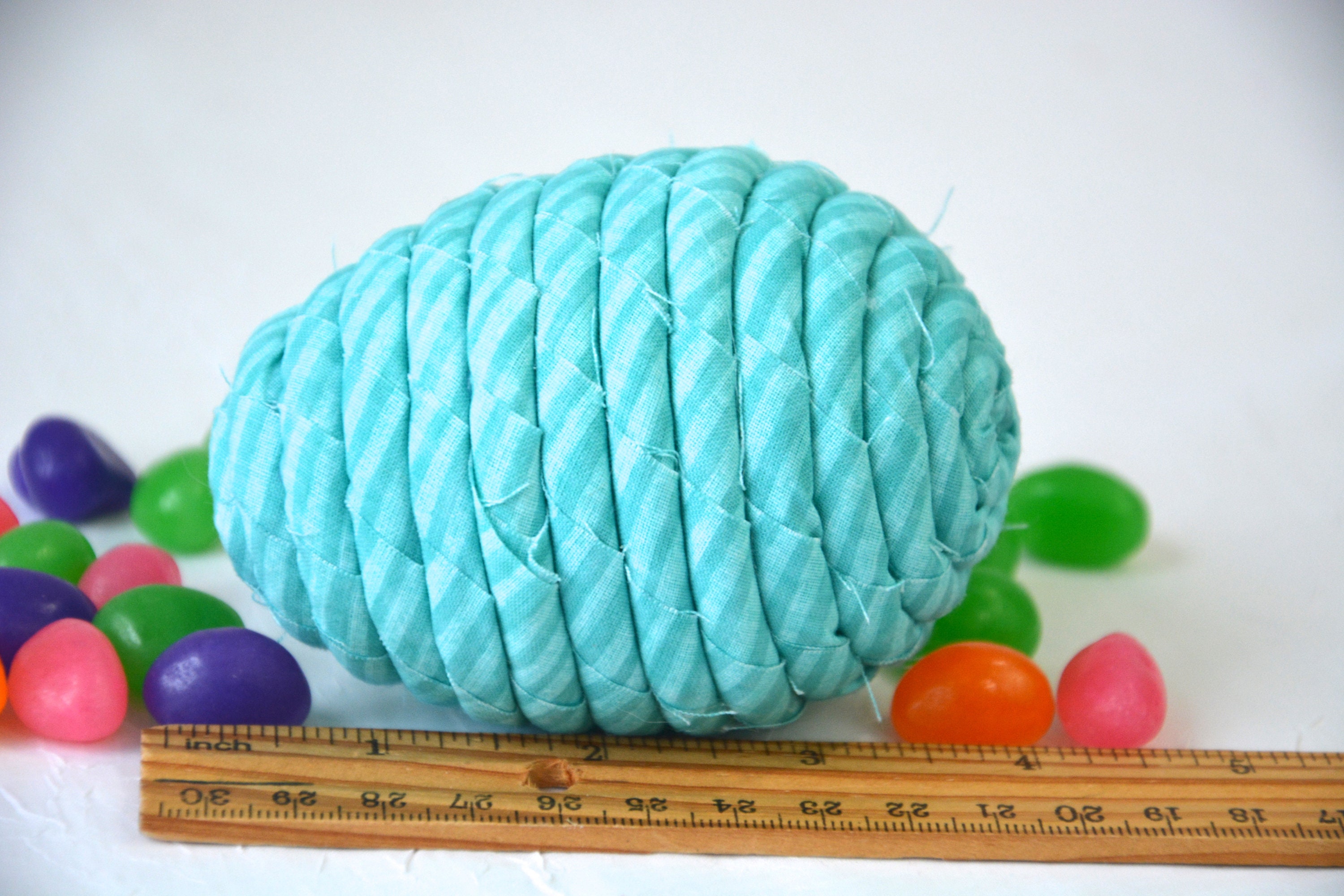 I hand wrapped this lovely aqua blue fabric around cotton line which I than hand coiled into an Easter Egg shape. The fabric edge is unfinished for a lovely shabby chic texture. I just love this pretty fabric, it created a unique pattern. I added a couple of buttons to make a musical sound. I designed and created this lovely Easter egg in my smoke free home studio. Color placement will vary. Jelly bean, ruler props not included. Egg does not open. Filled with buttons for fun rattle. Spot clean.