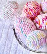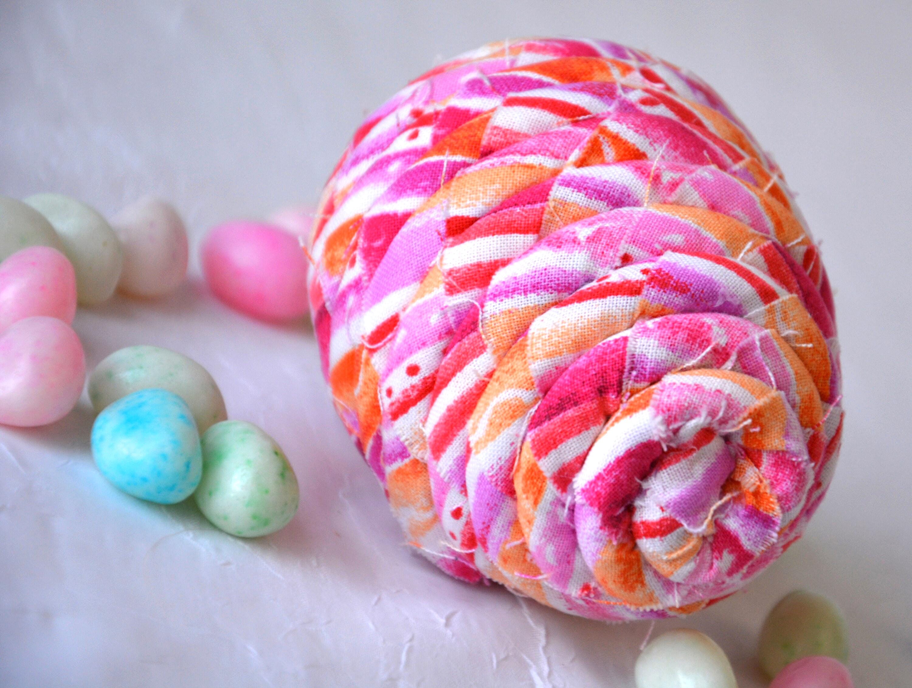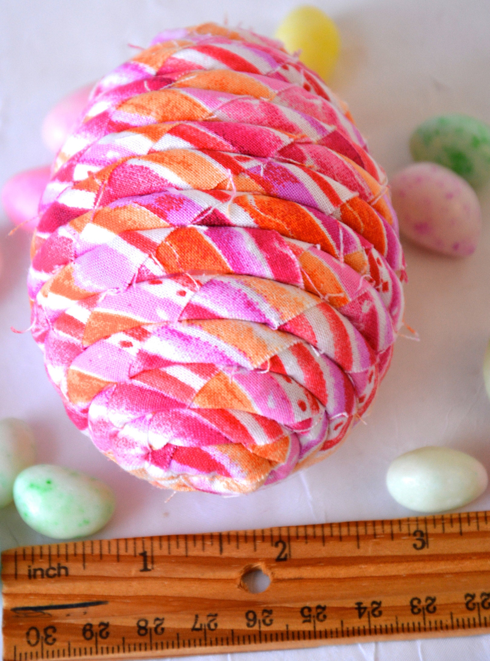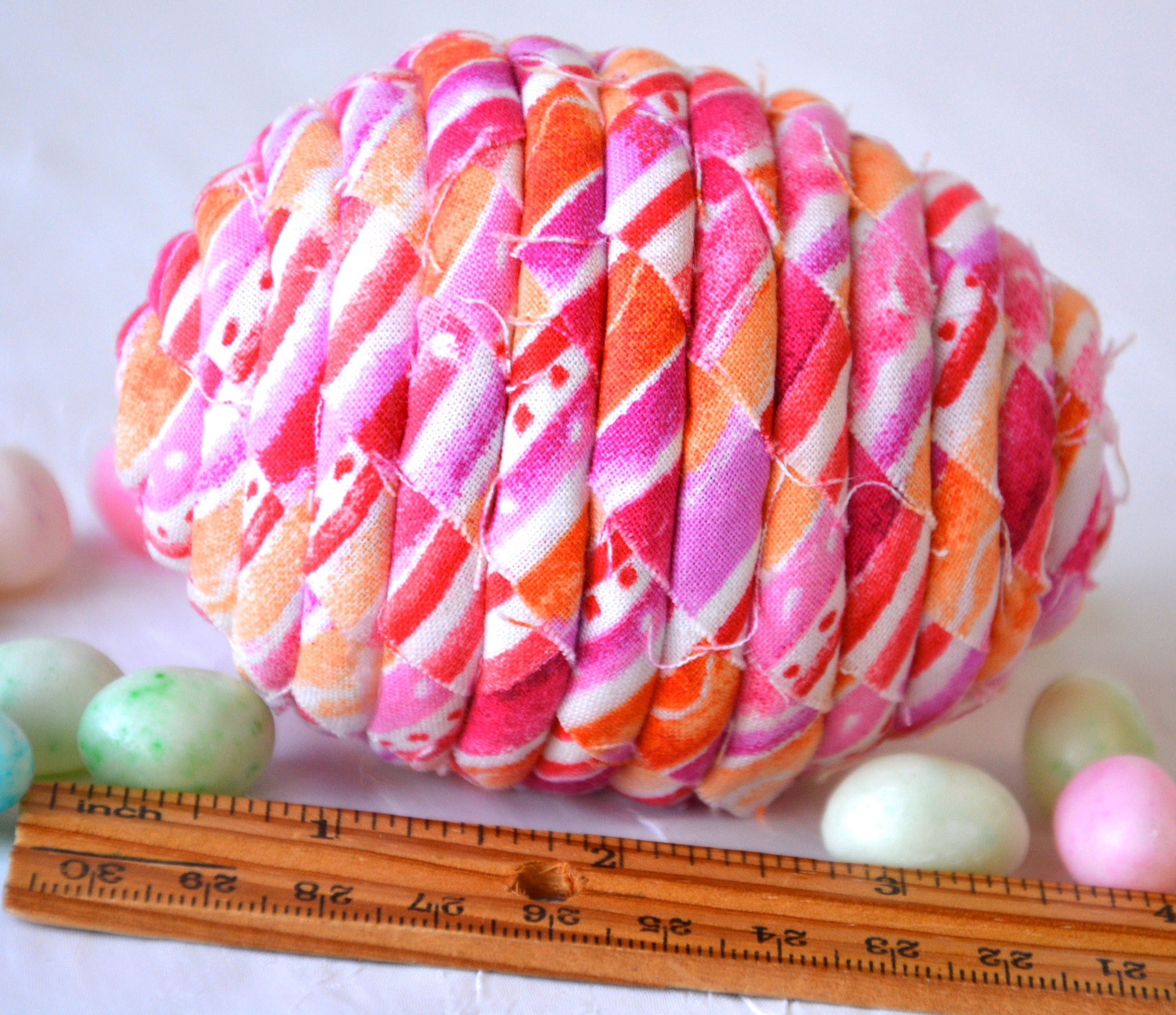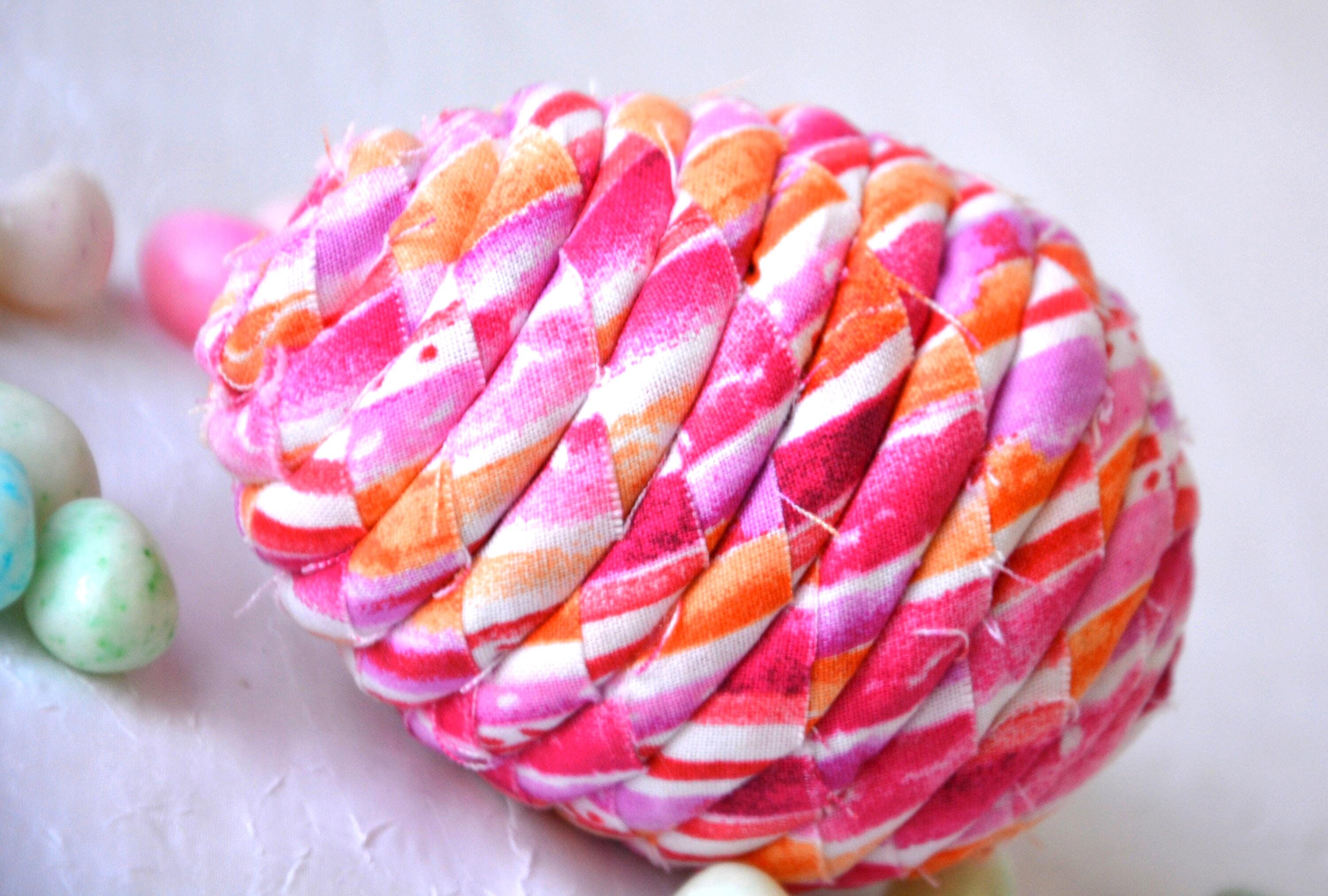 I hand wrapped this lovely pink fabric around cotton line which I than hand coiled into an Easter Egg shape. The fabric edge is unfinished for a lovely shabby chic texture. I added a few buttons to make a fun musical shaker. Egg does not open.