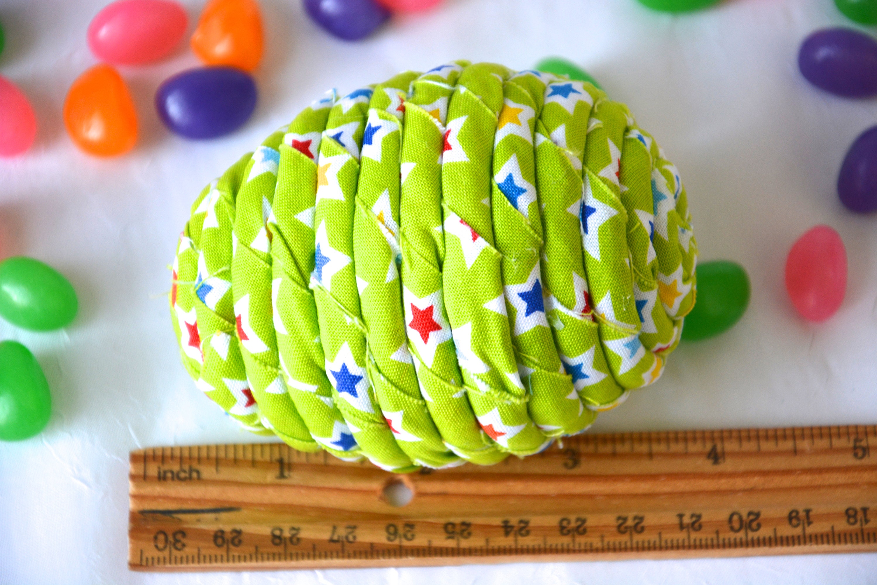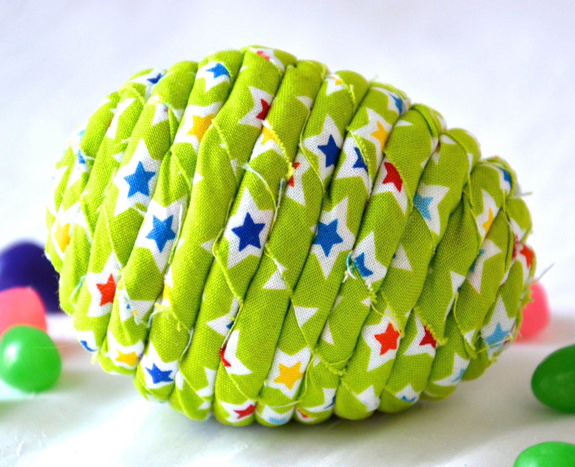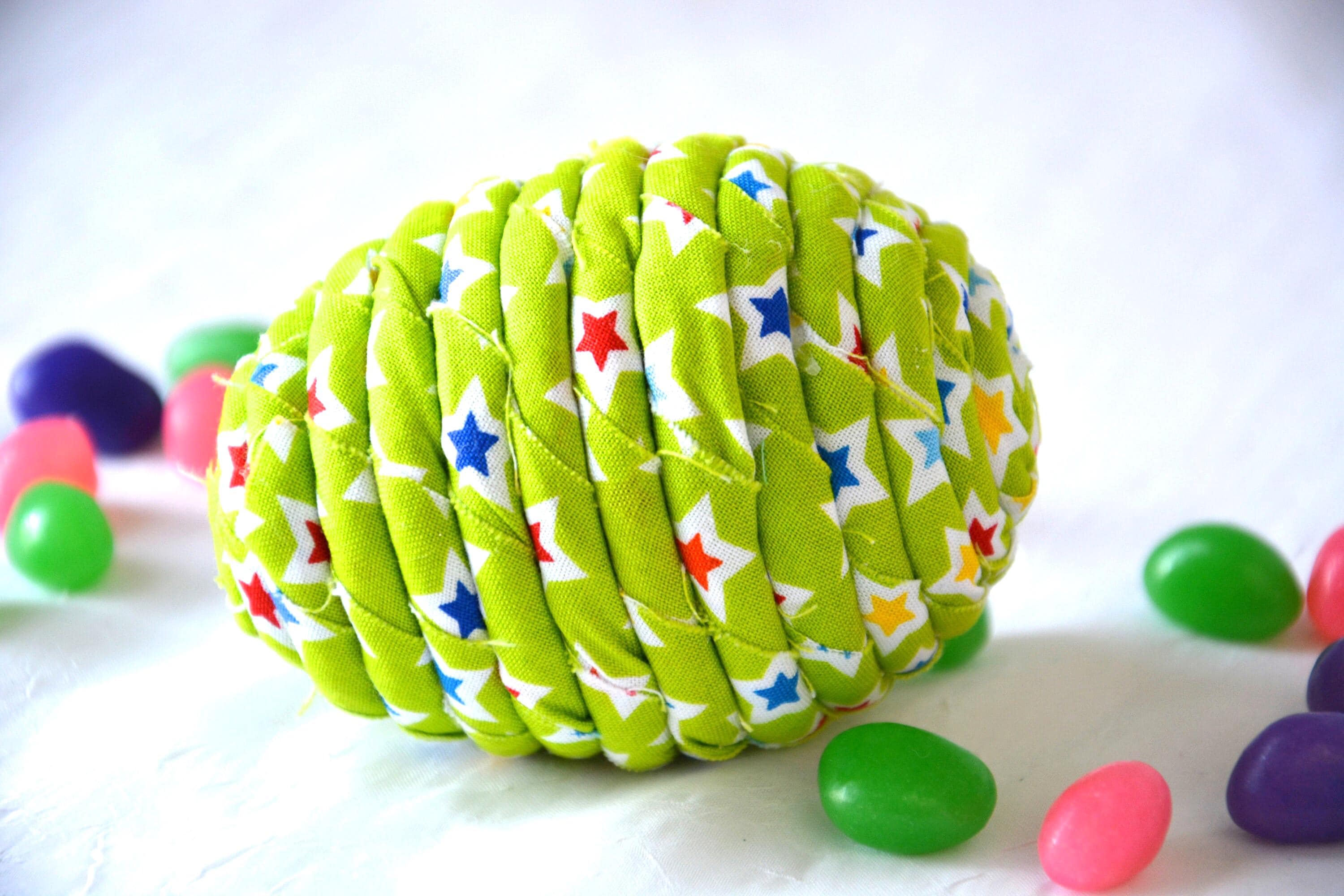 I hand wrapped fun Easter fabric around cotton line which I than hand coiled into an Easter Egg shape. The fabric edge is unfinished for a lovely shabby chic texture. I designed and created this lovely Easter egg in my smoke free home studio. Color placement will vary. Jelly bean, ruler, candy, bunny props not included. Egg does not open. Spot clean.