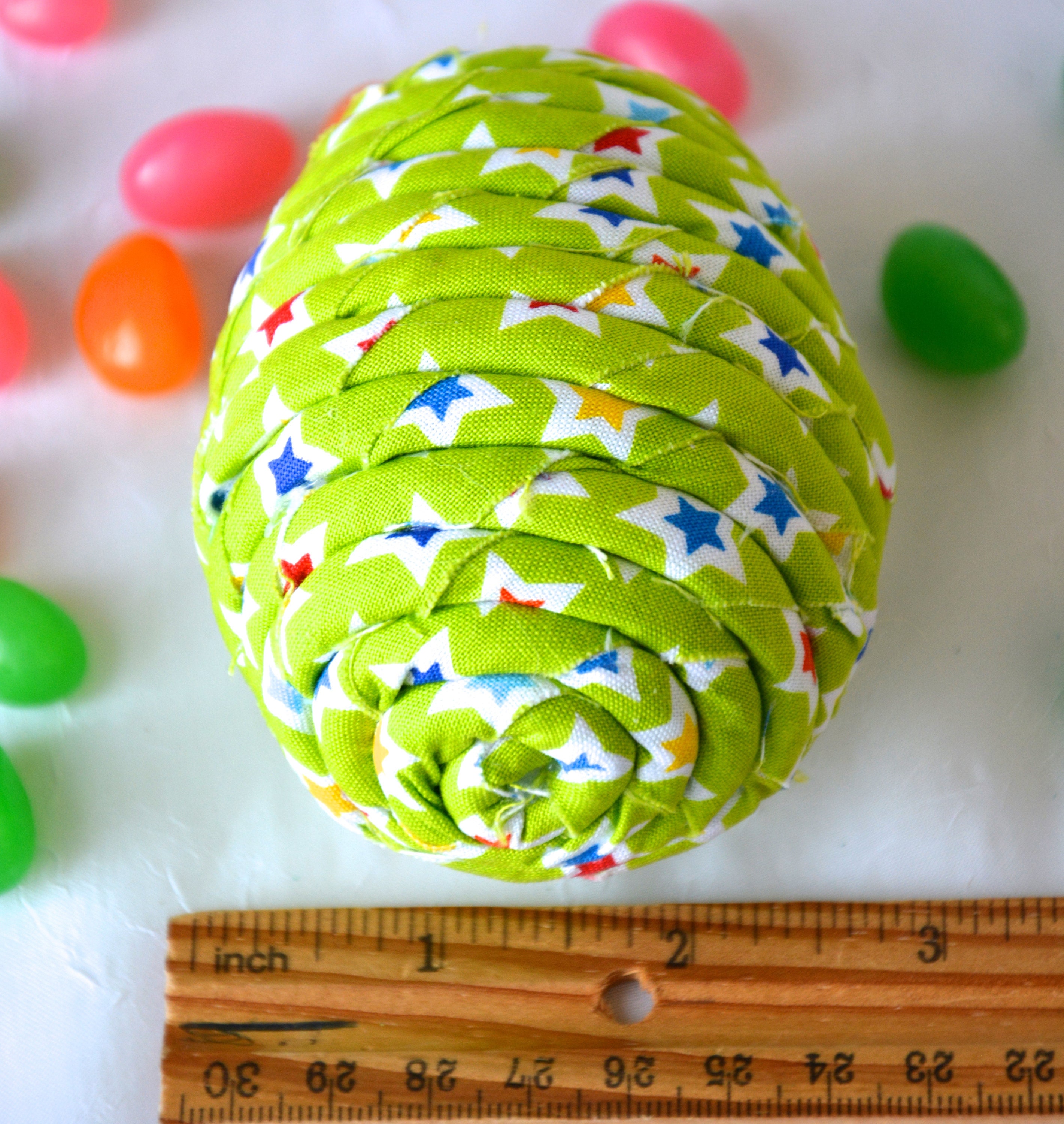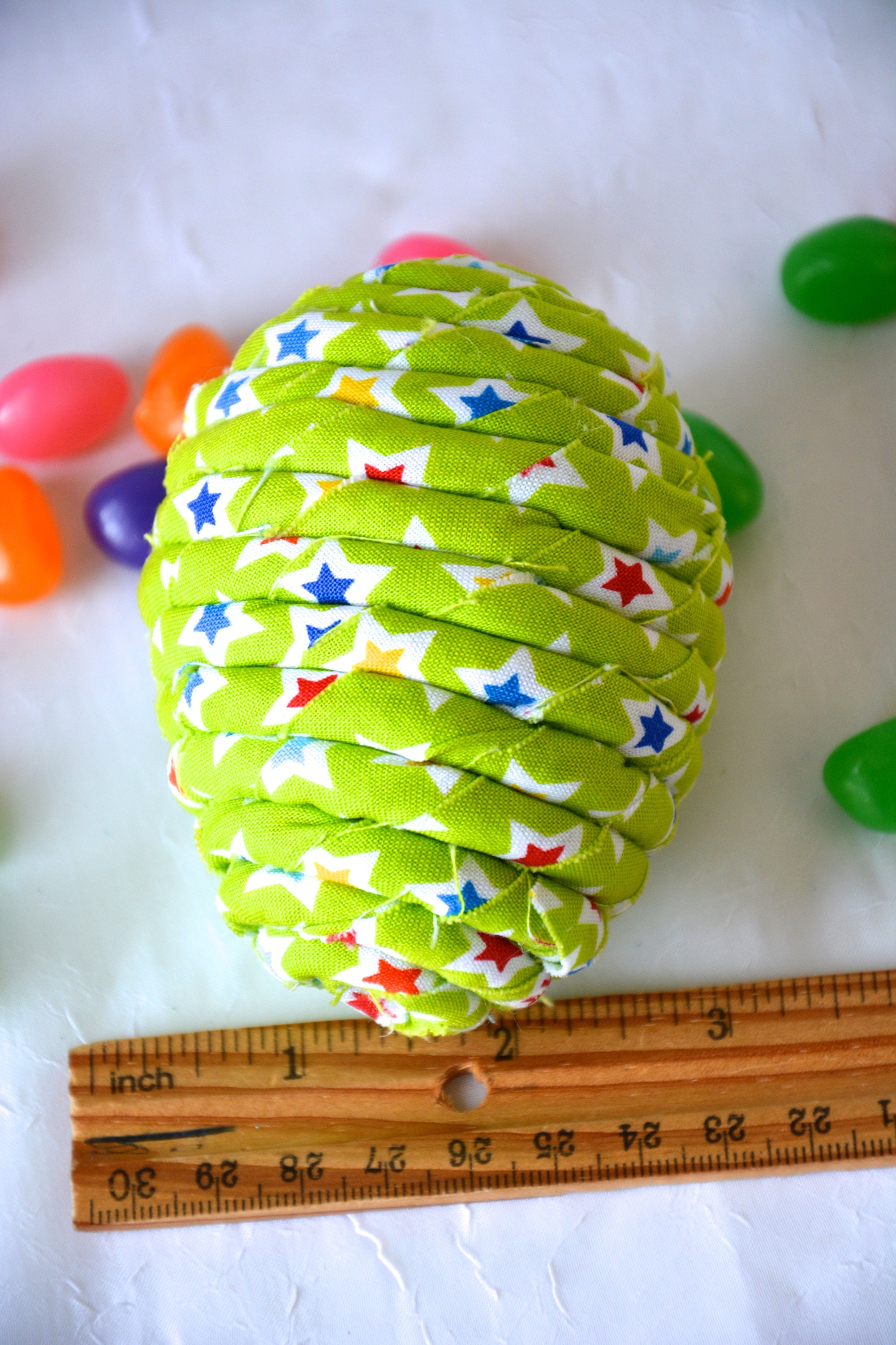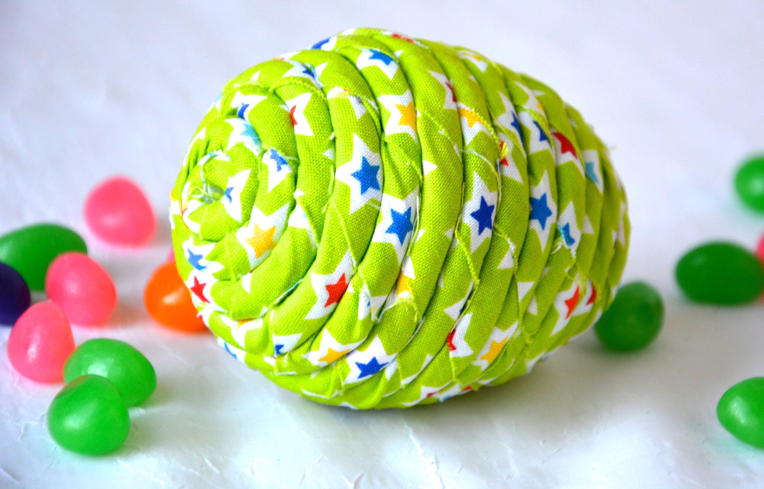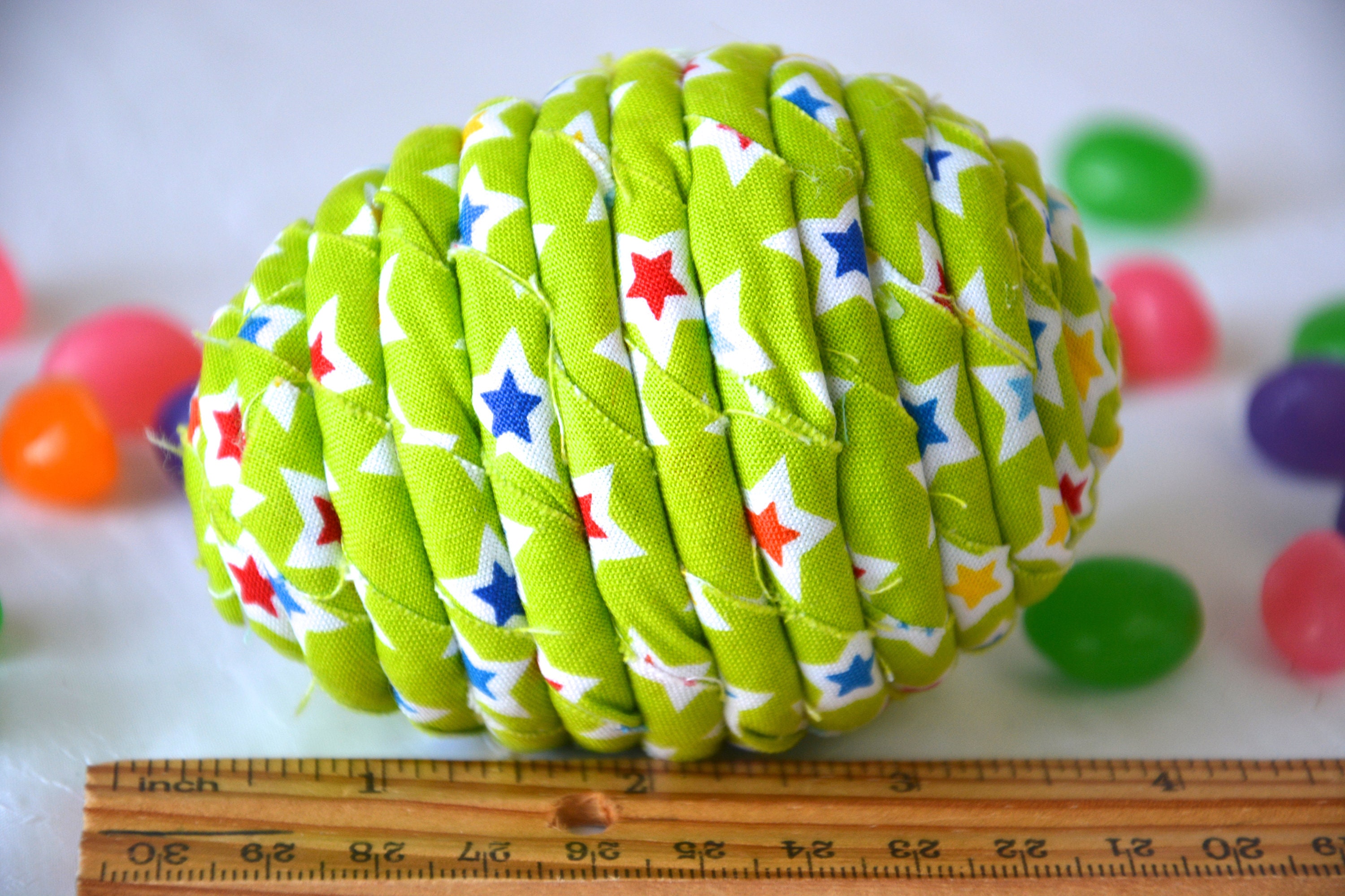 I hand wrapped fun Easter fabric around cotton line which I than hand coiled into an Easter Egg shape. The fabric edge is unfinished for a lovely shabby chic texture. I designed and created this lovely Easter egg in my smoke free home studio. Color placement will vary. Jelly bean, ruler, candy, bunny props not included. Egg does not open. Spot clean.