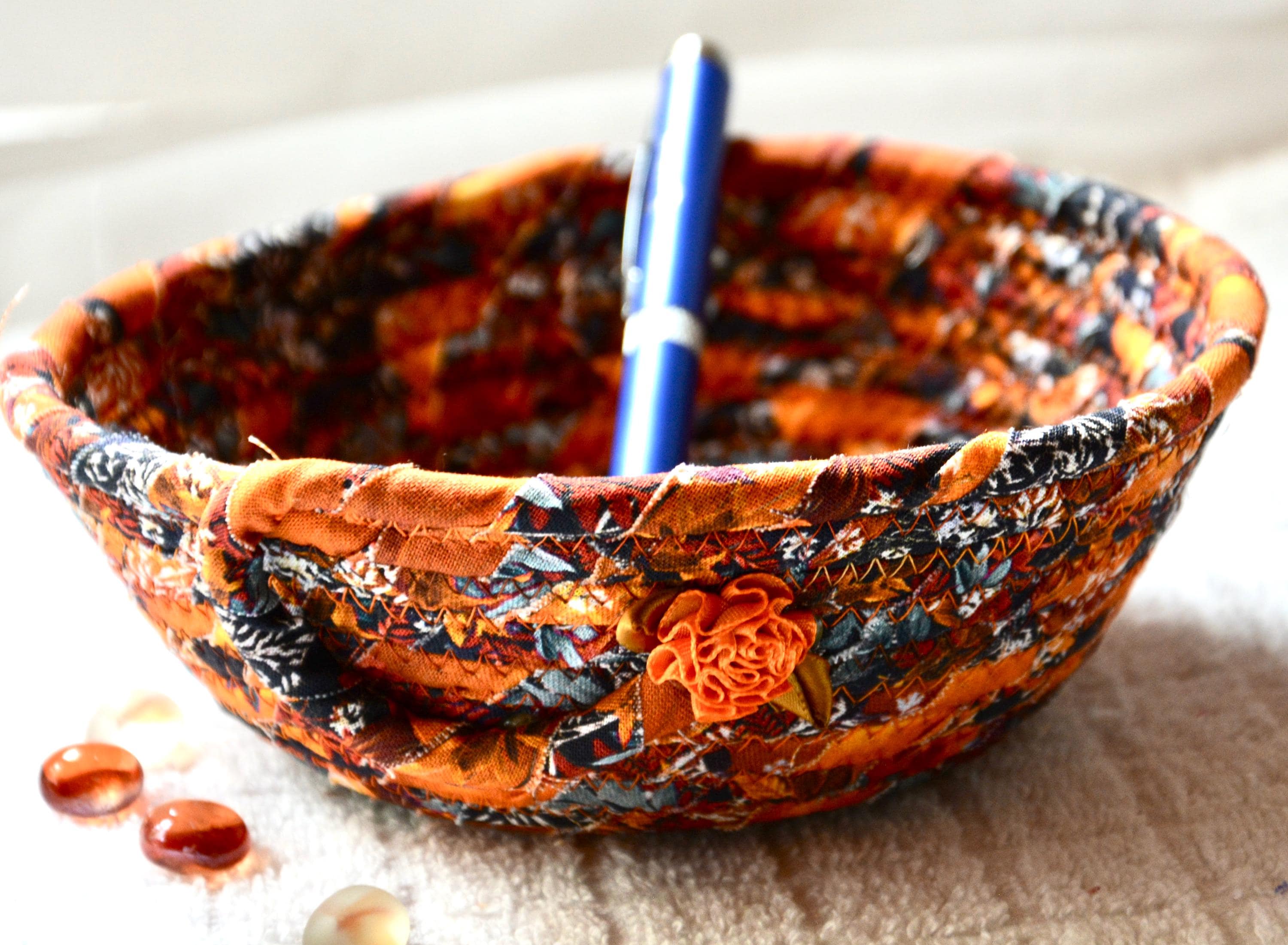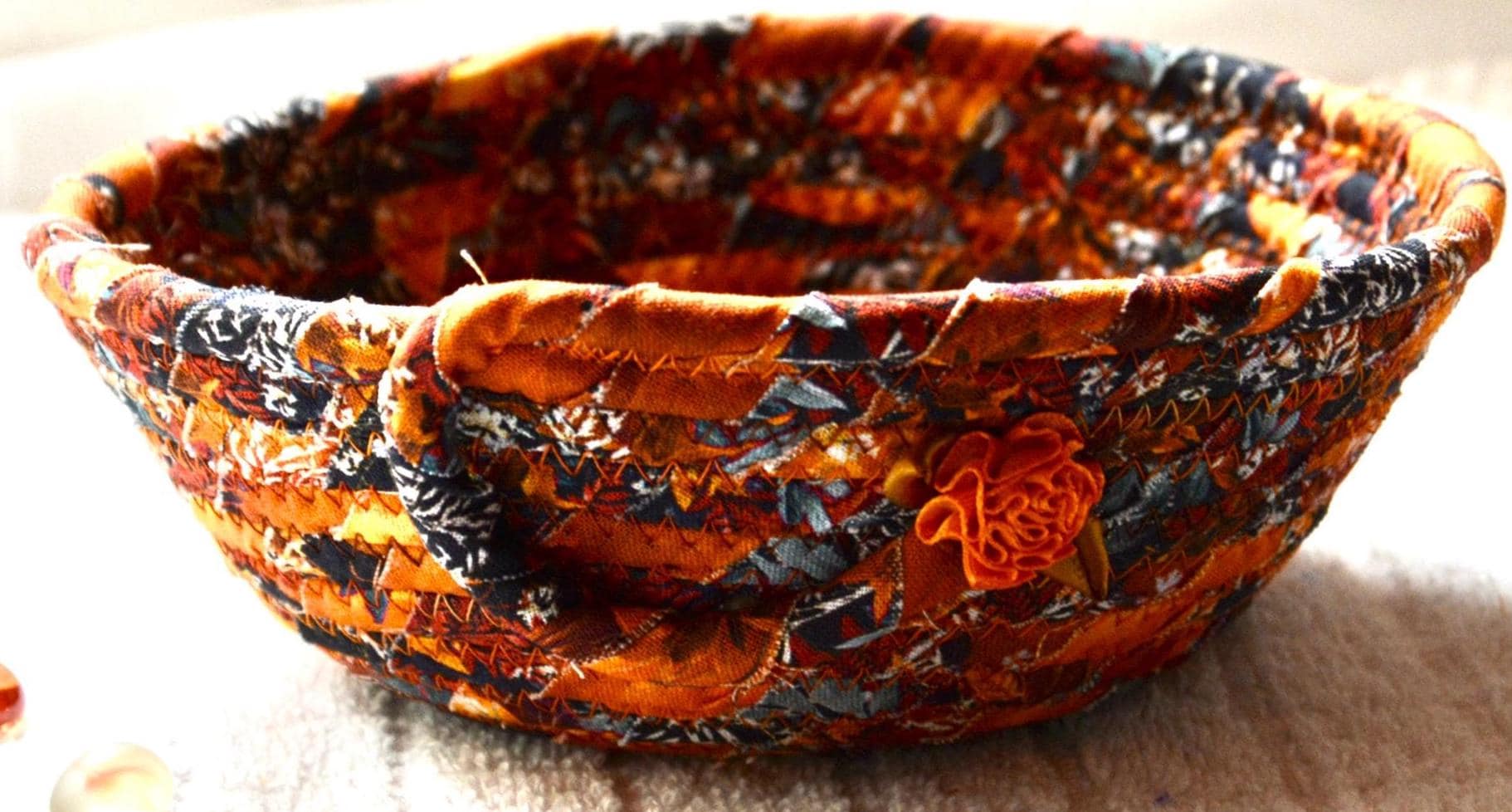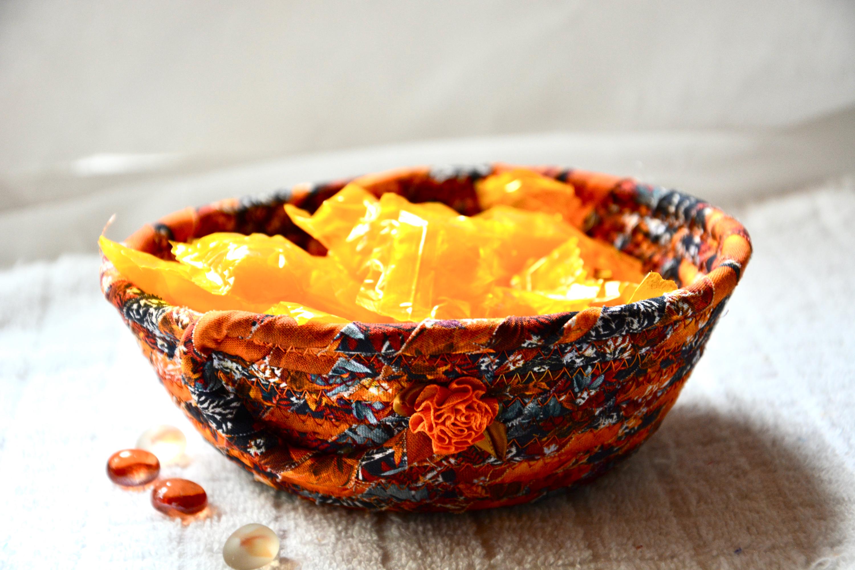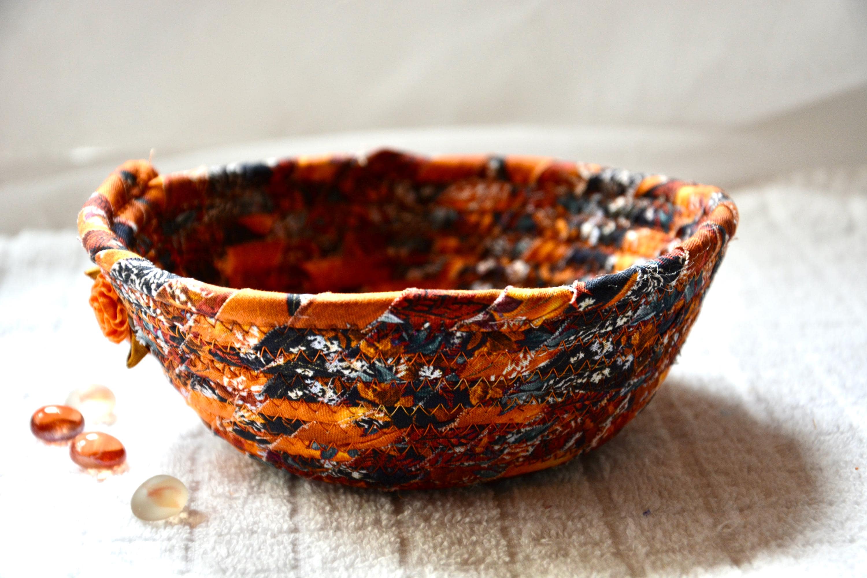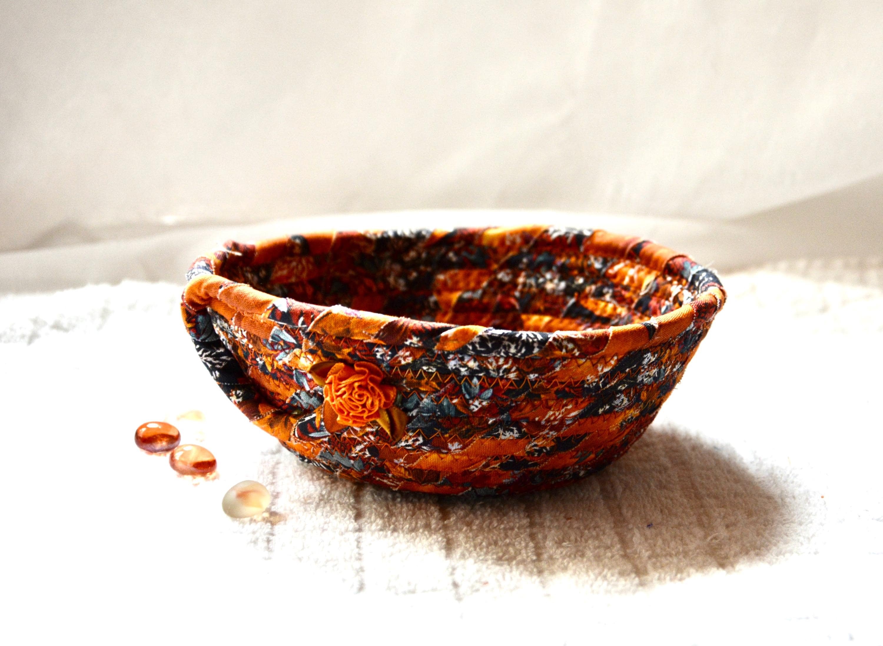I hand wrapped this wonderful high quality fabric around cotton line, which I then hand coiled and machine quilted to make the basket sturdy. I used the raw edge technique with a little fray to give it a lovely shabby chic texture. This lovely Fall fabric is 100% cotton and shows on the inside of the basket too! The pretty flower on the basket is included for a nice accent. Color placement will vary.