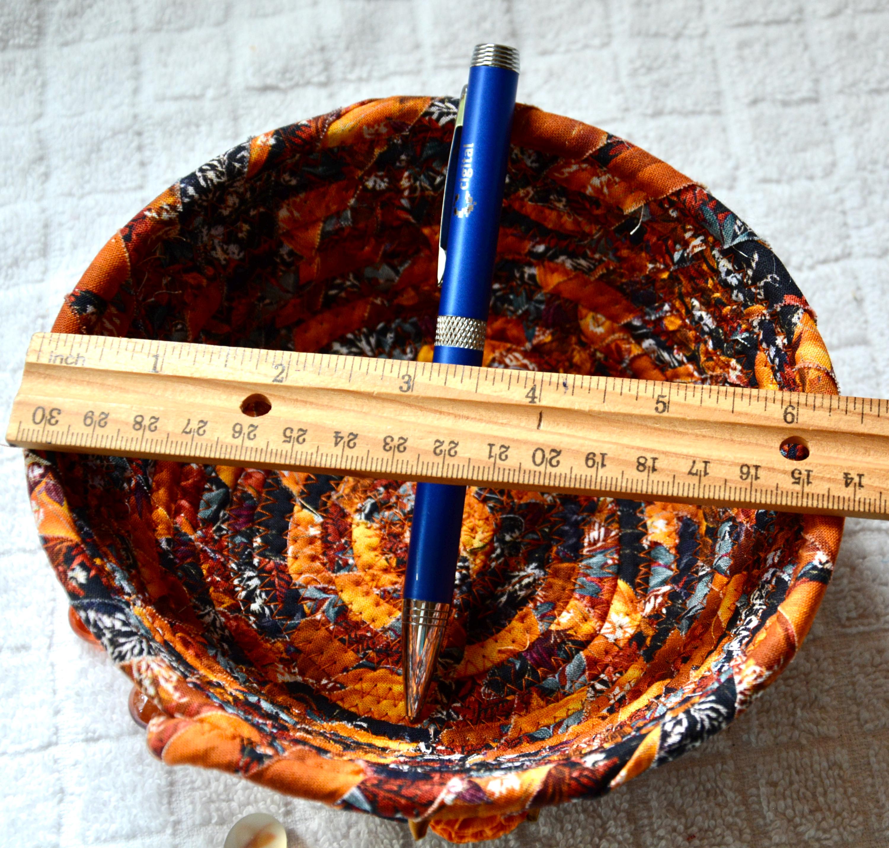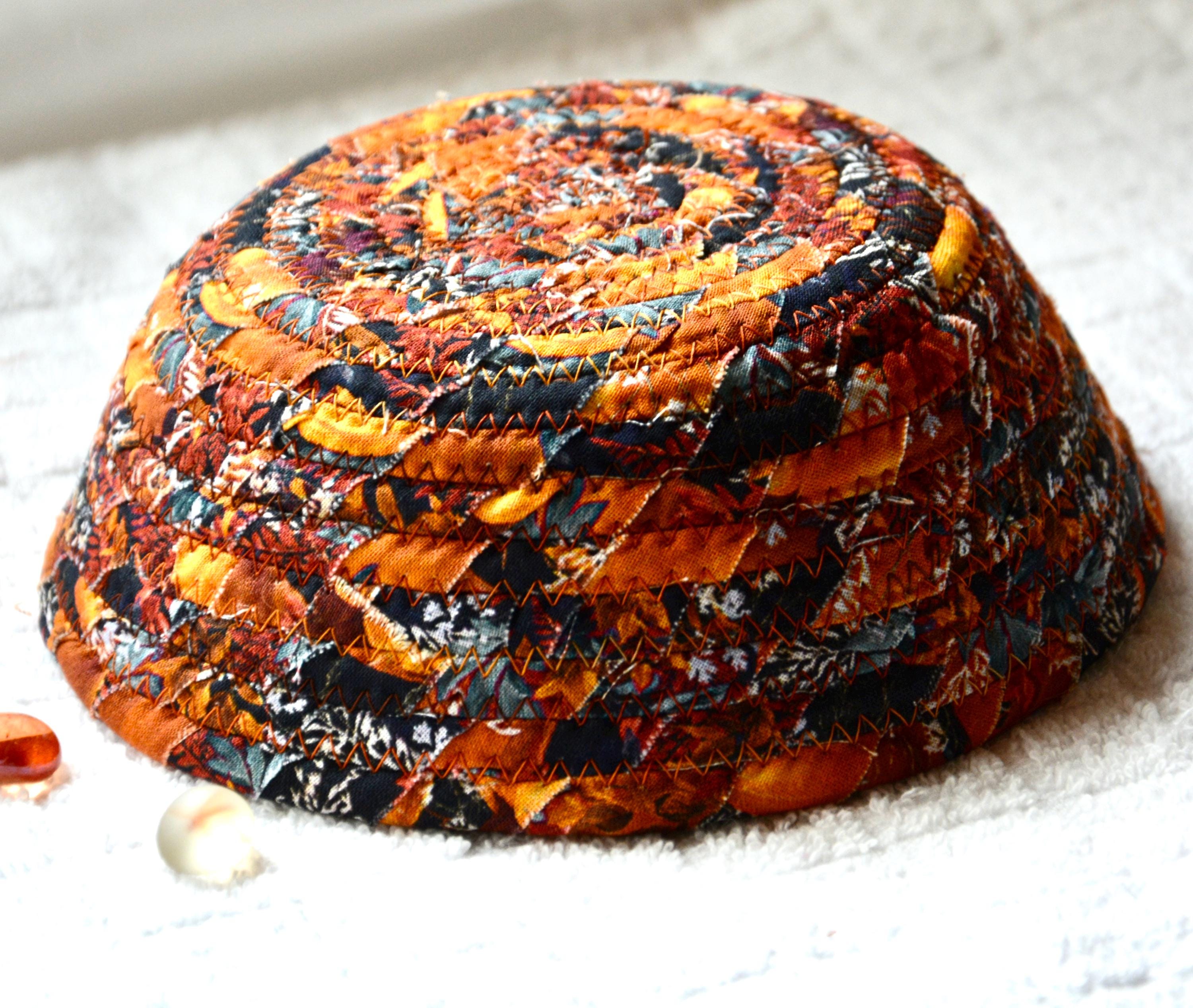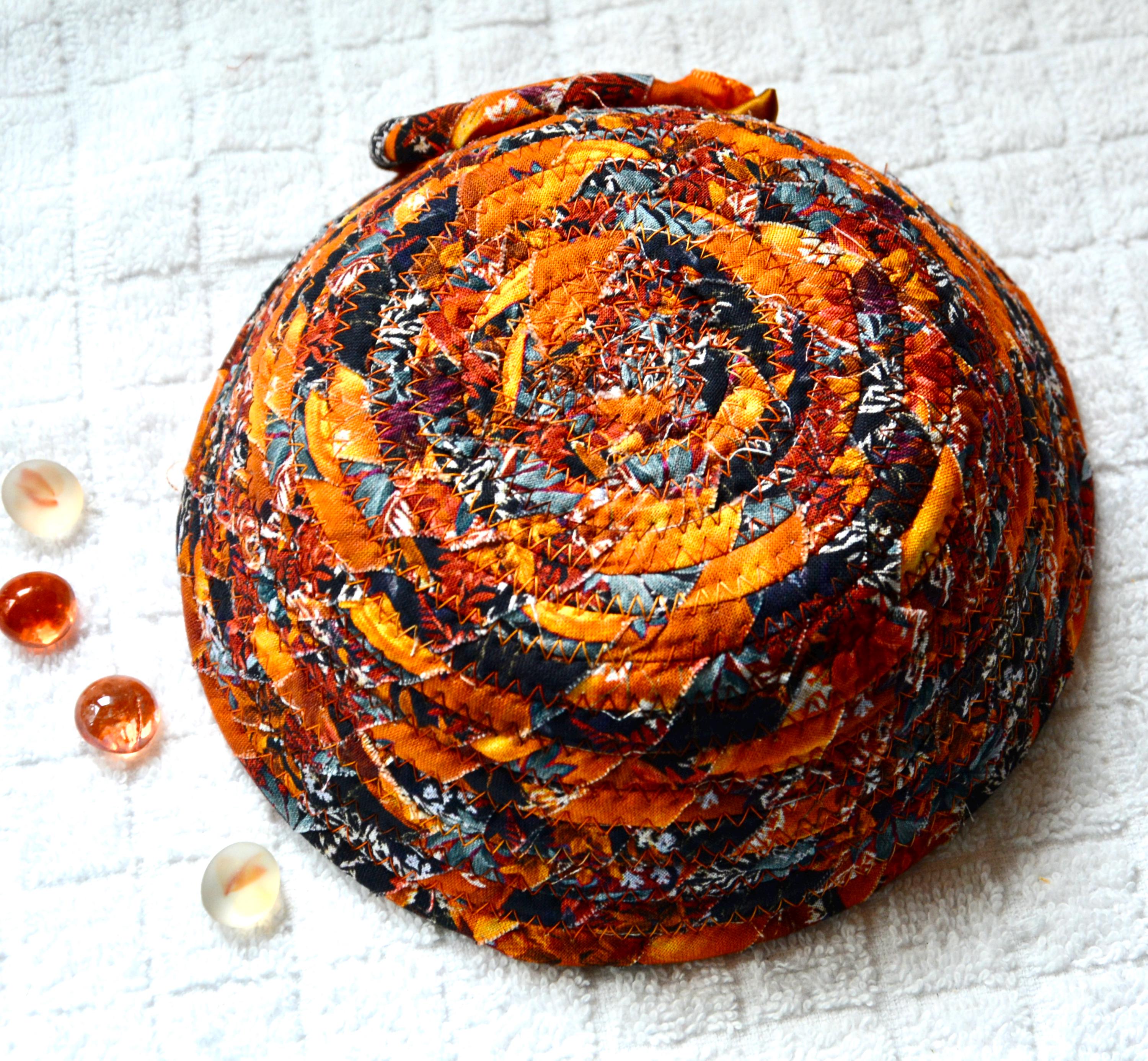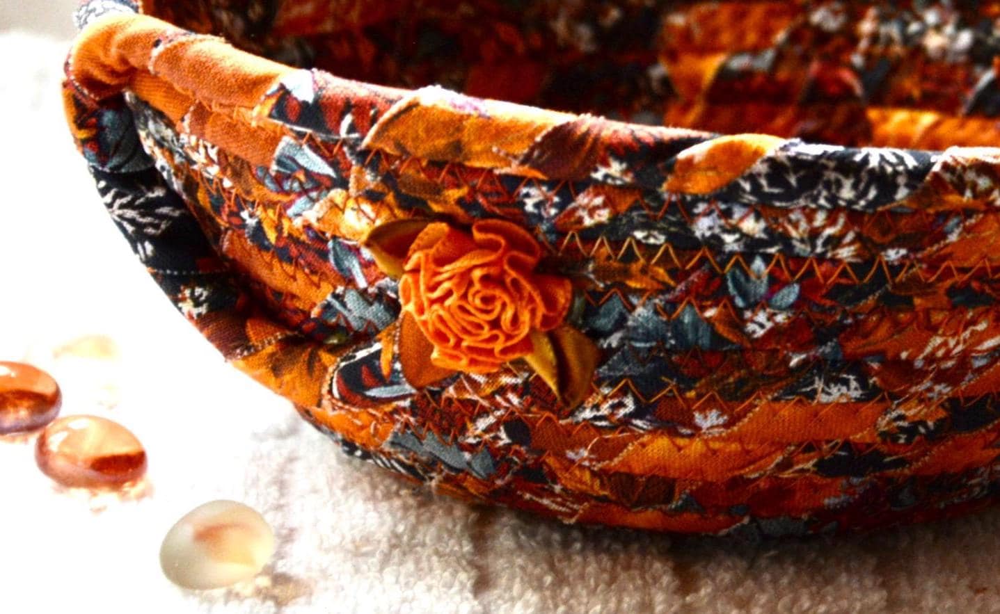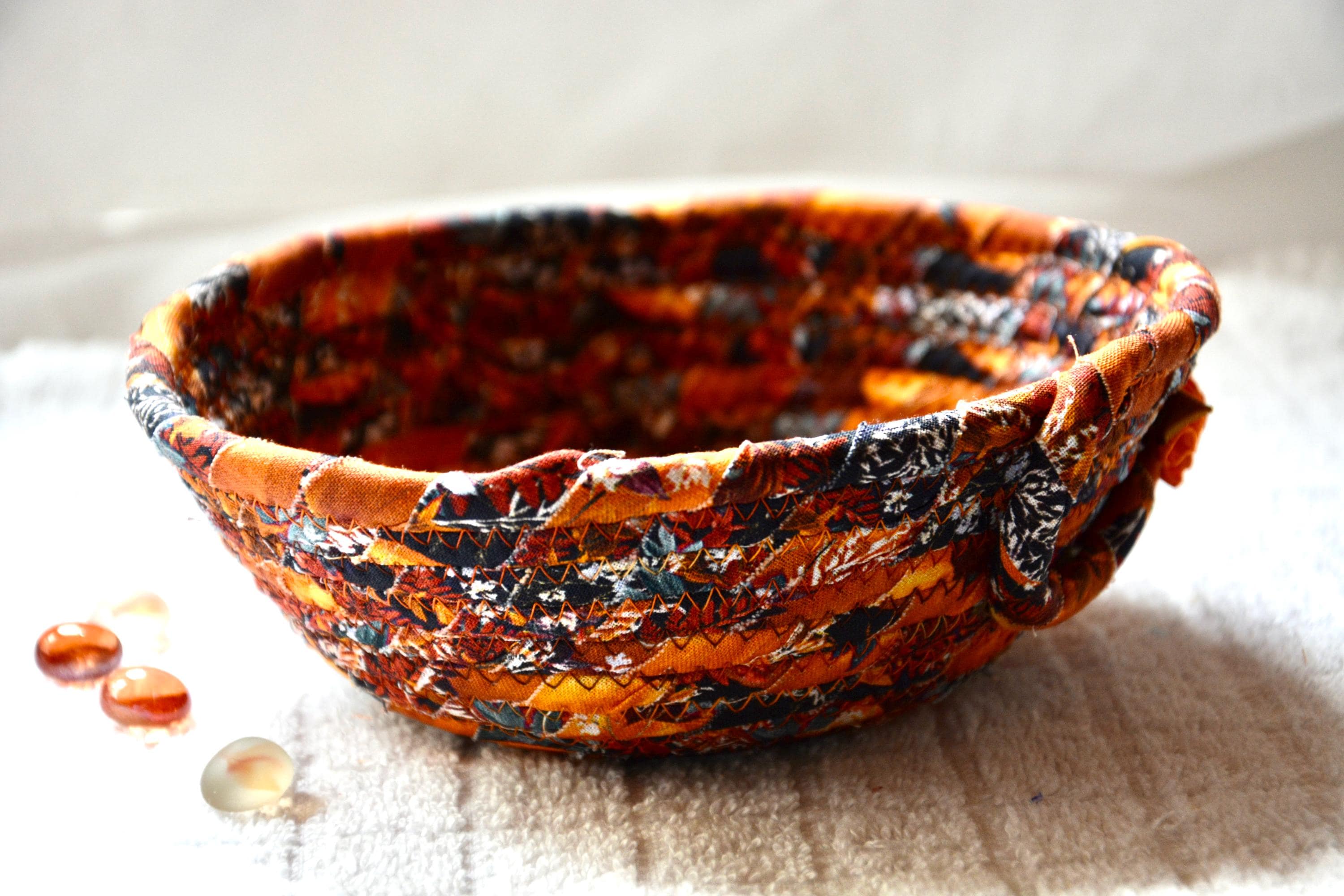 I hand wrapped this wonderful high quality fabric around cotton line, which I then hand coiled and machine quilted to make the basket sturdy. I used the raw edge technique with a little fray to give it a lovely shabby chic texture. This lovely Fall fabric is 100% cotton and shows on the inside of the basket too! The pretty flower on the basket is included for a nice accent. Color placement will vary.