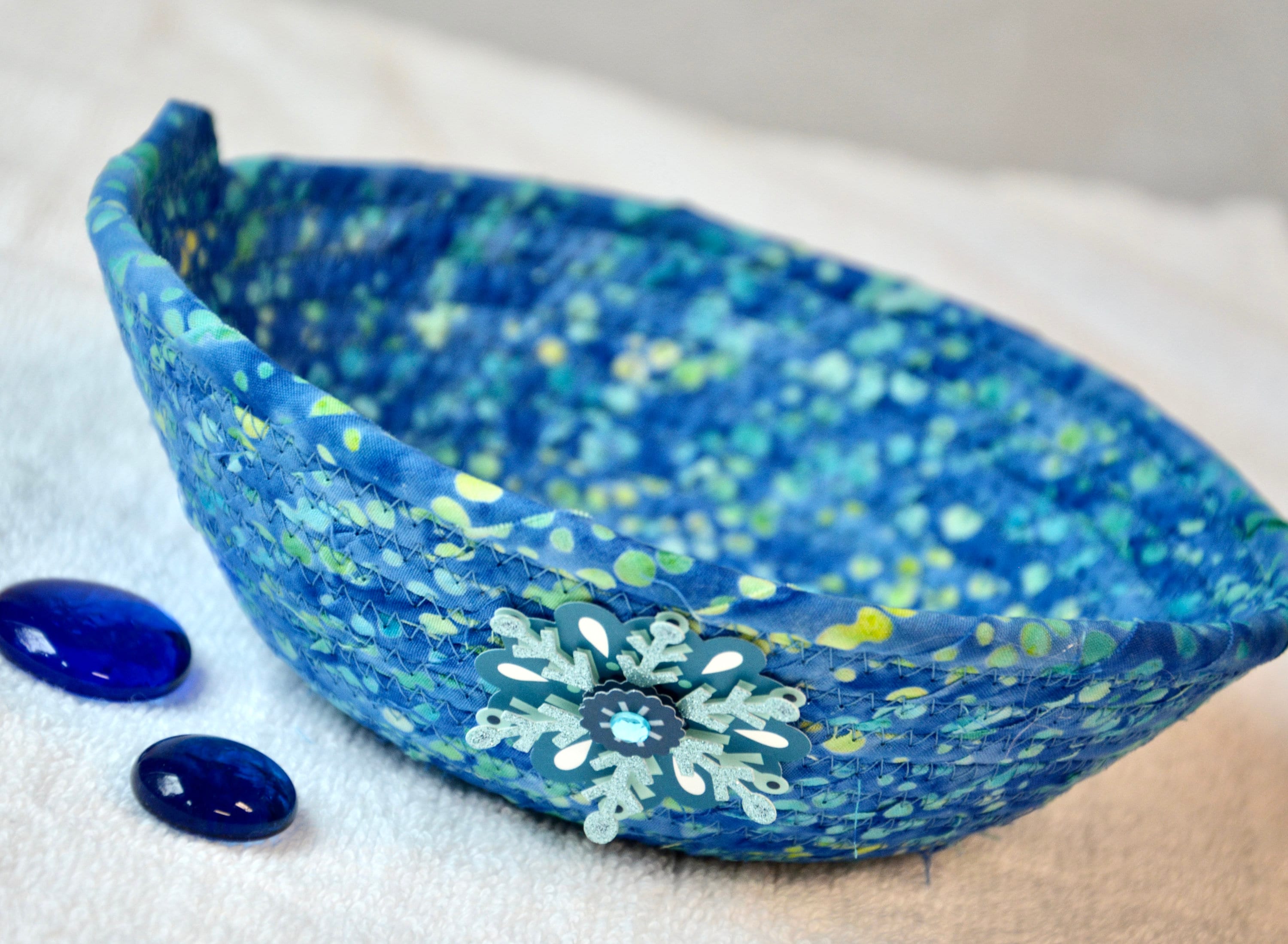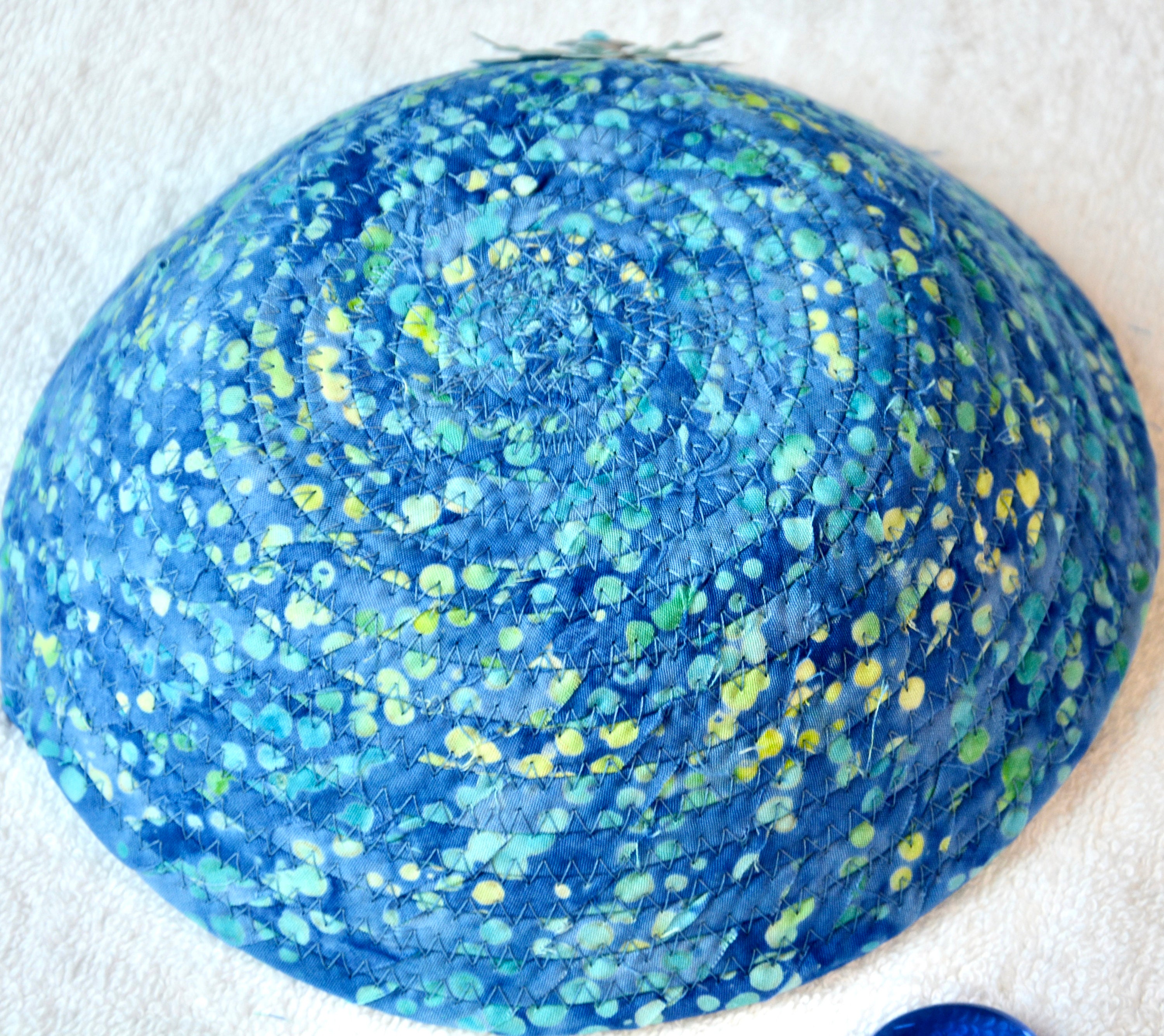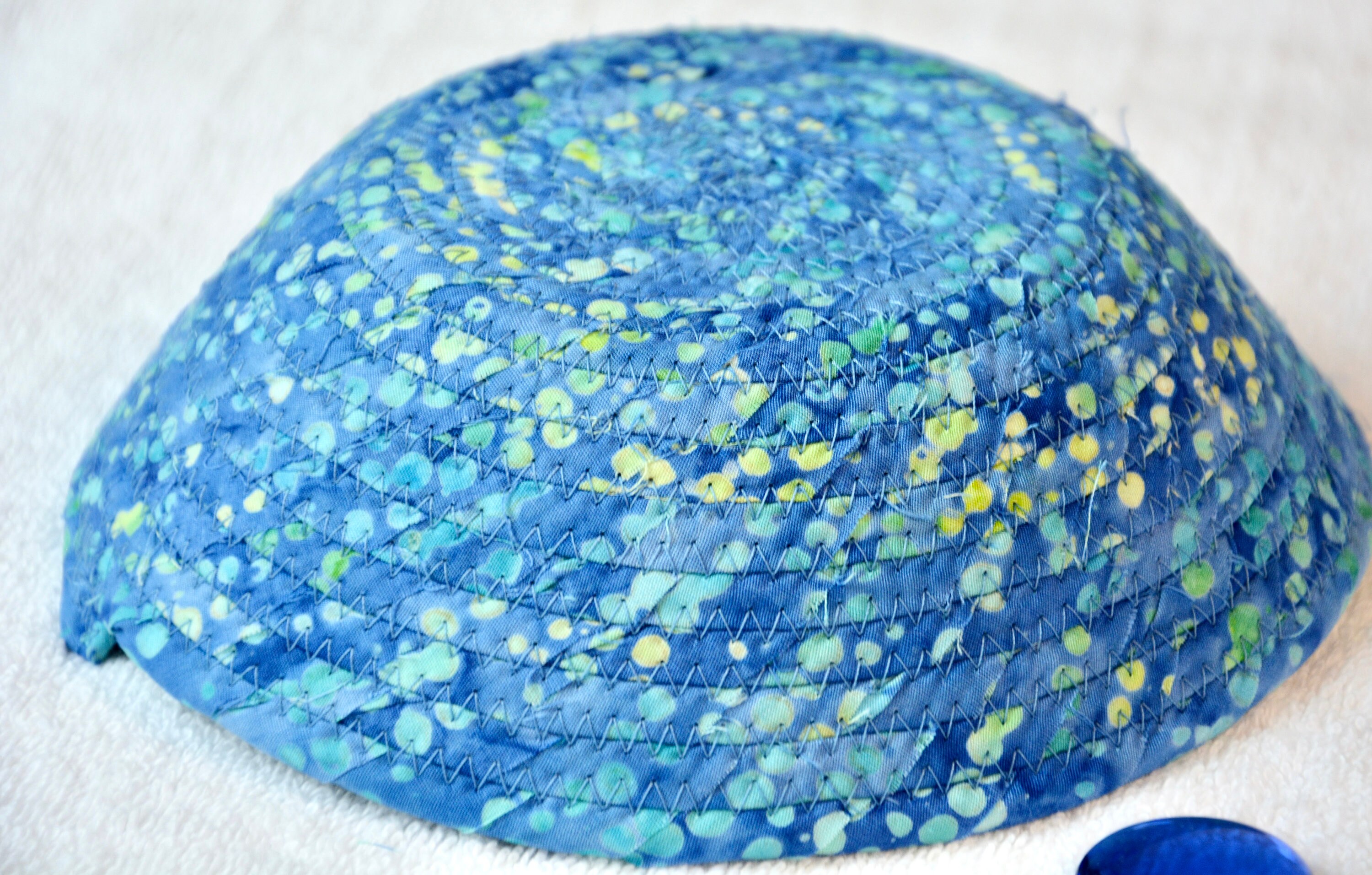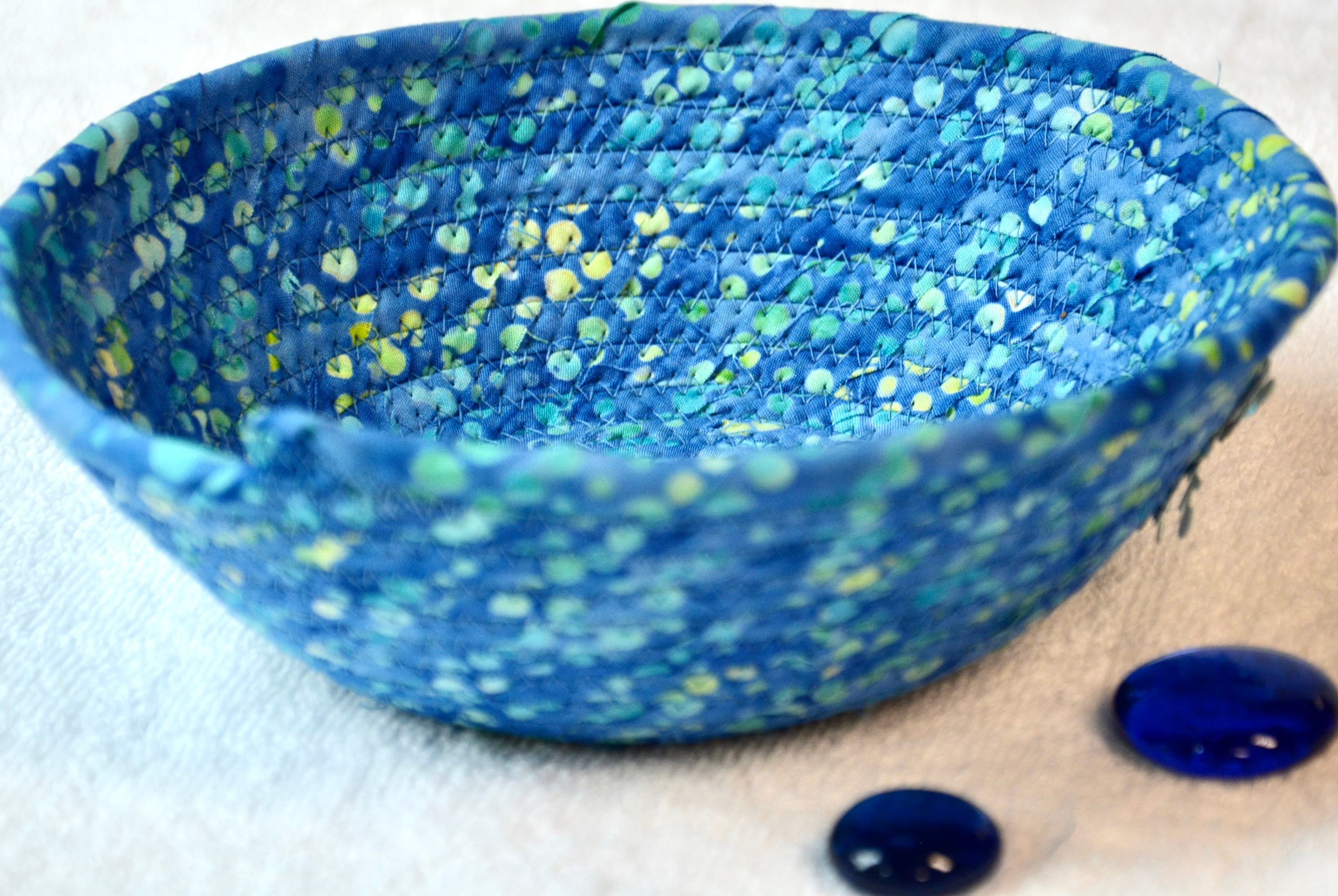 I hand wrapped this wonderful blue batik fabric around cotton line, which I then hand coiled and machine quilted to make it sturdy. I used the raw edge technique with some fray to add a great shabby chic texture. This is a high quality 100% cotton fabric and it shows on the inside too!