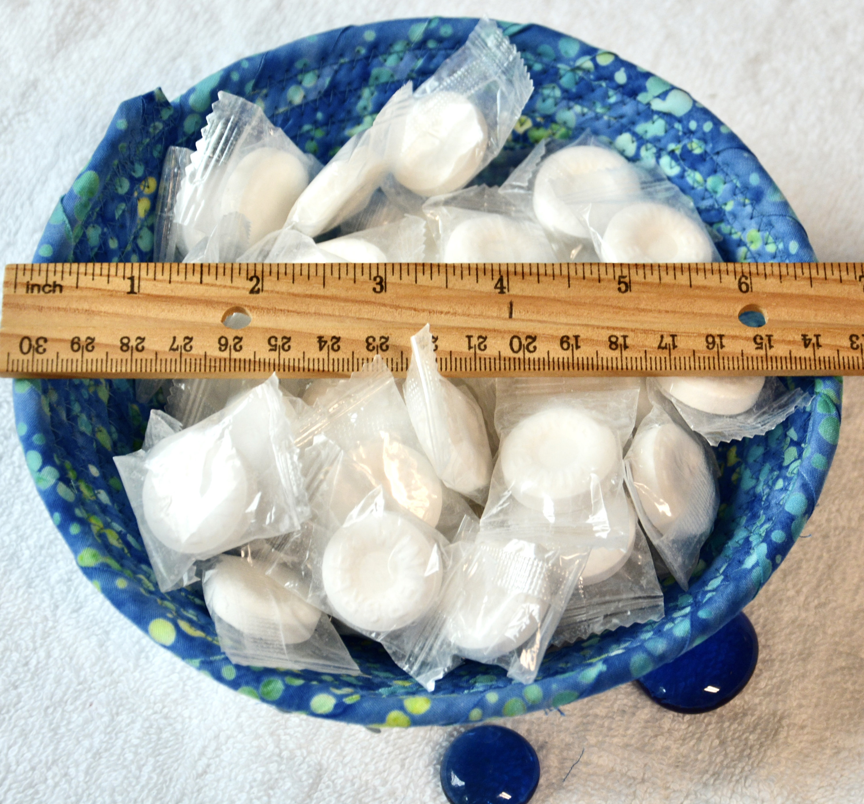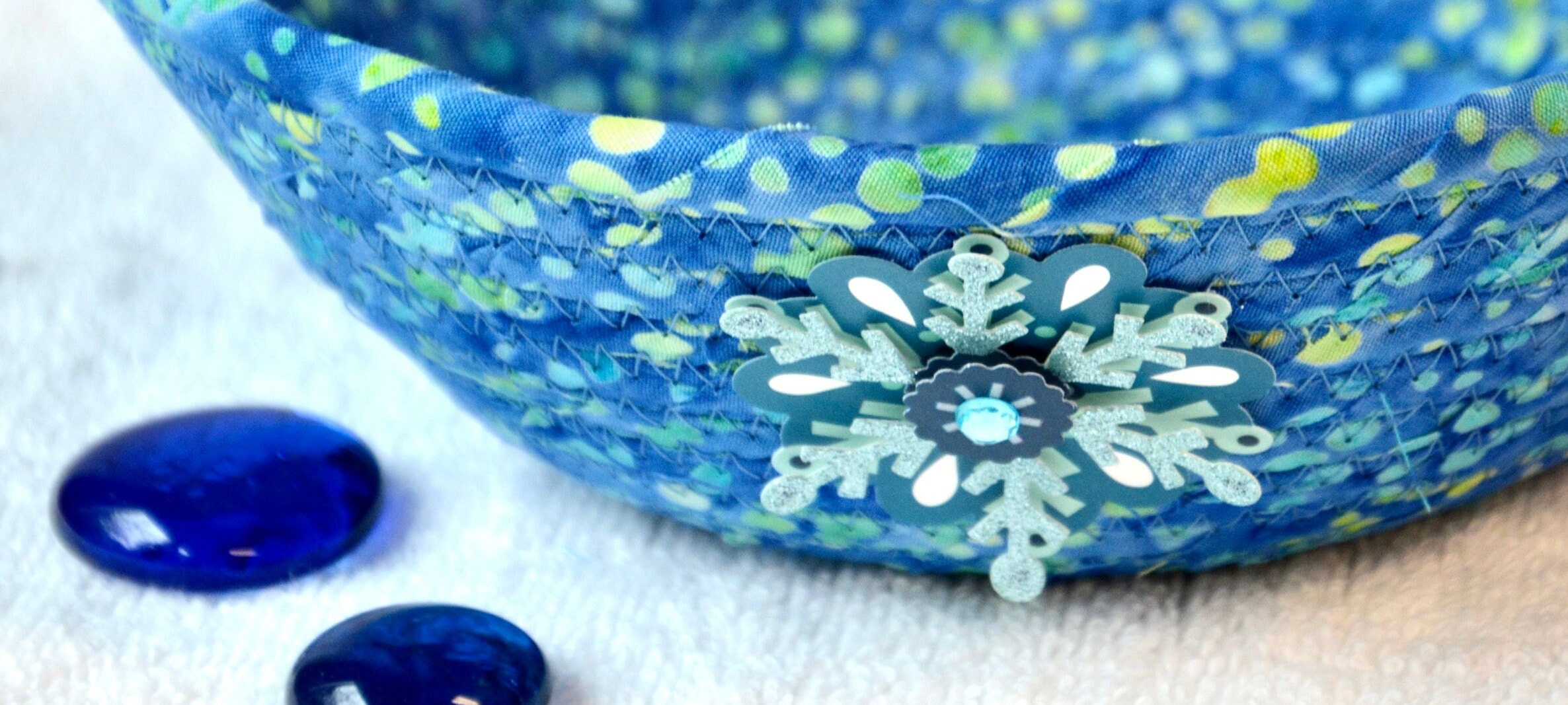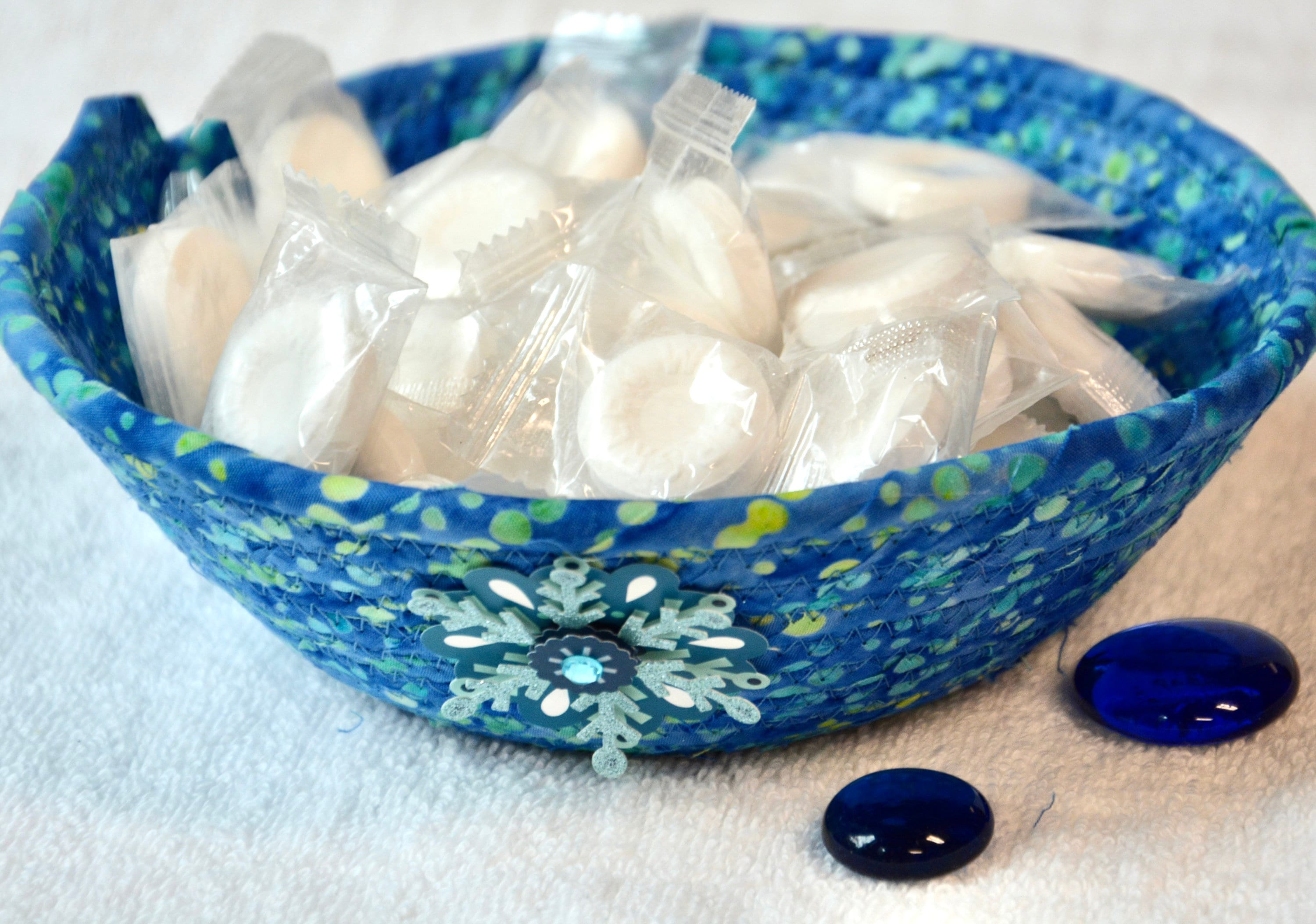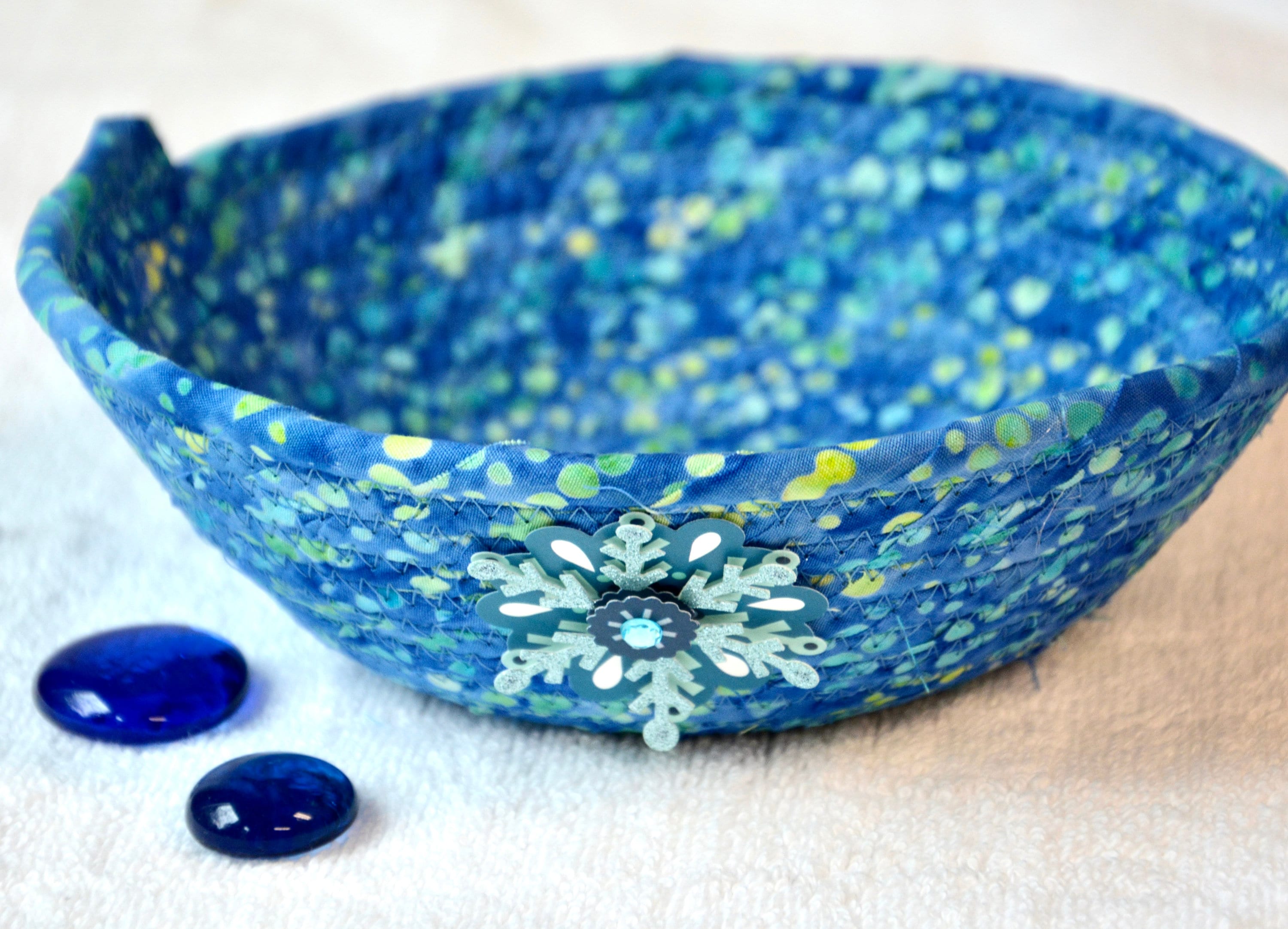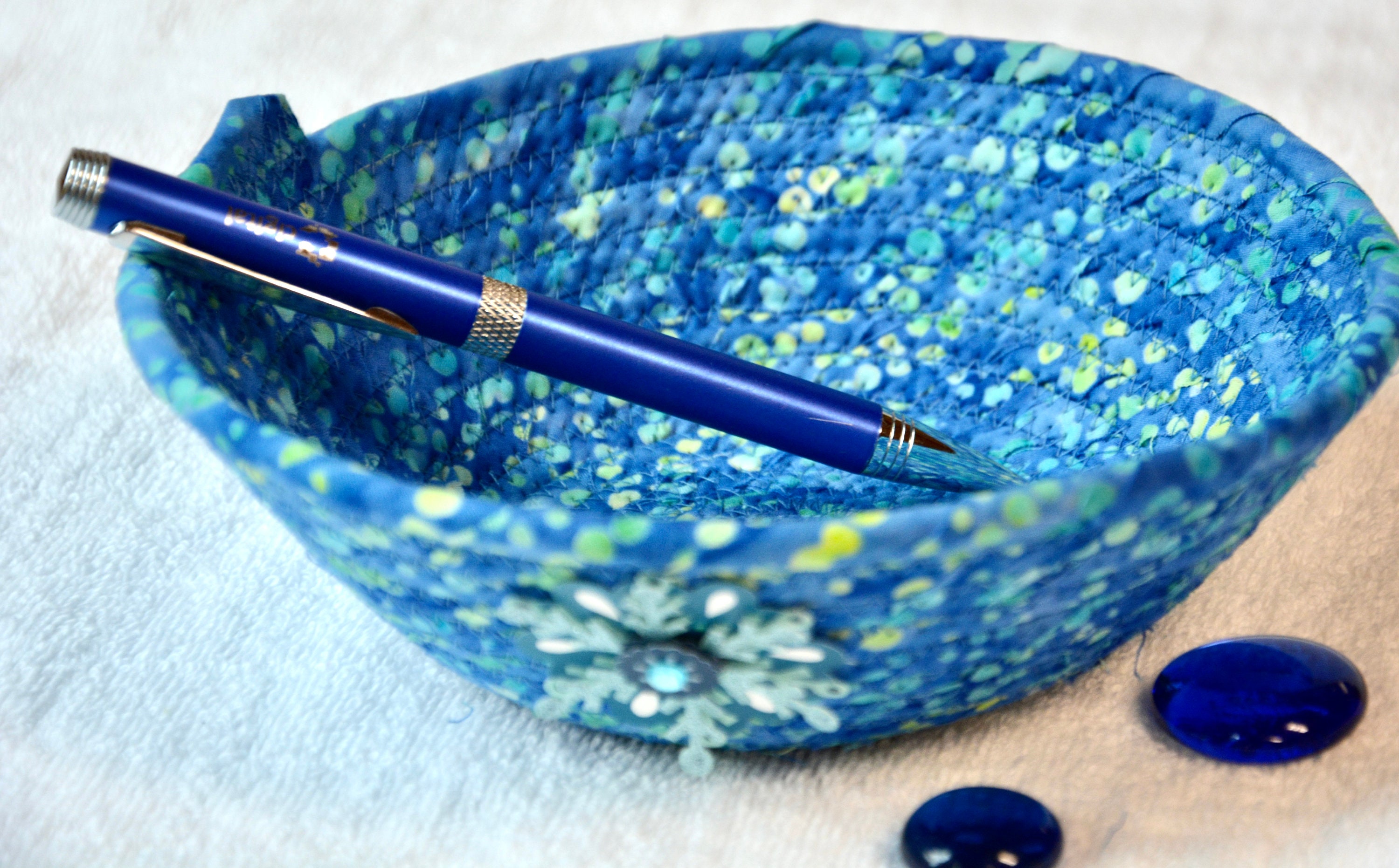 I hand wrapped this wonderful blue batik fabric around cotton line, which I then hand coiled and machine quilted to make it sturdy. I used the raw edge technique with some fray to add a great shabby chic texture. This is a high quality 100% cotton fabric and it shows on the inside too!