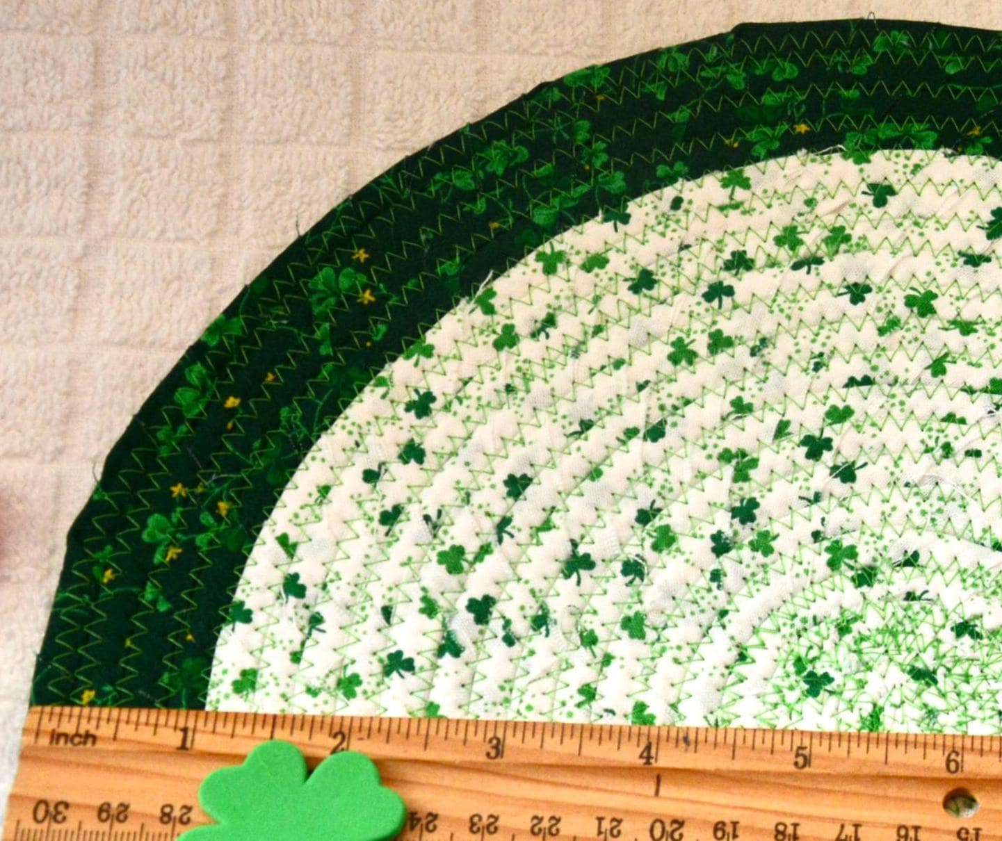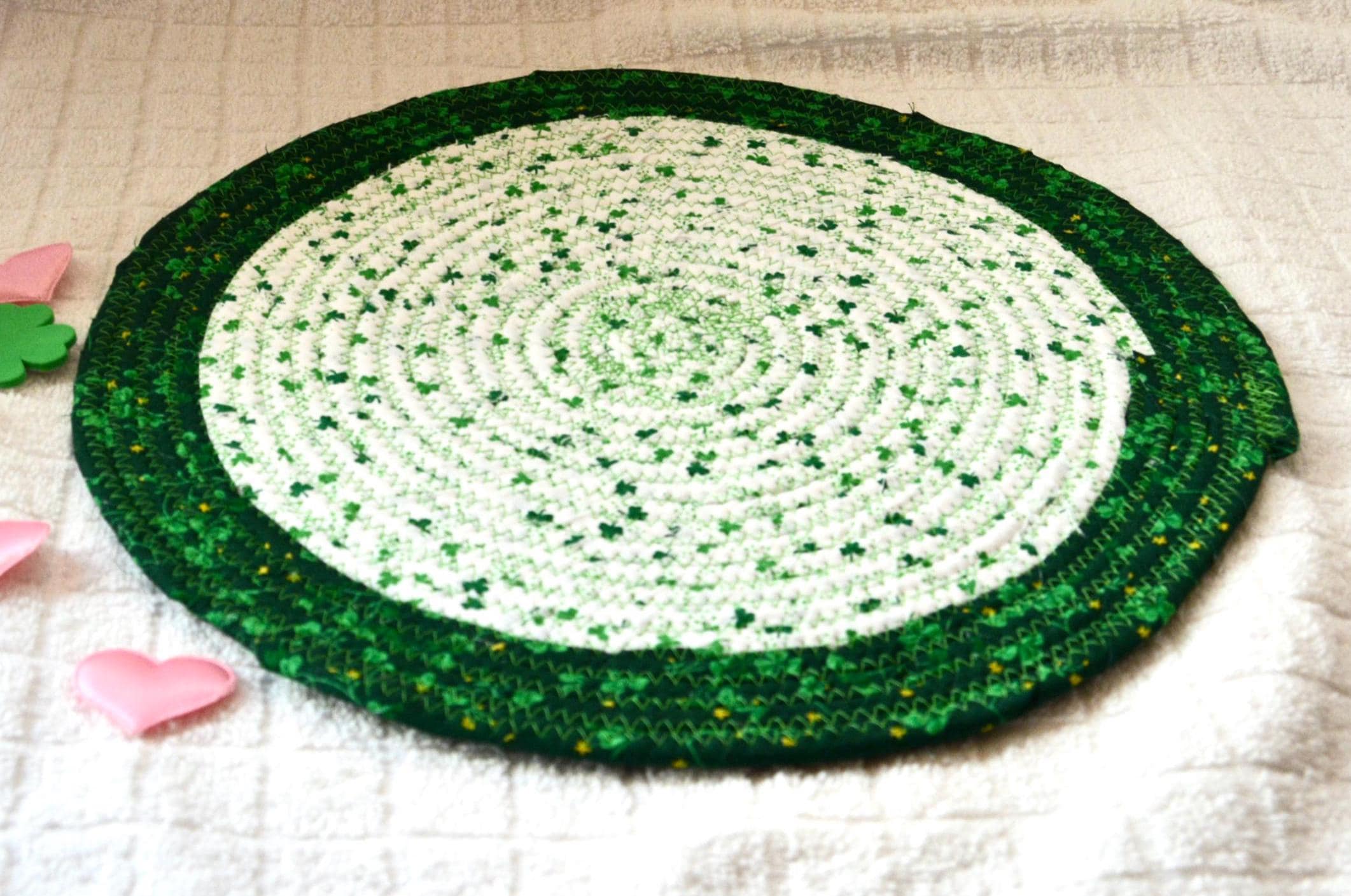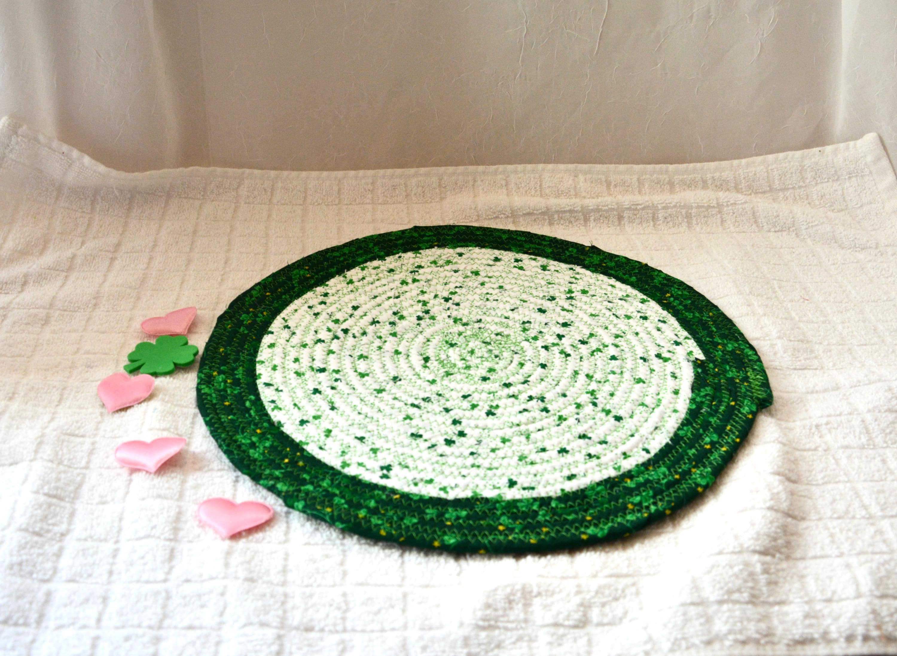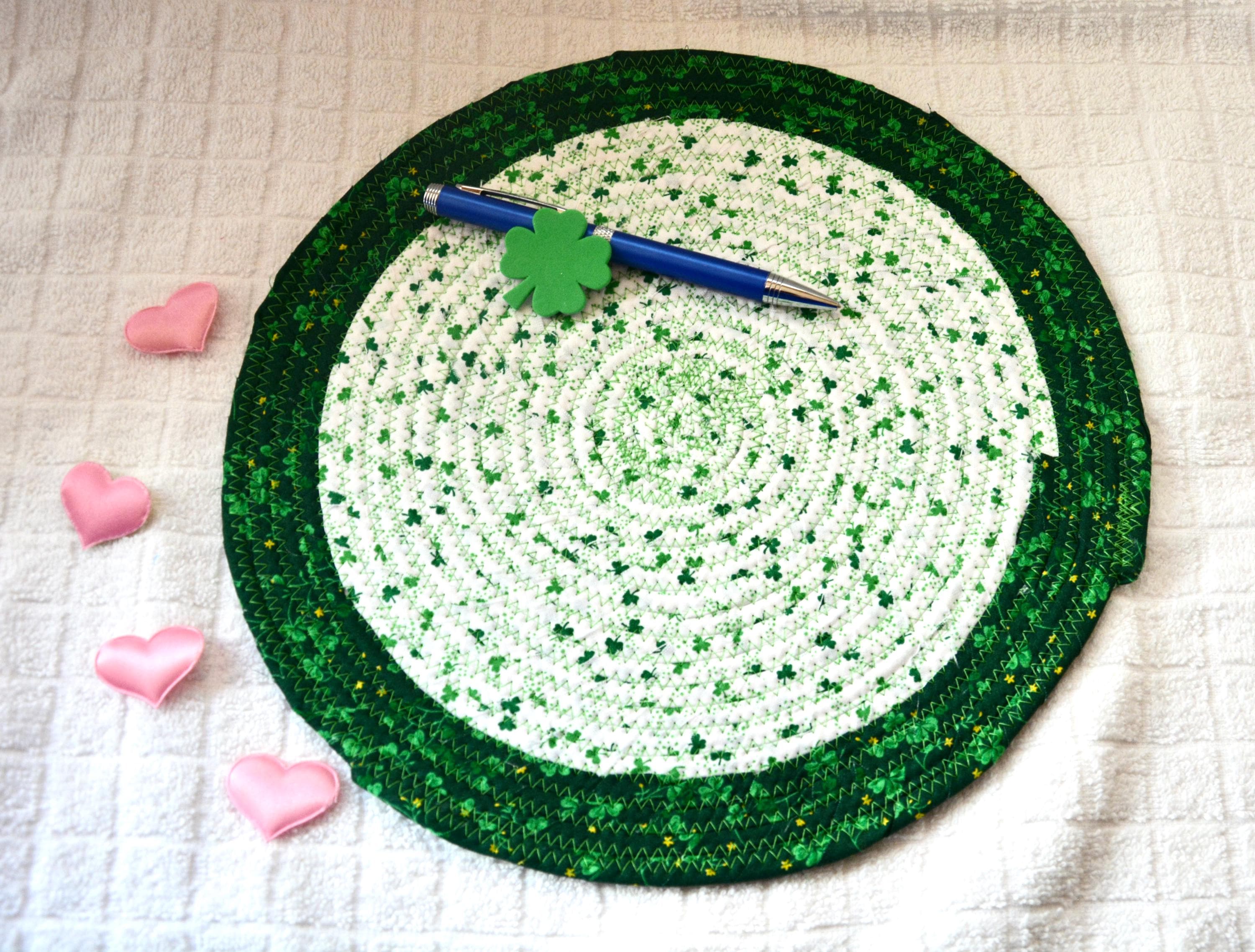 I hand wrapped these wonderful green Shamrock fabrics around cotton line, which I then hand coiled and machine quilted to make it sturdy. I used the raw edge technique with some fray to add a lovely shabby chic texture. These are high quality 100% cotton fabrics which show on both sides too!