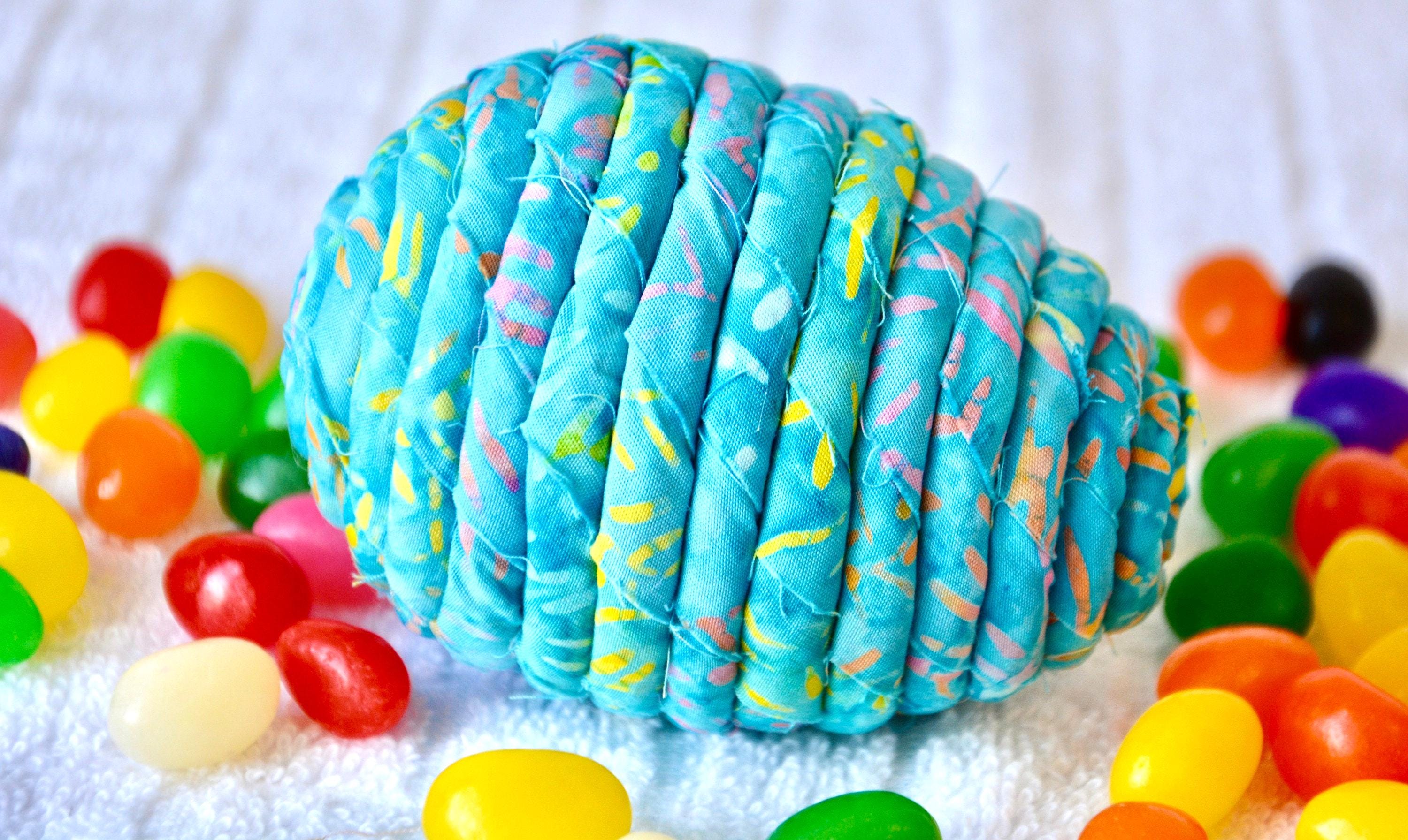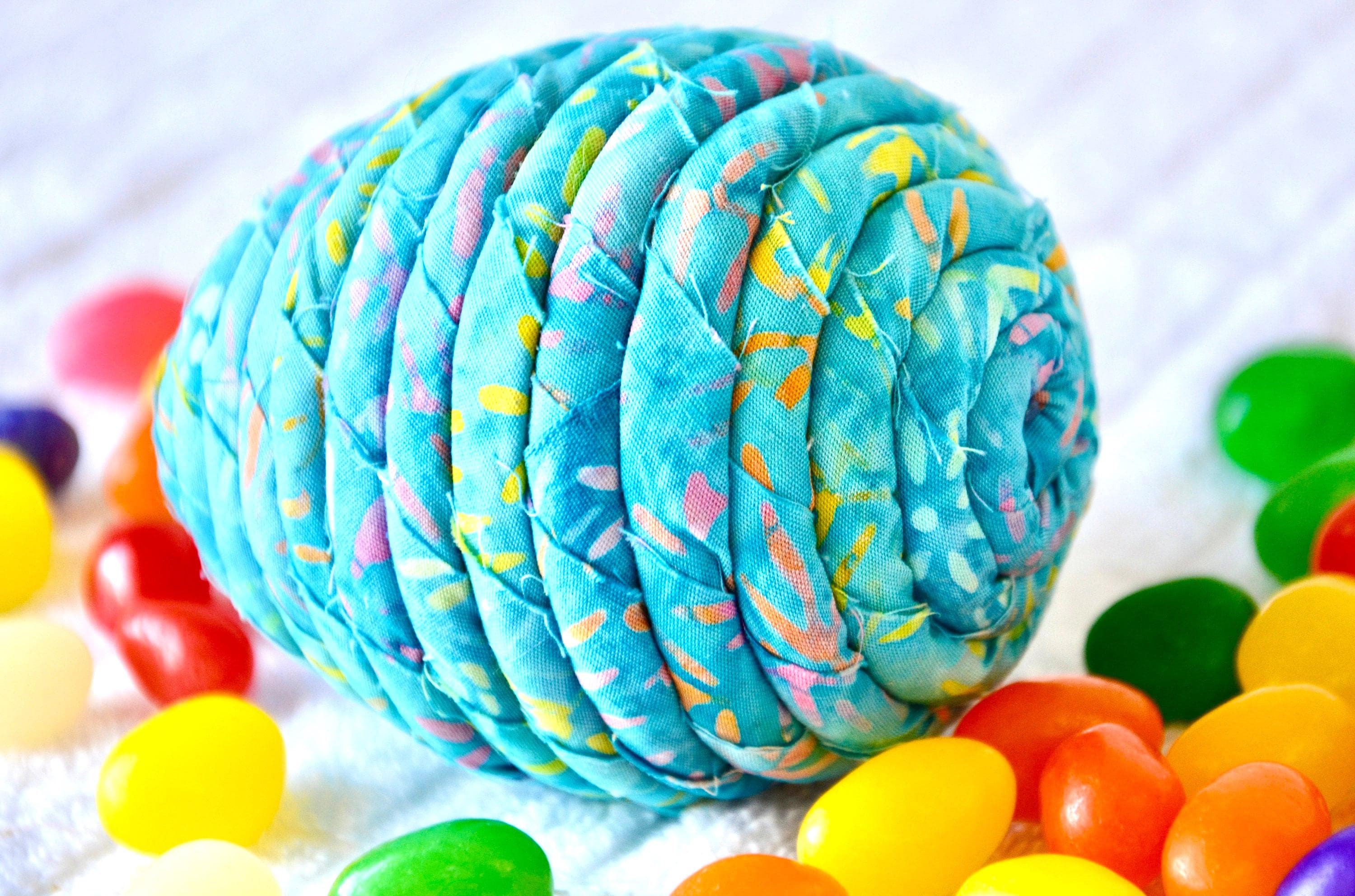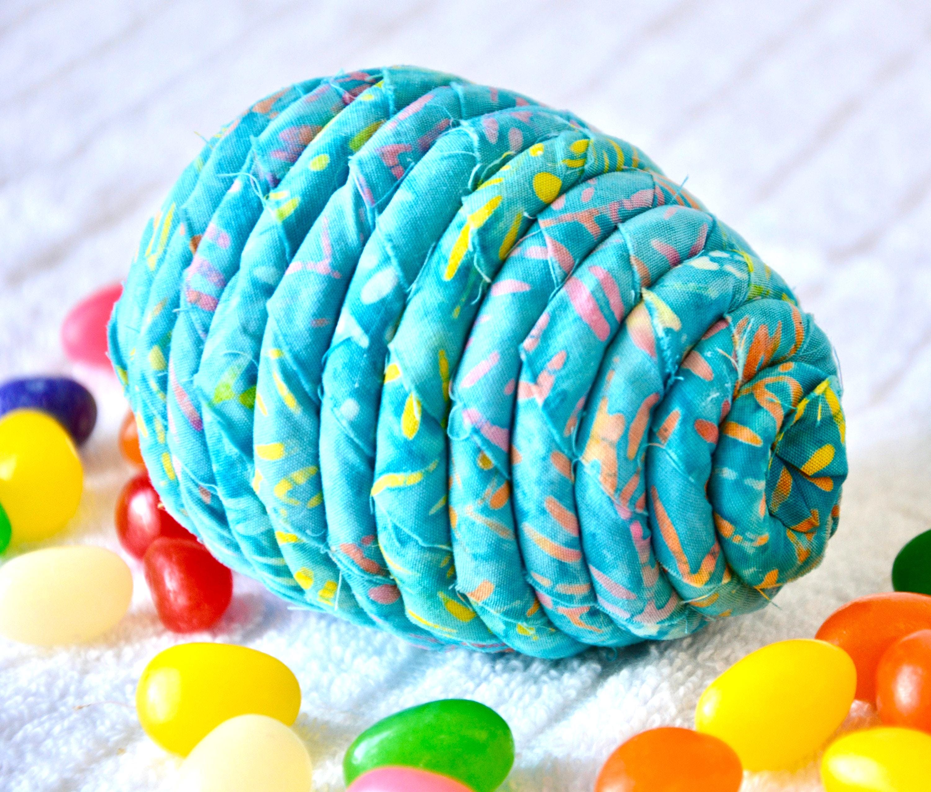 I hand wrapped this gorgeous blue batik fabric around cotton line which I than hand coiled into an Easter Egg shape. The fabric edge is unfinished with some fray for a lovely shabby chic texture.